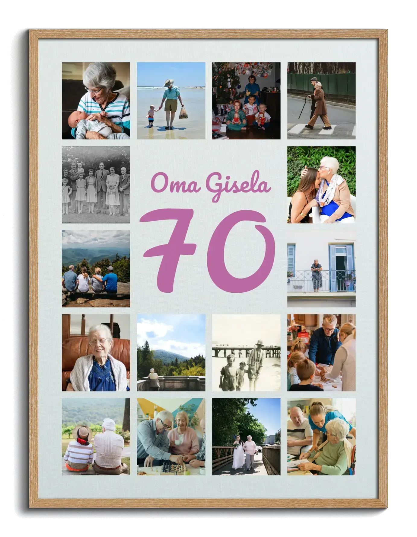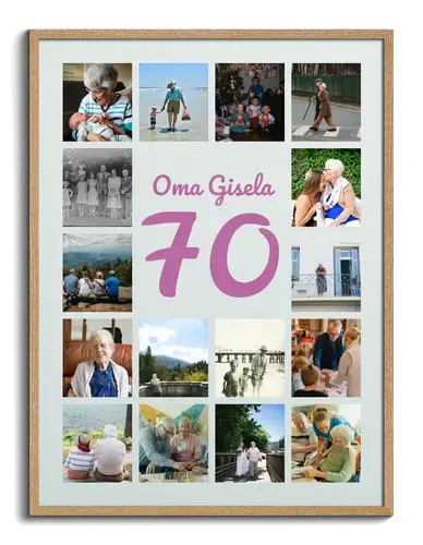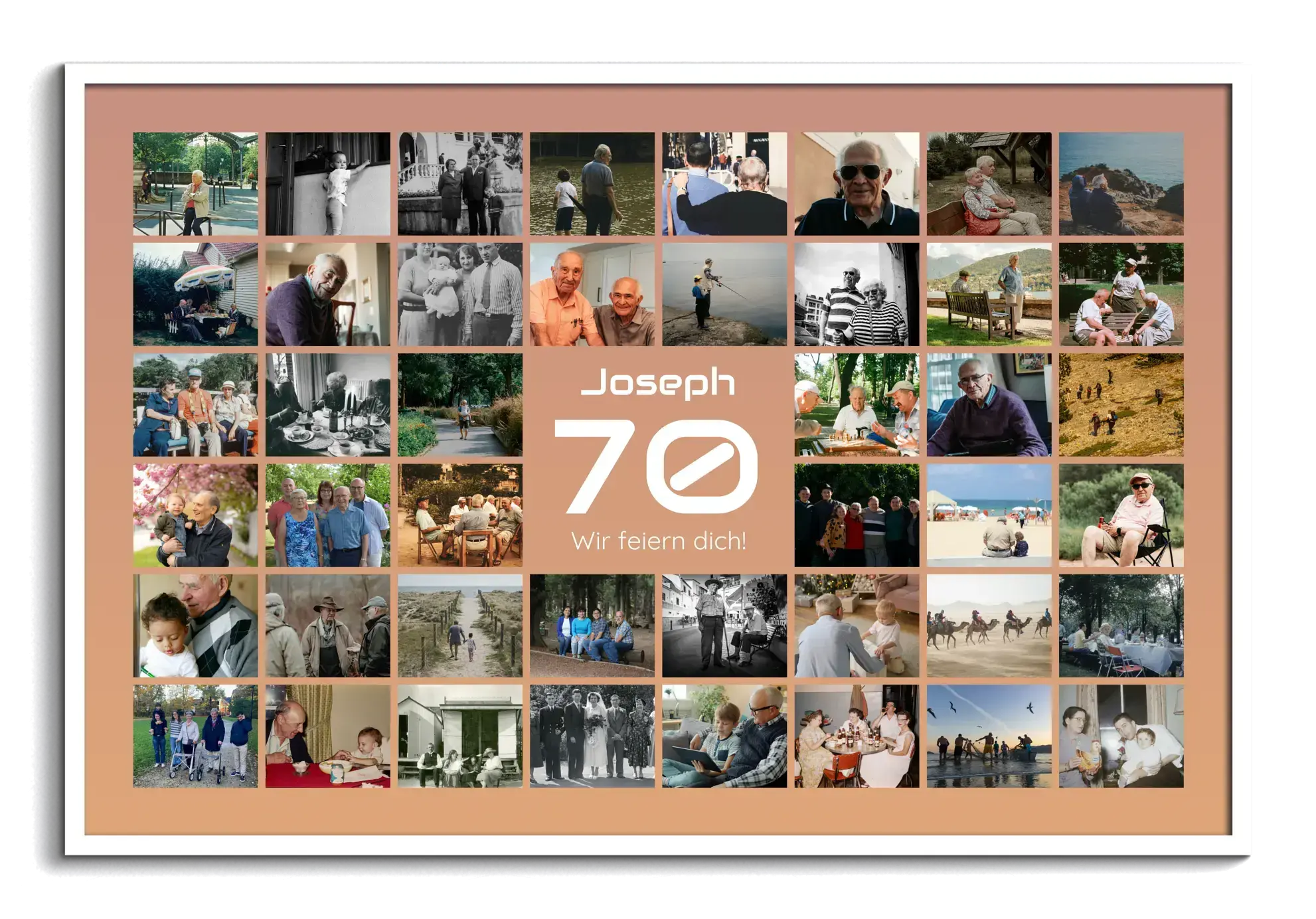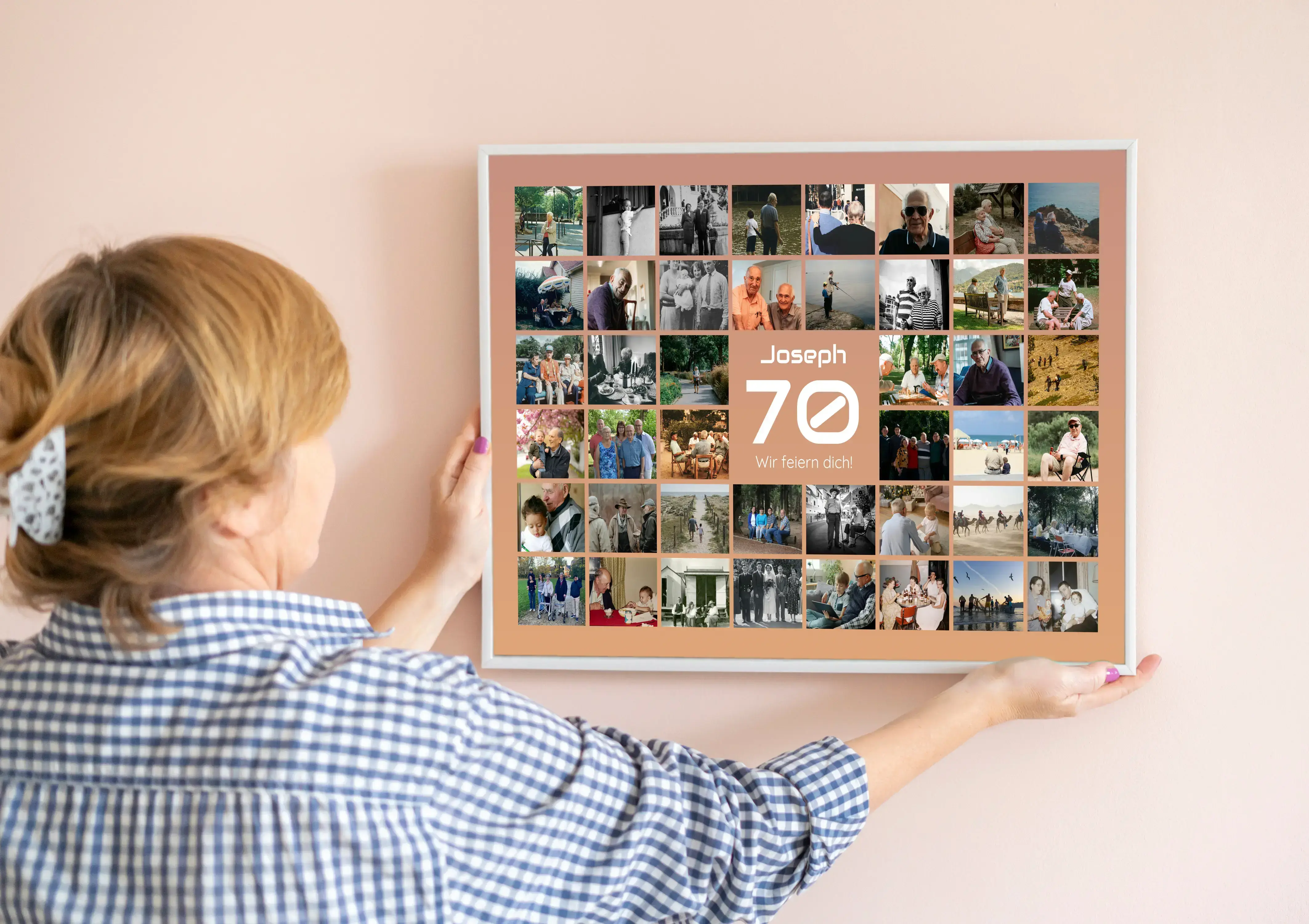 Zahl-Collage 70 – mit Name, Gruß & 20–80 Fotos im Raster. Für 70. Geburtstag oder Firmenjubiläum.