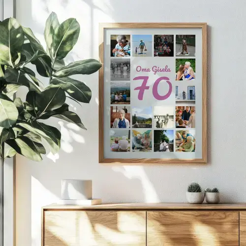 Gestalte jetzt deine Jubiläums-Zahlen-Collage 70! Im Mittelpunkt steht eine große 70, darüber der Name und darunter ein Grußtext, umrahmt von 20–80 deiner Fotos in einem klaren Raster. Zahl, Name, Worte, Bildanzahl, Hintergrund und Farben sind frei wählbar, ebenso Hoch- oder Querformat – perfekt zum 70. Geburtstag, zur Gnadenhochzeit oder zum 70-jährigen Firmenjubiläum.