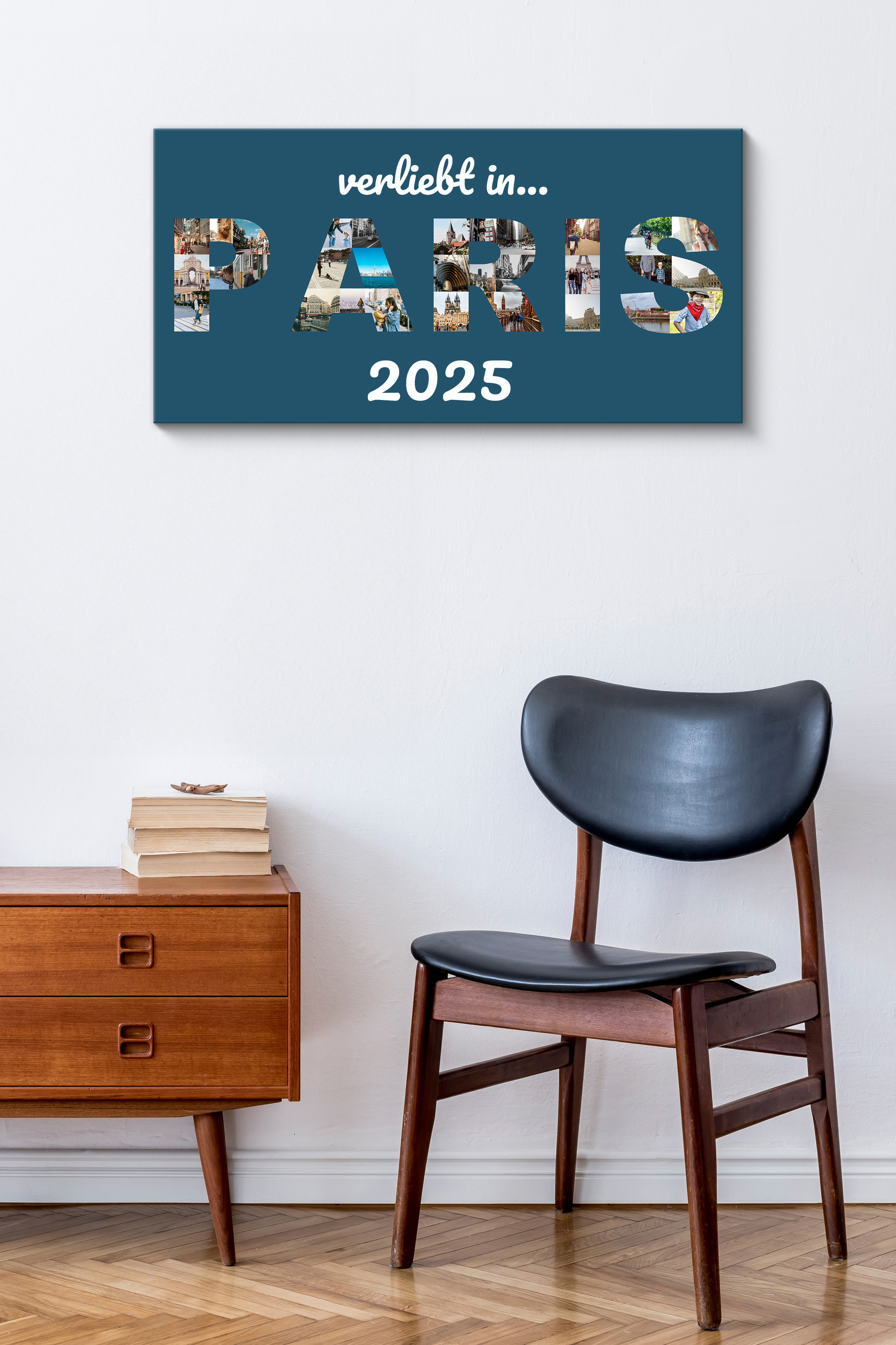 Jetzt gestalten und deine Reise festhalten: Diese Buchstabencollage zeigt den Ortsnamen Paris als Textform, gefüllt mit Urlaubsfotos, auf Leinwand mit dunkelblauem Hintergrund. Ergänze den Zusatz verliebt in und die Jahreszahl – ideal für Reisefans, Paare oder Familien und als stilvolles Wohn-Highlight.