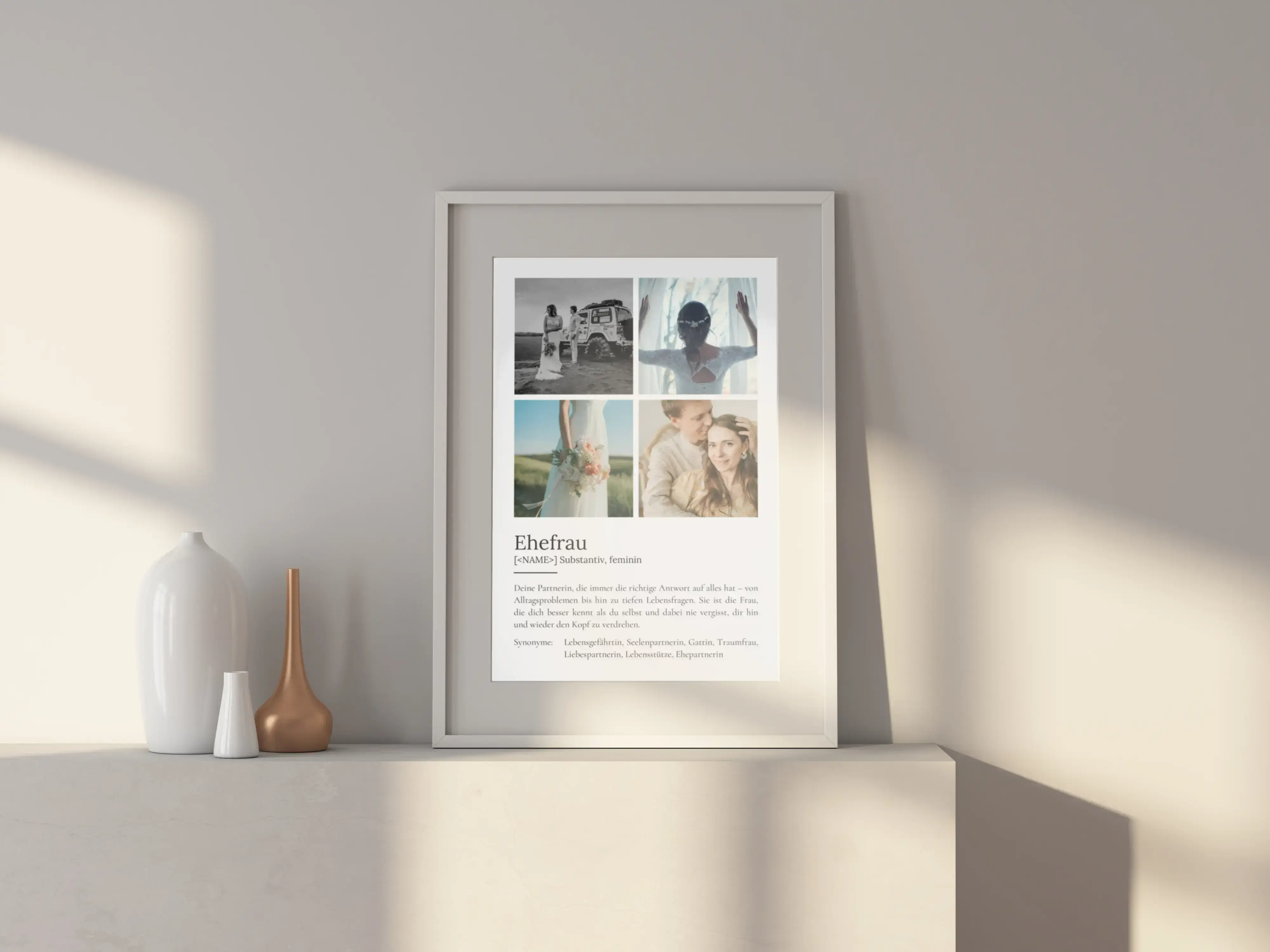 Unser Definitions-Poster Ehefrau im Duden-Stil funktioniert ganz einfach: Du wählst eine Vorlage aus, lädst ein persönliches Foto hoch und bearbeitest den Text unter dem Foto. Du kannst die vorgegebene Definition „Deine Partnerin, die immer die richtige Antwort auf alles hat – von Alltagsproblemen bis hin zu tiefen Lebensfragen. Sie ist die Frau, die dich besser kennt als du selbst und dabei nie vergisst, dir hin und wieder den Kopf zu verdrehen.“ nach Belieben anpassen oder komplett neu gestalten.