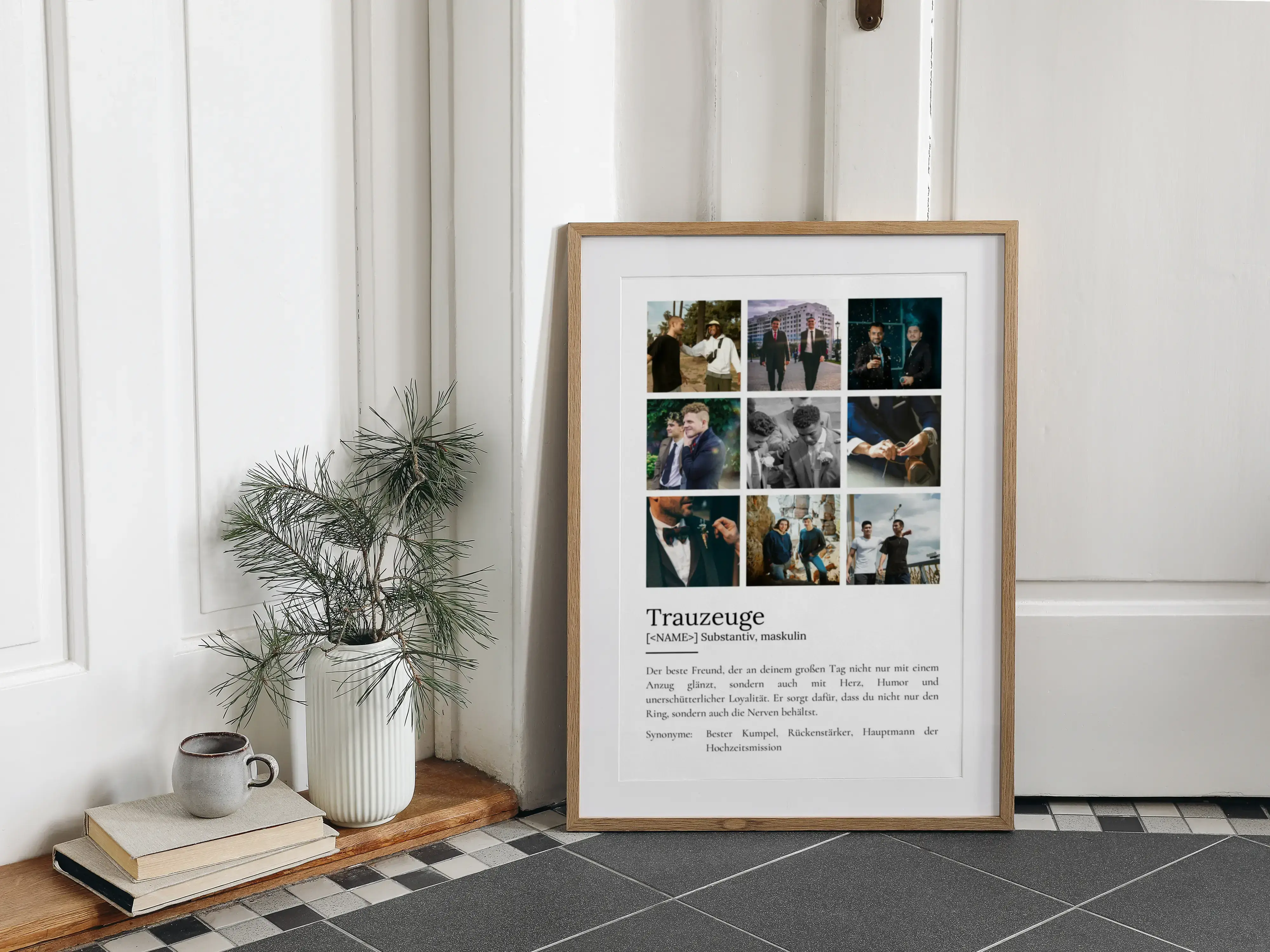 Erstelle jetzt dein personalisiertes Definitions-Poster für den Trauzeugen im Duden-Stil! Dieses einzigartige Geschenk wird mit einem individuellen Foto und personalisiertem Text zu etwas ganz Besonderem. Der Beispieltext lautet: "Der beste Freund, der an deinem großen Tag nicht nur mit einem Anzug glänzt, sondern auch mit Herz, Humor und unerschütterlicher Loyalität. Er sorgt dafür, dass du nicht nur den Ring, sondern auch die Nerven behältst."