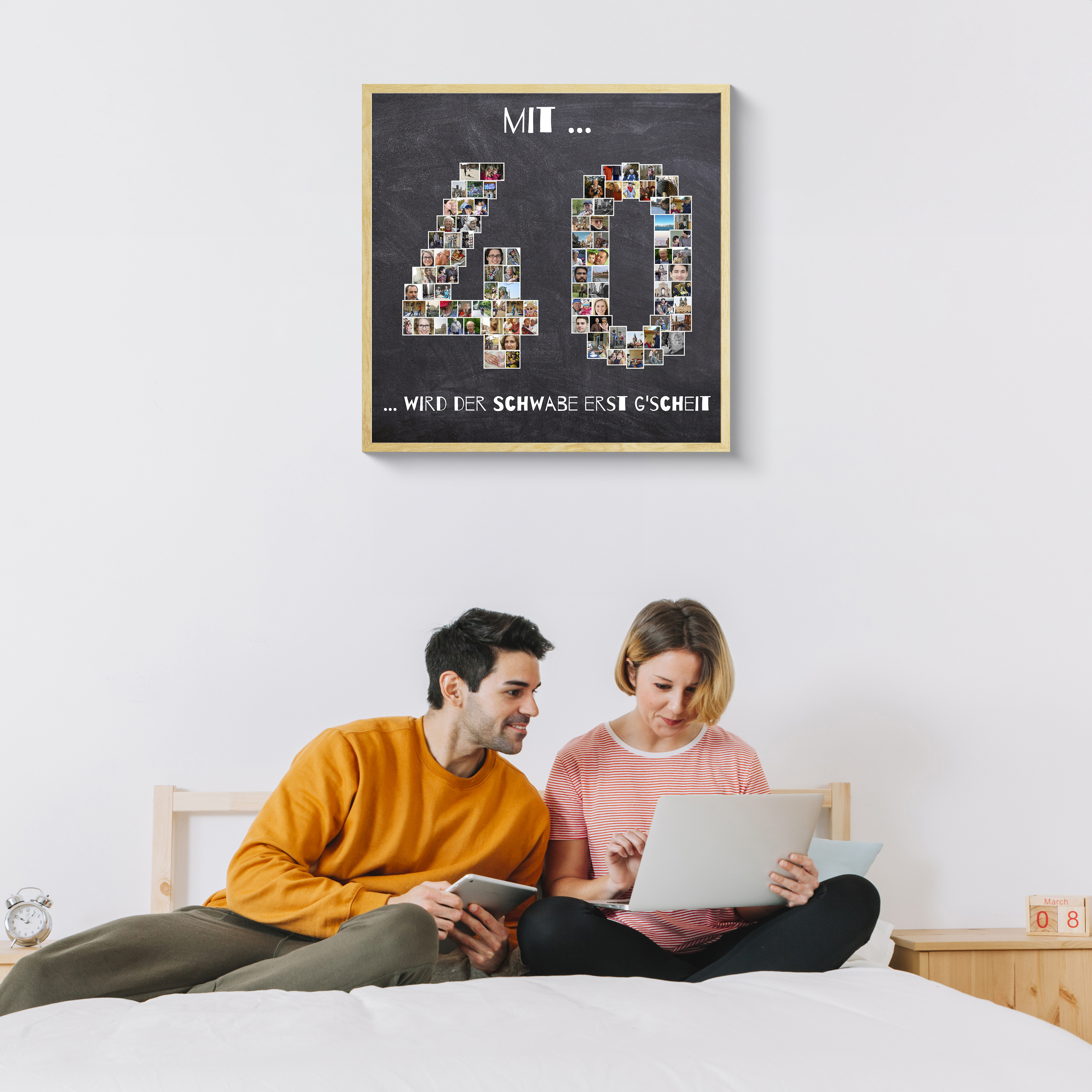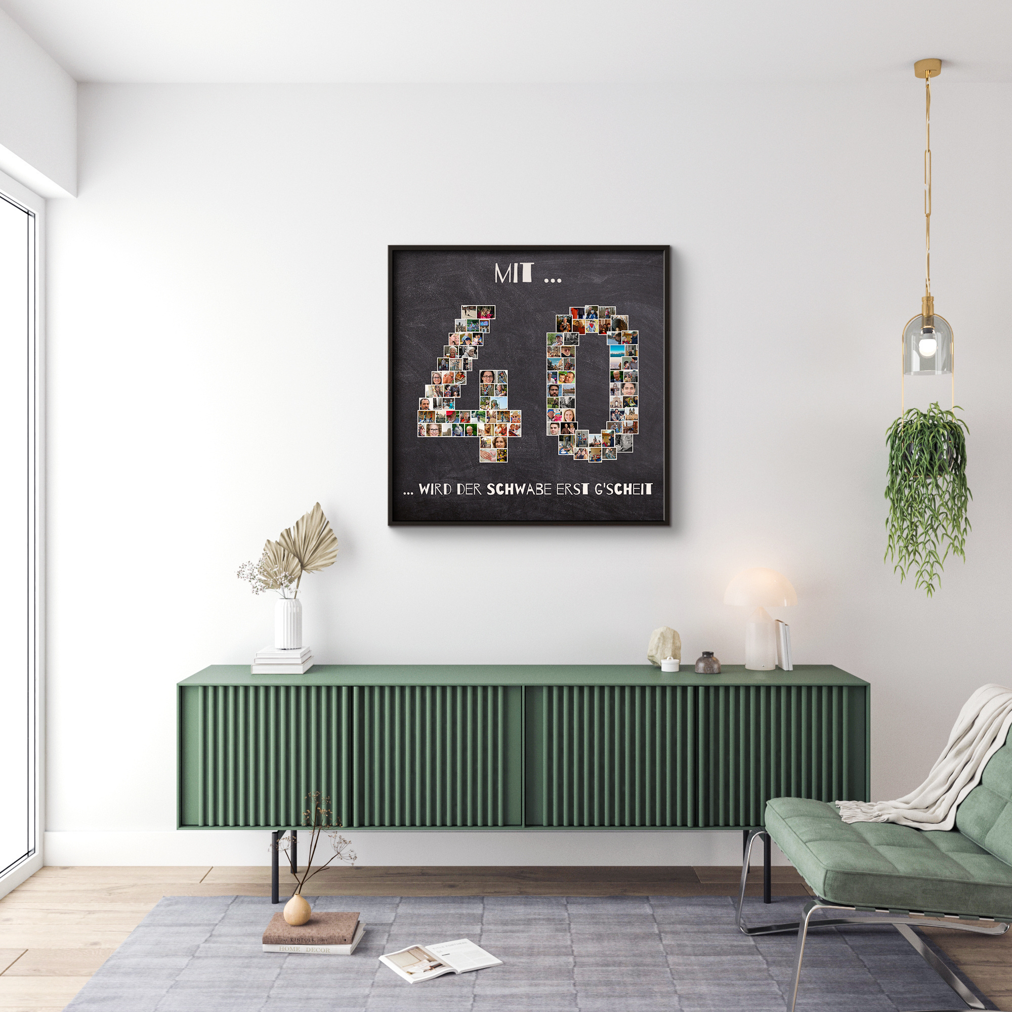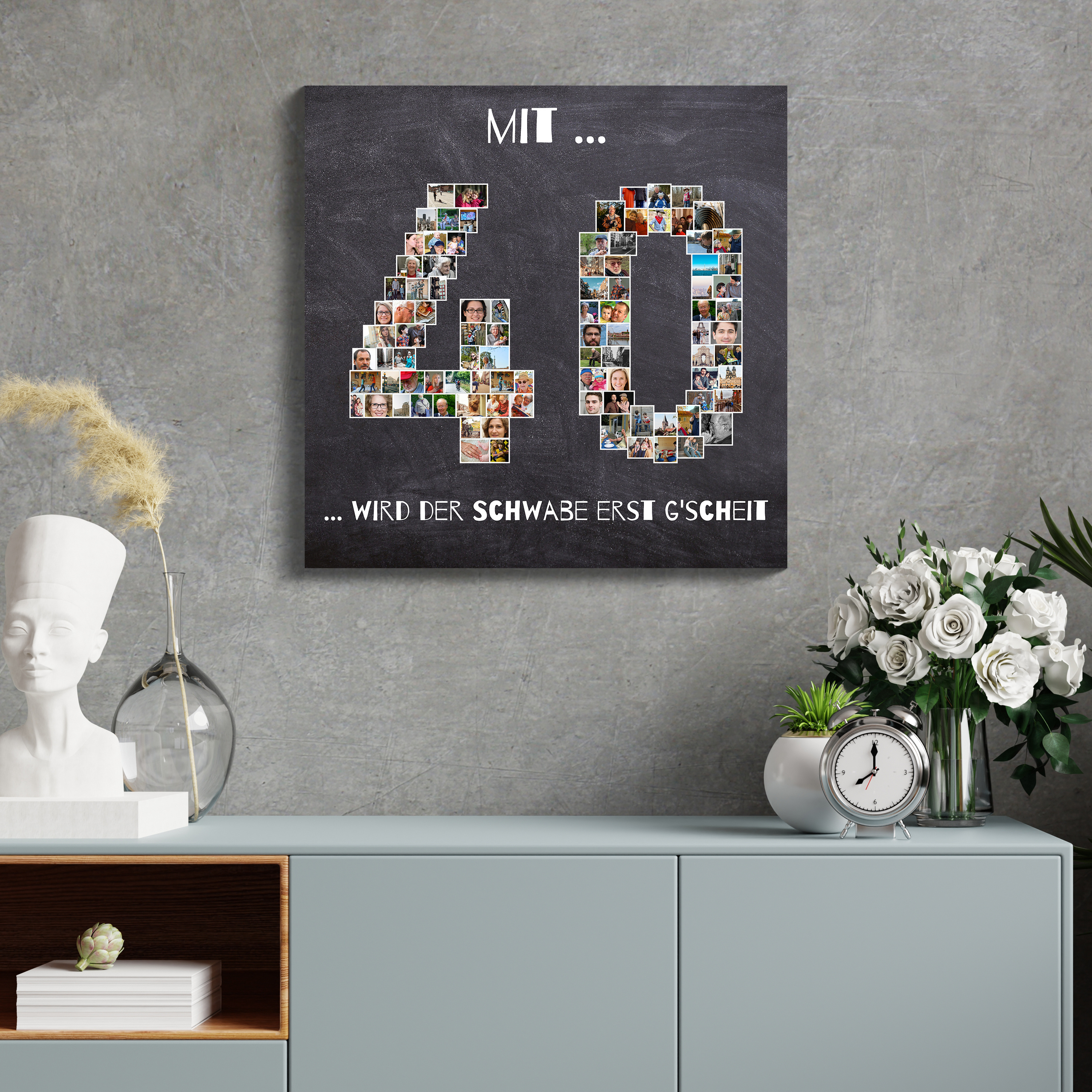 Gestalte deine persönliche Geburtstagsüberraschung mit unserer einzigartigen Fotocollage im Design einer großen Zahl, wie zum Beispiel "40", die aus vielen kleinen Fotos besteht. Individualisiere sie durch eigene Bilder und einen humorvollen Spruch – perfekt als originelles Geschenk oder als Hingucker auf der Party des Lebens.