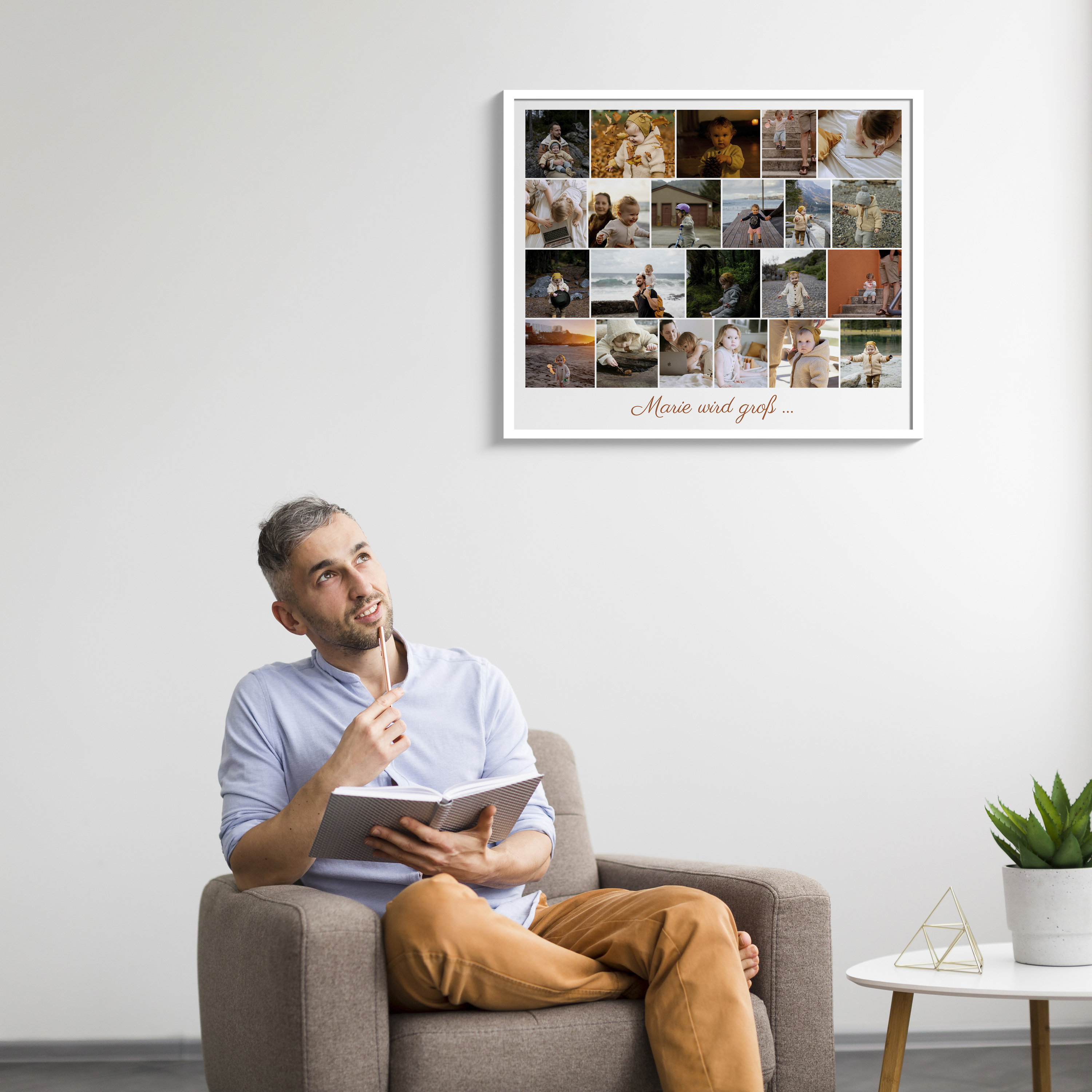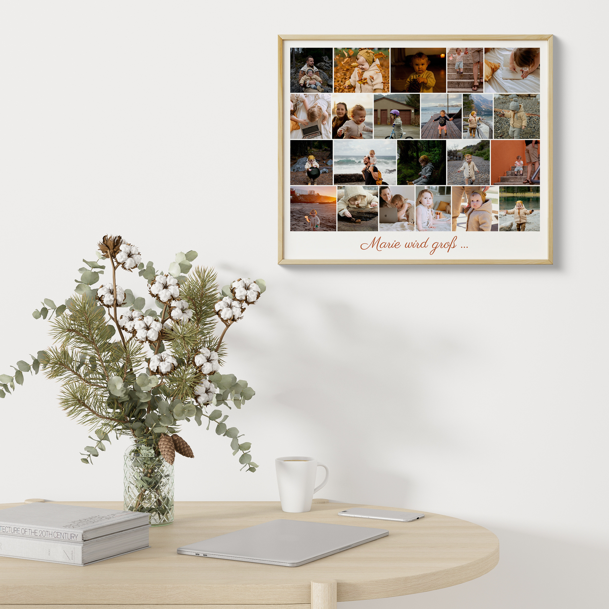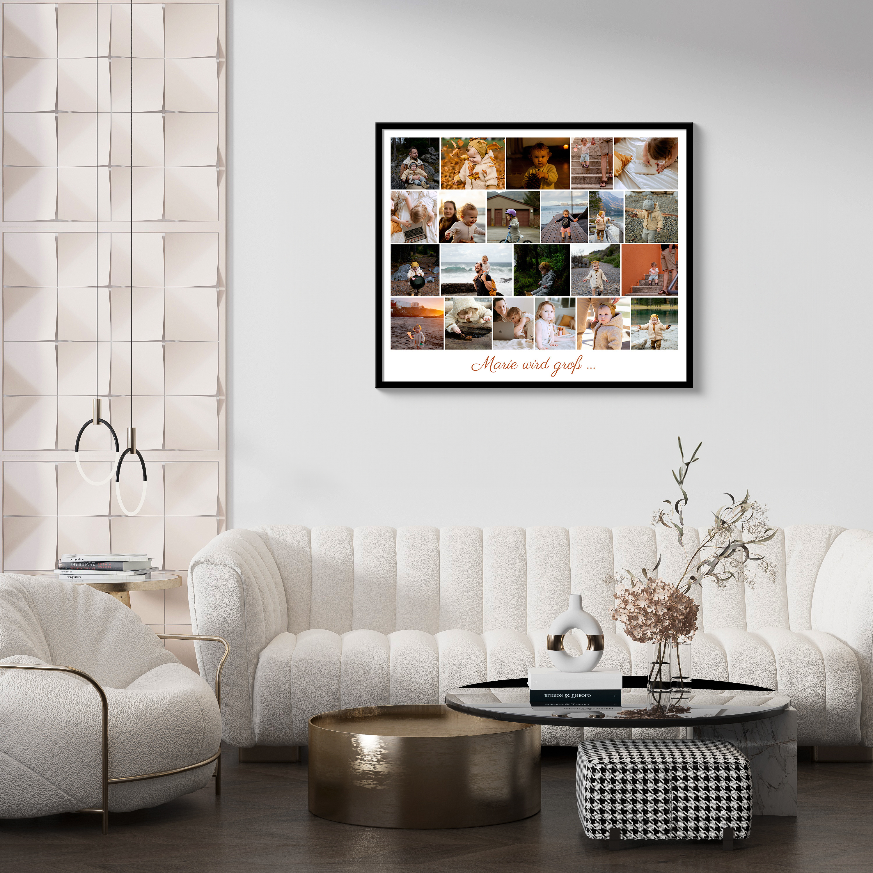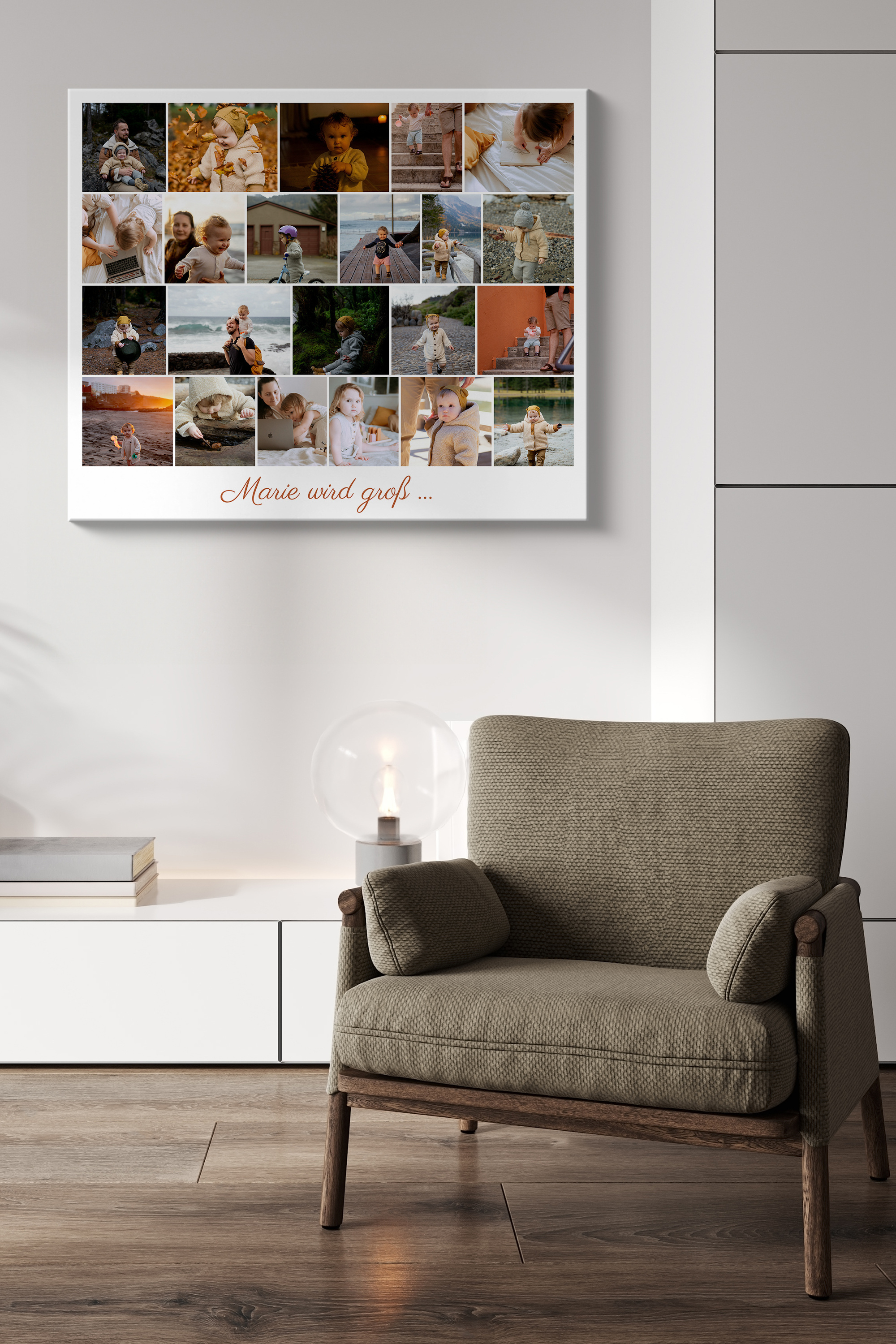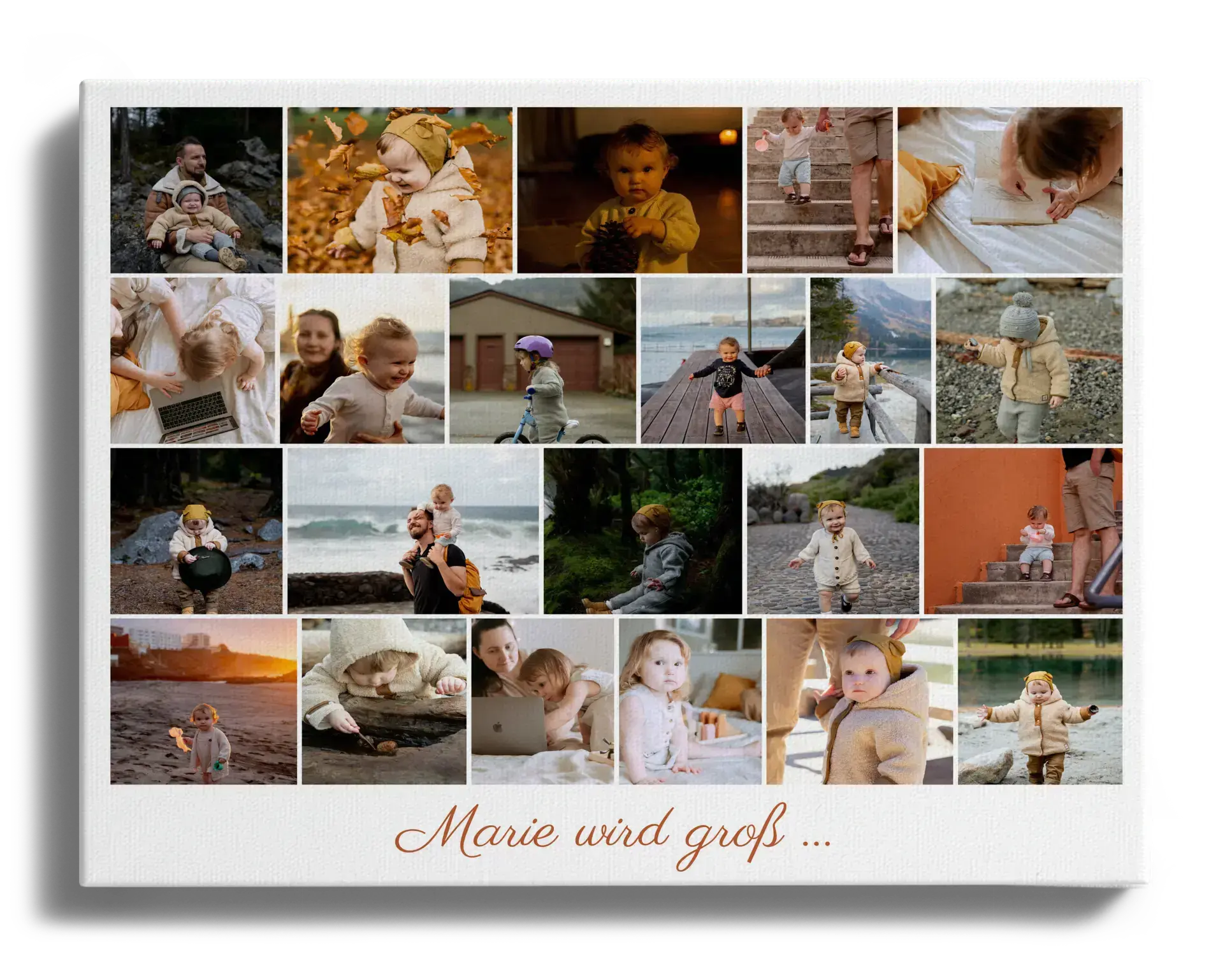 Erstelle jetzt eine einzigartige Fotocollage als besonderen Blickfang für dein Zuhause. Mit deinem eigenen Kind als Hauptdarstellerin kannst du eine eindrucksvolle Bildersammlung aus Momenten über die Jahre hinweg gestalten. Wähle zwischen 5 und 160 Bildern und ergänze sie mit einem personalisierten Spruch wie „Marie wird groß“. Mit deinen Lieblingsbildern und Texten hast du die Möglichkeit, besondere Momente zu würdigen und eine individuelle Collage zu erschaffen, die deine schönsten Erinnerungen festhält.