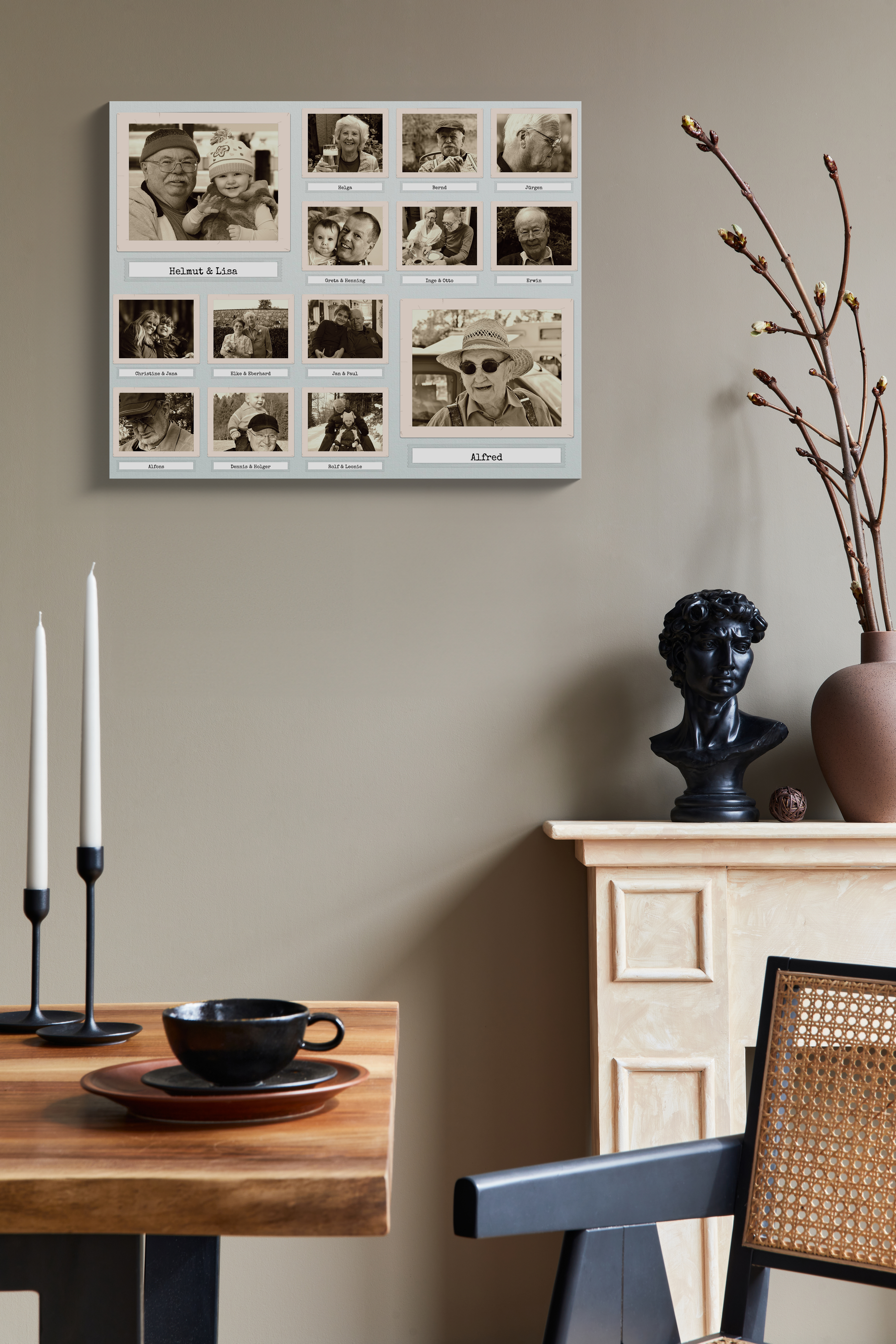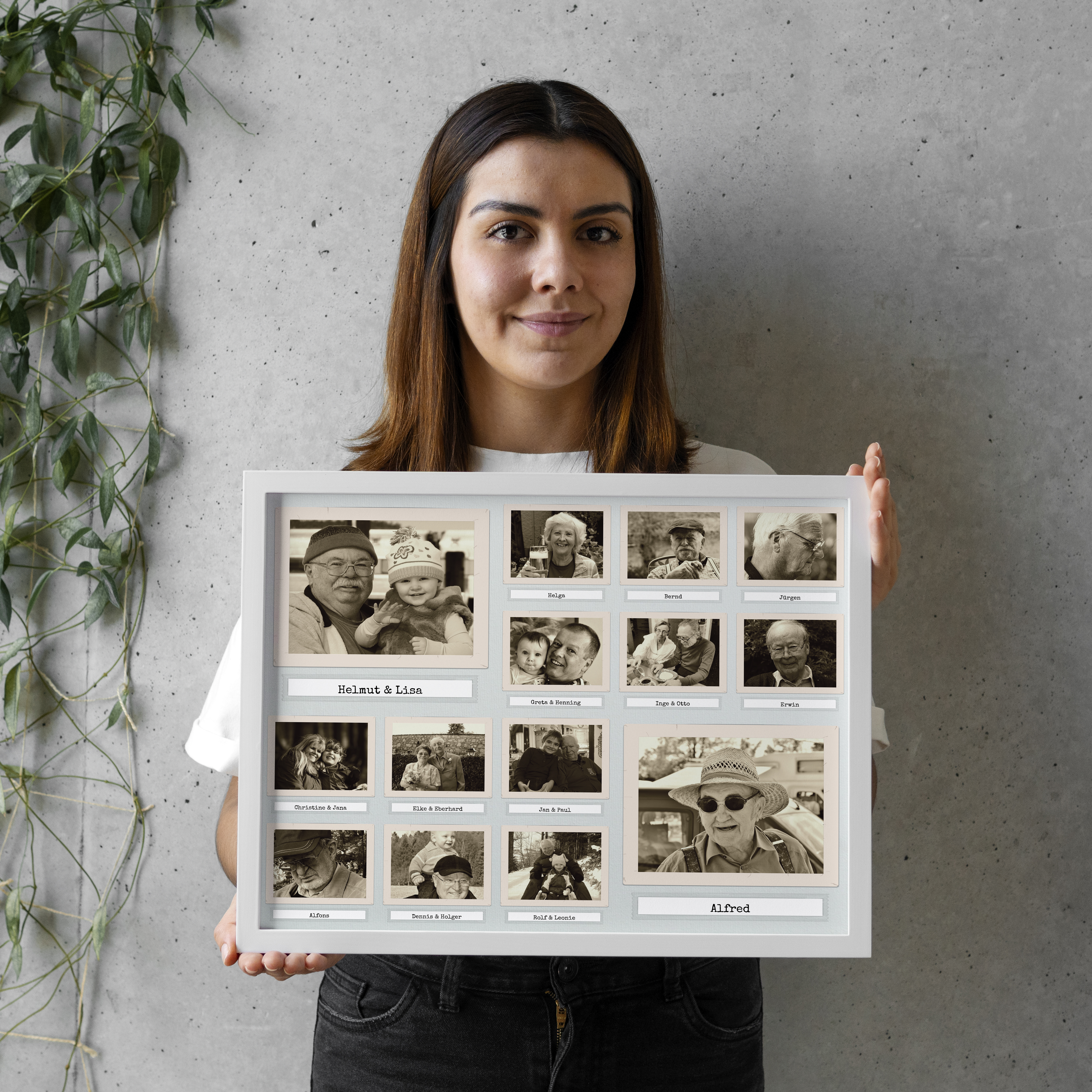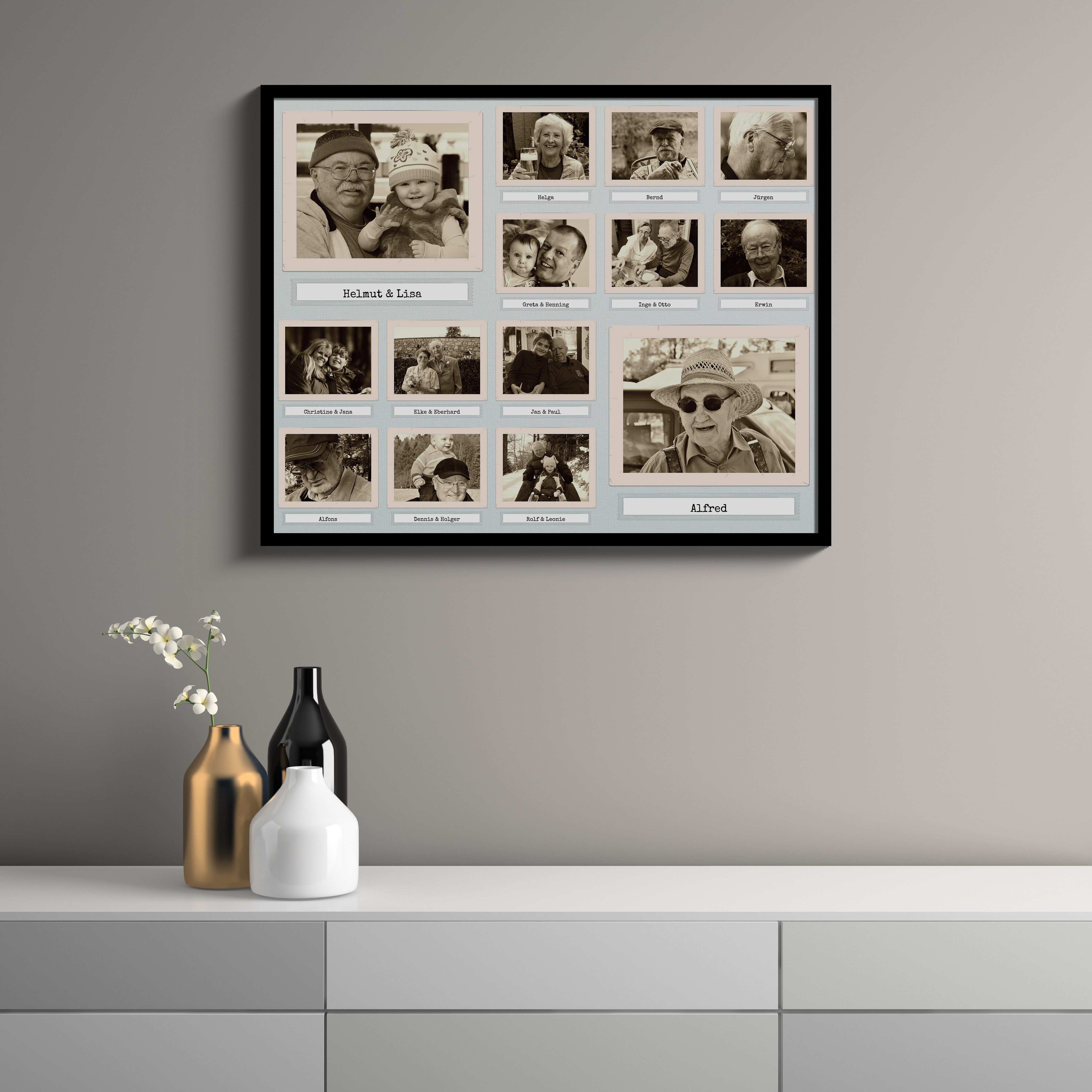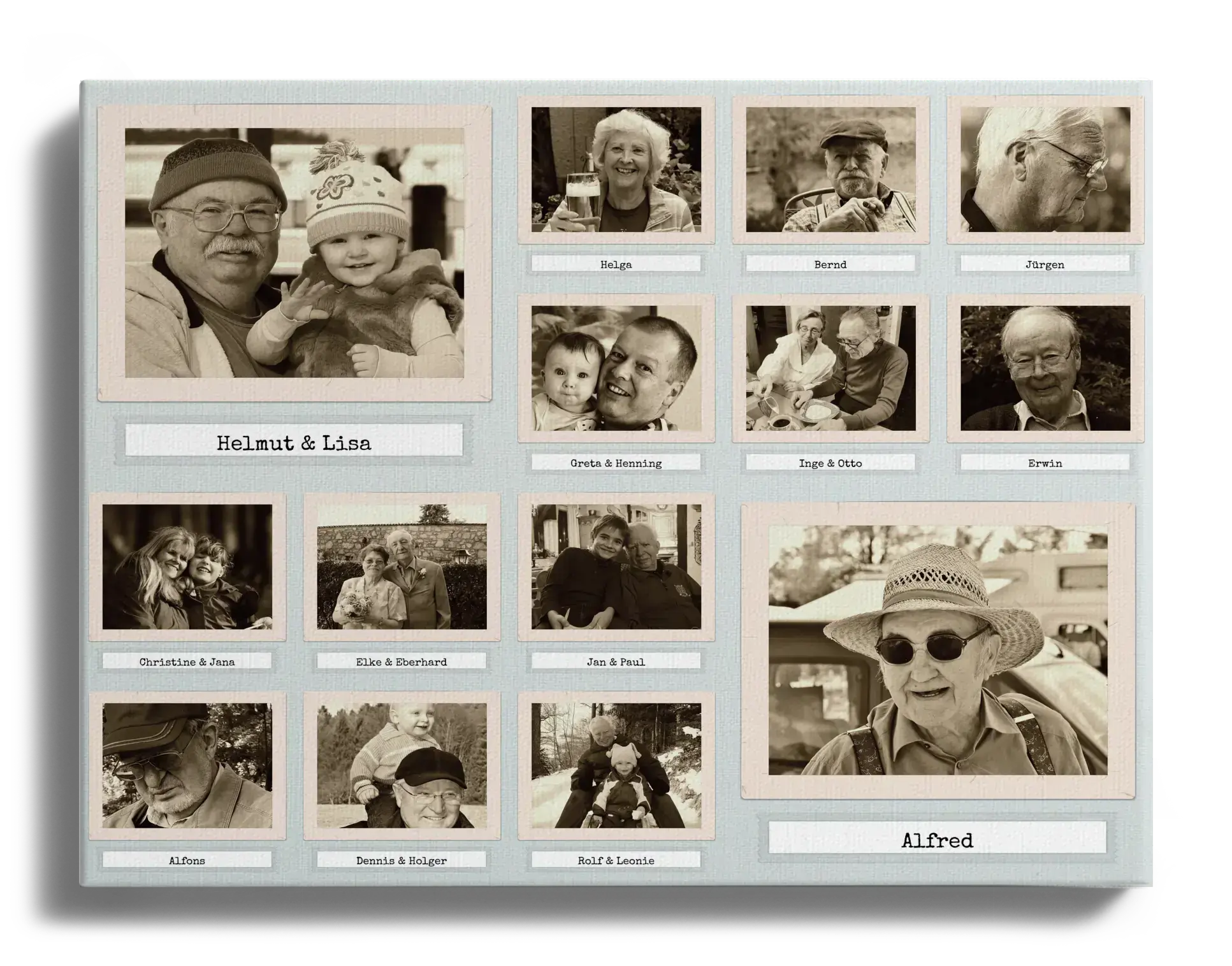 Fotocollagen im Retro-Stil: 14 individuelle Fotos in Sepia, 40x50cm Format.