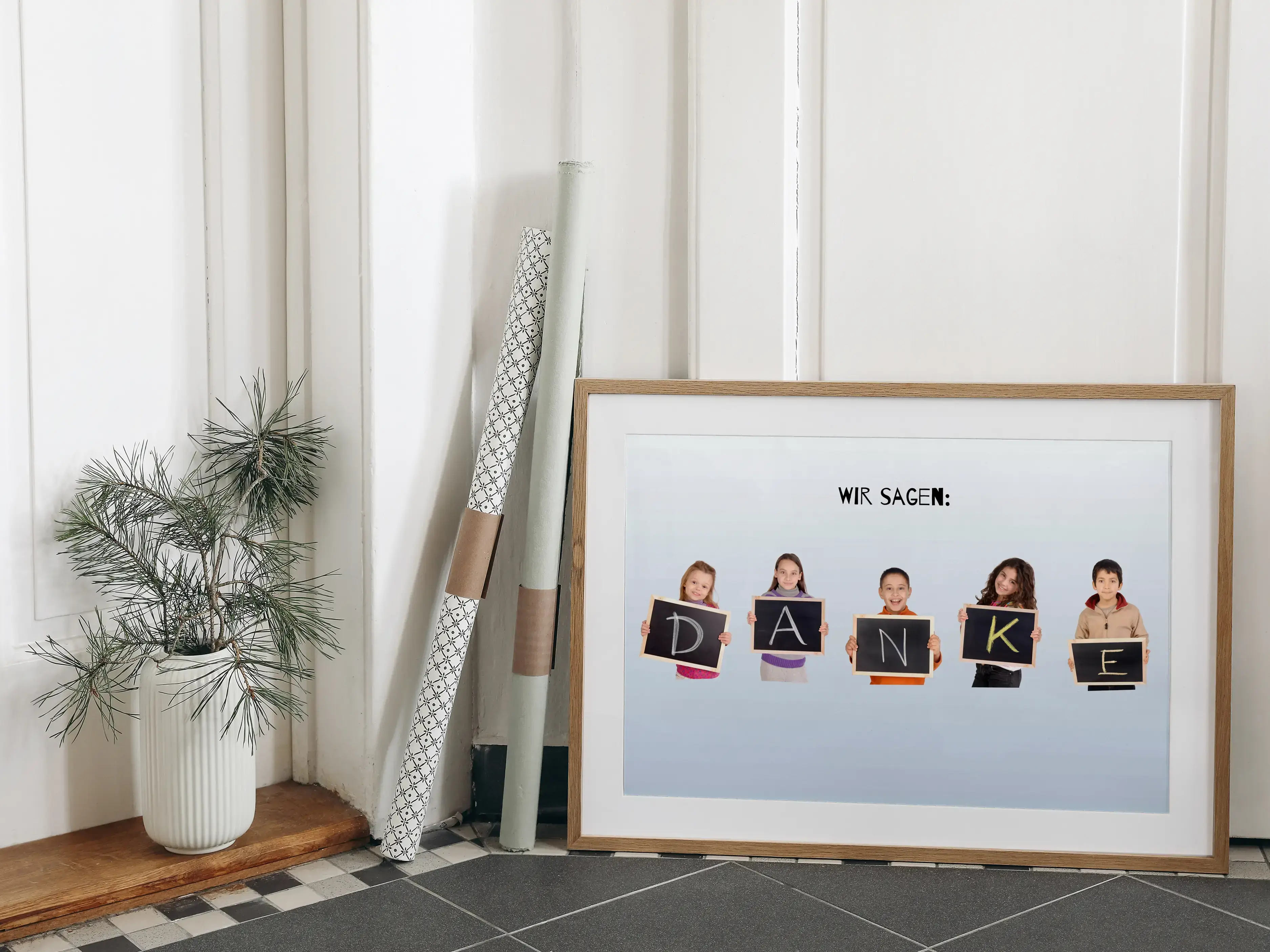 Jetzt ist der perfekte Moment, deine Erinnerungen in eine wundervolle Fotocollage zu verwandeln! Unsere personalisierbare Collage ist ideal zum Bedanken bei Lehrern: Schulkinder mit Tafeln bilden gemeinsam das Wort DANKE. Ergänze die Collage mit dem Spruch „Wir sagen Danke“ und schaffe ein persönliches Geschenk oder eine bleibende Erinnerung im Klassenzimmer. Farben, Fotos, Schriftarten und Layout kannst du ganz nach deinem Geschmack wählen.