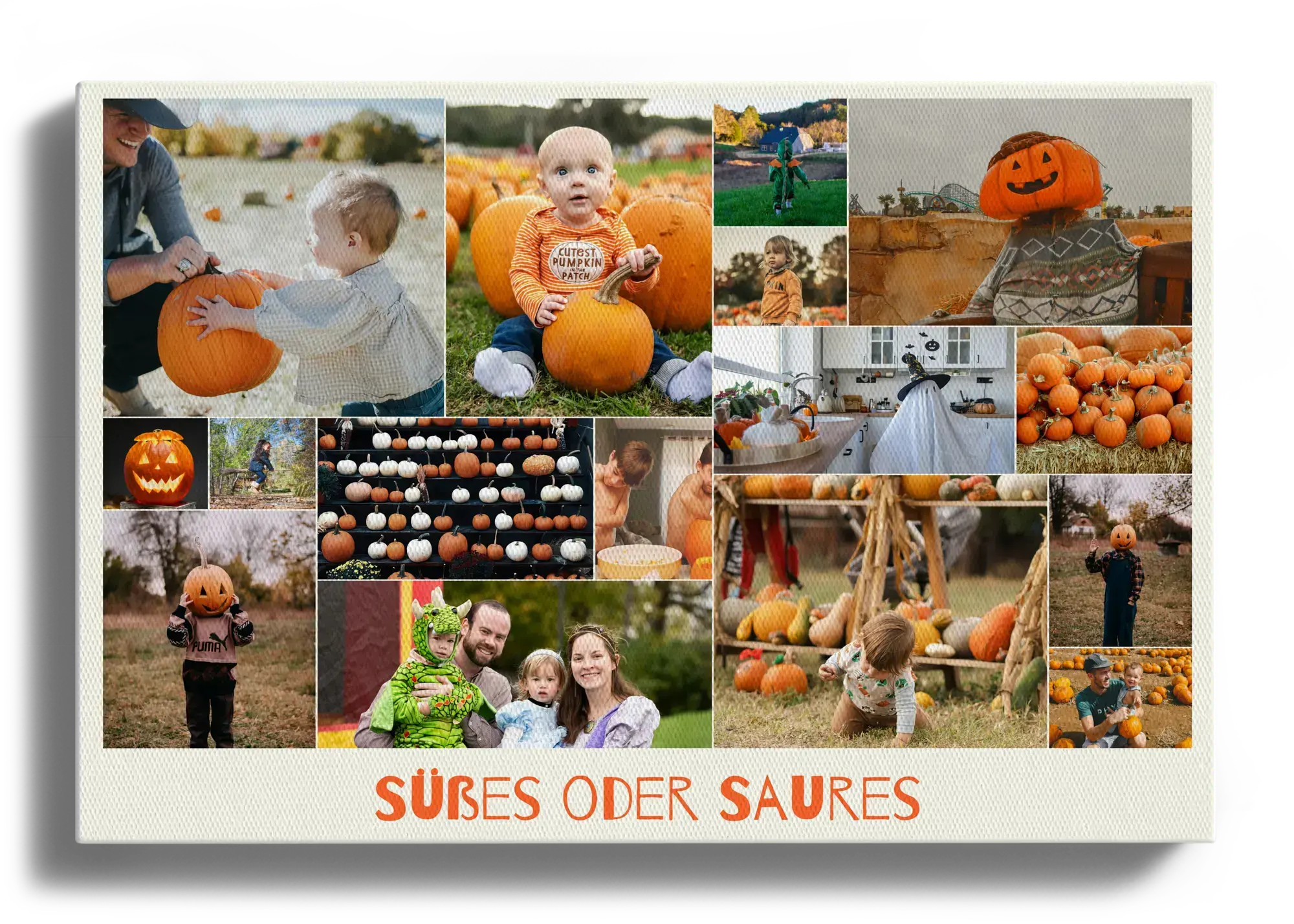 Halloween-Fotos in kreativen Collagen, mit Texten wie "Süßes oder Saures" individuell gestalten.