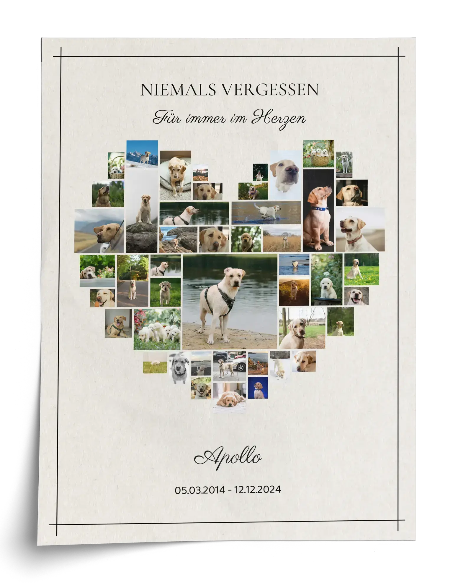 Fotocollage in Hunde-Silhouette zum Gedenken – mit Fotos, Name, Jahren und optionalem Text.