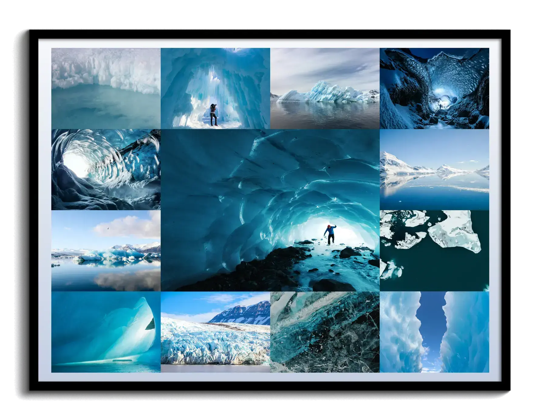 Erstelle jetzt deine persönliche Natur-Collage. In diesem Beispiel stehen besondere Naturphänomene im Mittelpunkt: weitläufige Wüstenlandschaften mit sanft geformten Dünen, kristallblaue Gletscher und geheimnisvolle Eishöhlen. Mit hochwertigen Vorlagen und Premiumdruck bringst du diese Motive wirkungsvoll an die Wand.