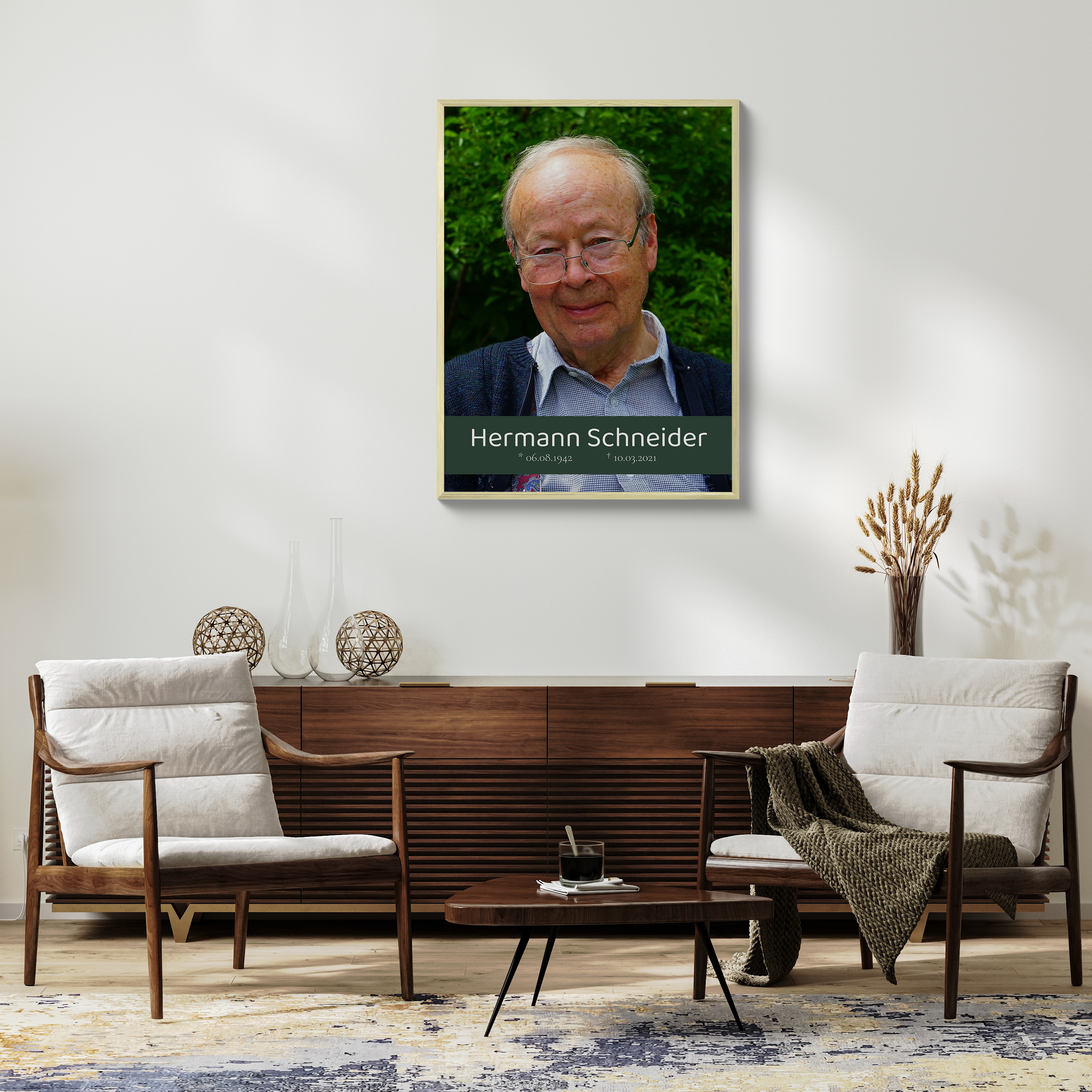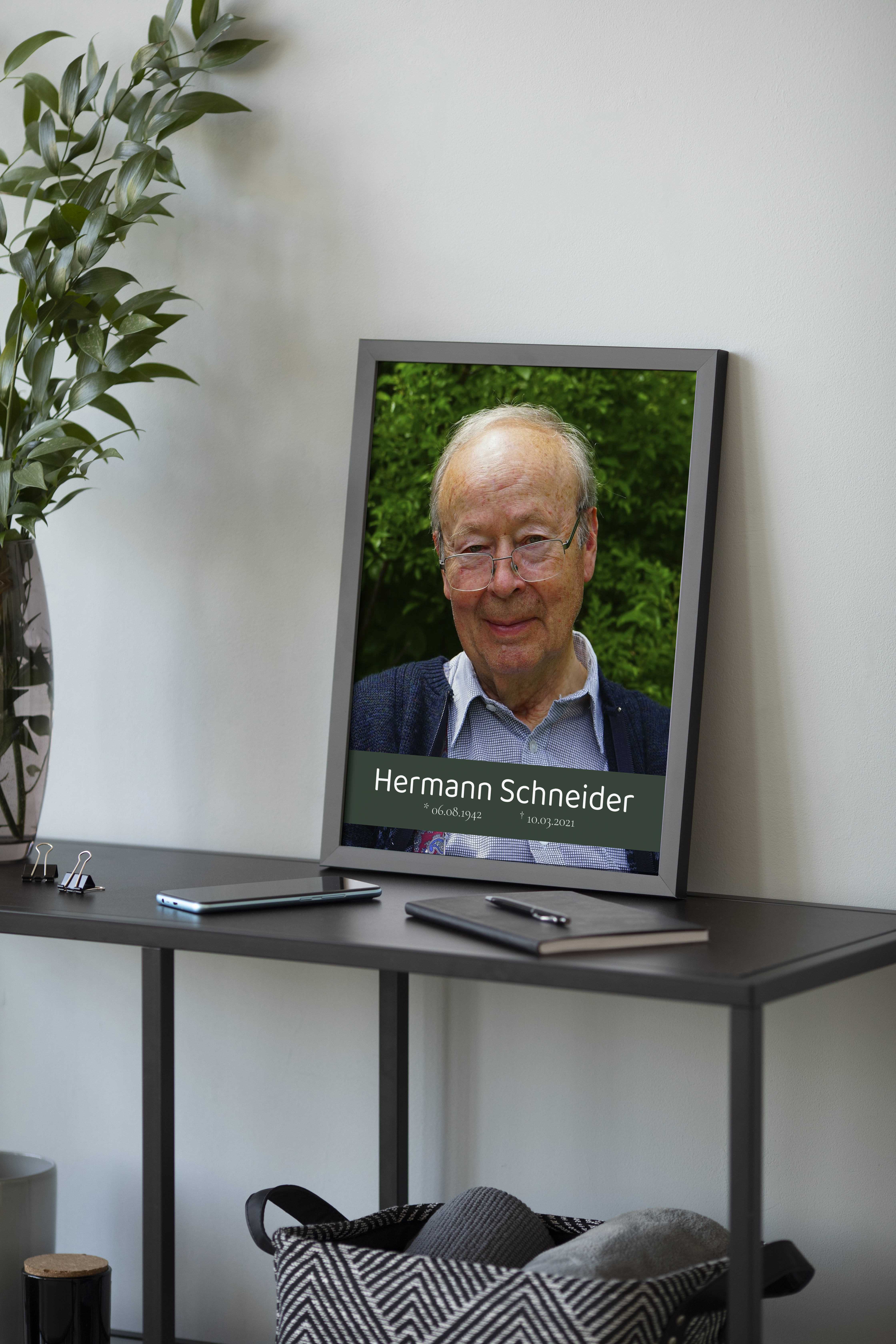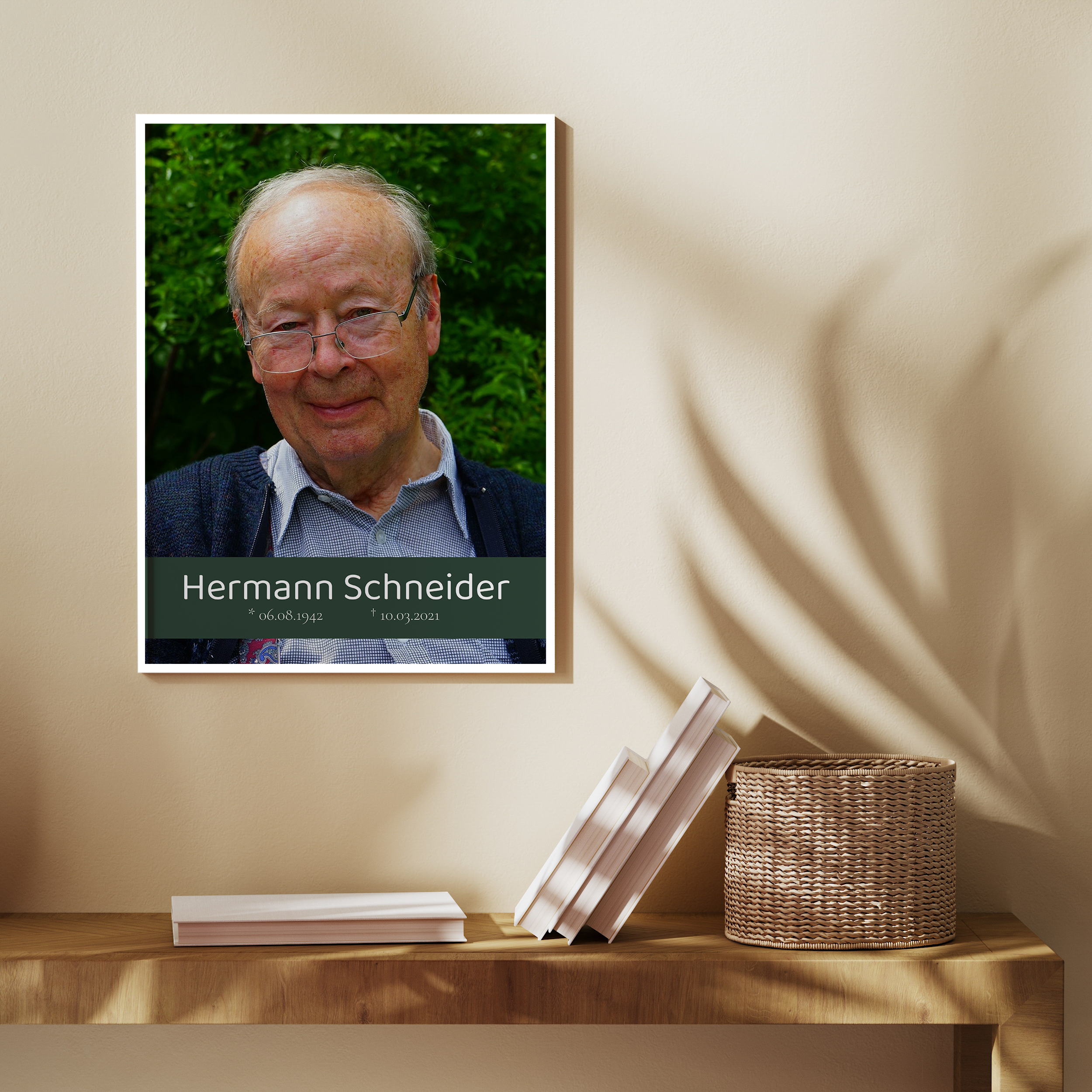 Erstelle dein persönliches Trauerfoto im Format 30x40cm mit dunklem Textbanner. Mit dieser Fotocollage kannst du auf individuelle Art und Weise an einen geliebten Menschen erinnern. Verwende ein ausdrucksstarkes Portrait und füge deinen Text auf dem dunkelgrünen Hintergrund hinzu.
