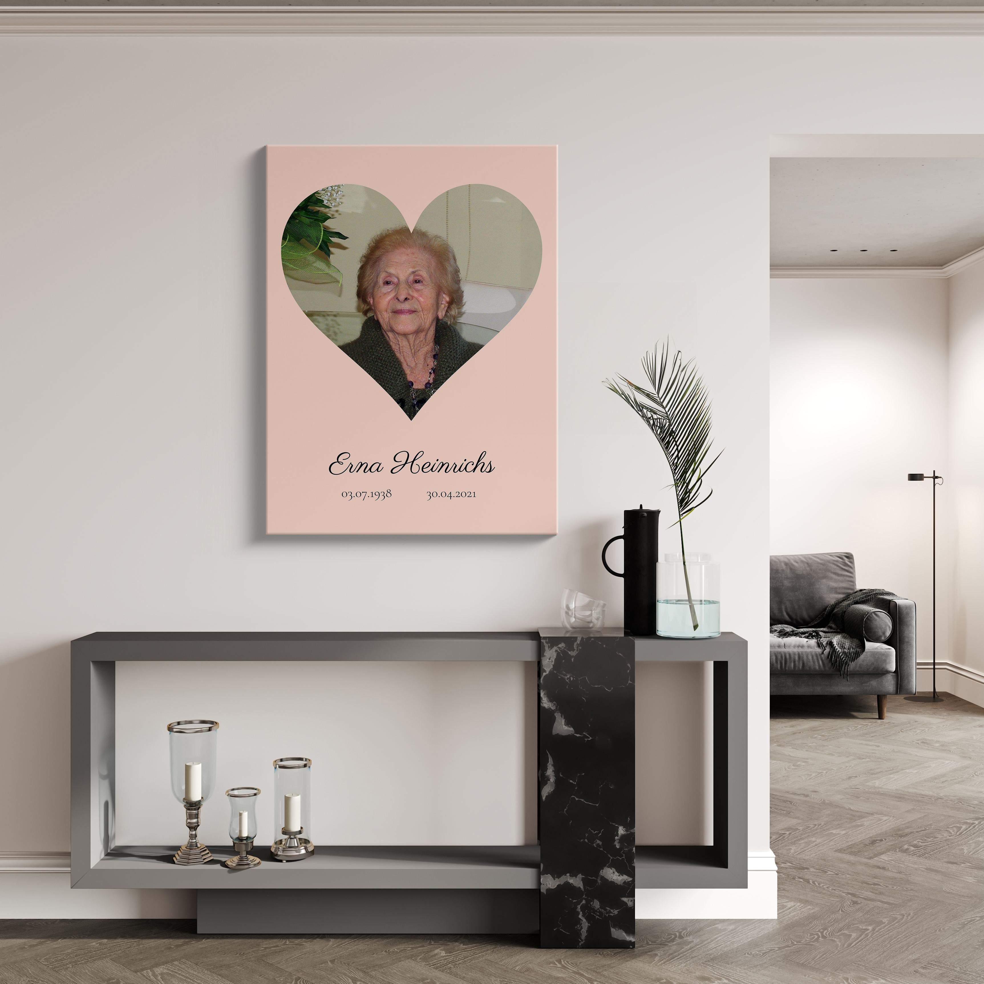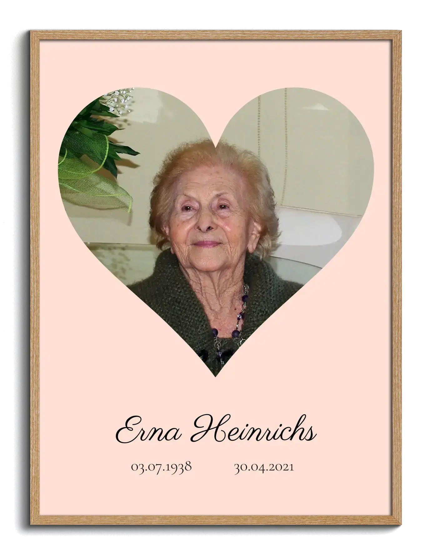 Erinnerung bewahren: Trauerfoto in Herzform, vielfältig personalisierbar, auf Poster gedruckt.