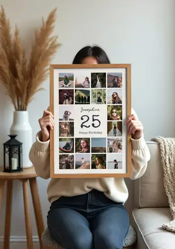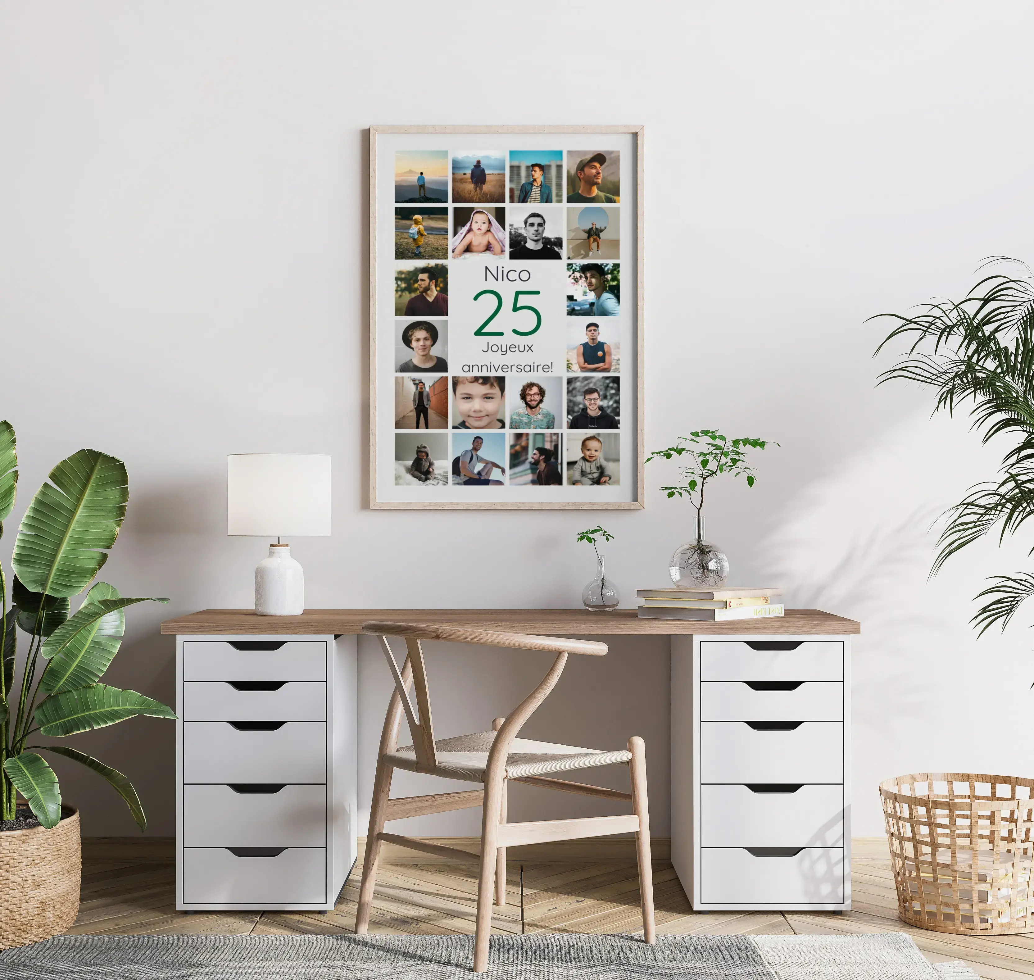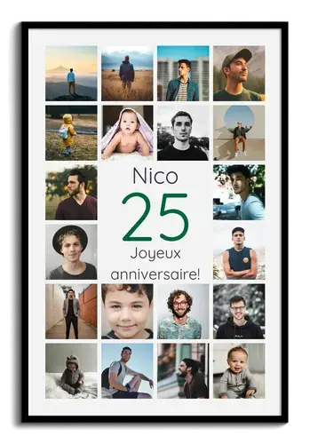 Créez votre affiche chiffre 25 personnalisée dès maintenant. Une grande 25 trône au centre, un nom en haut et un message en bas, entourés de 20 à 80 photos en grille. Personnalisez le chiffre, le nom, la dédicace, le nombre d’images, le fond, les couleurs et l’orientation. Parfait pour noces d’argent, 25e anniversaire ou 25 ans d’entreprise.