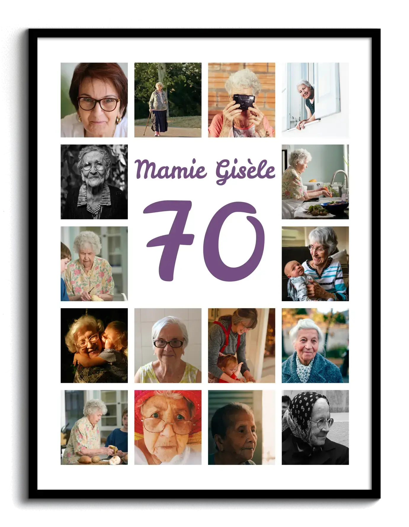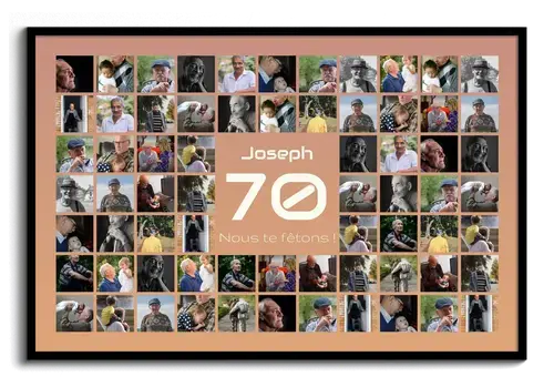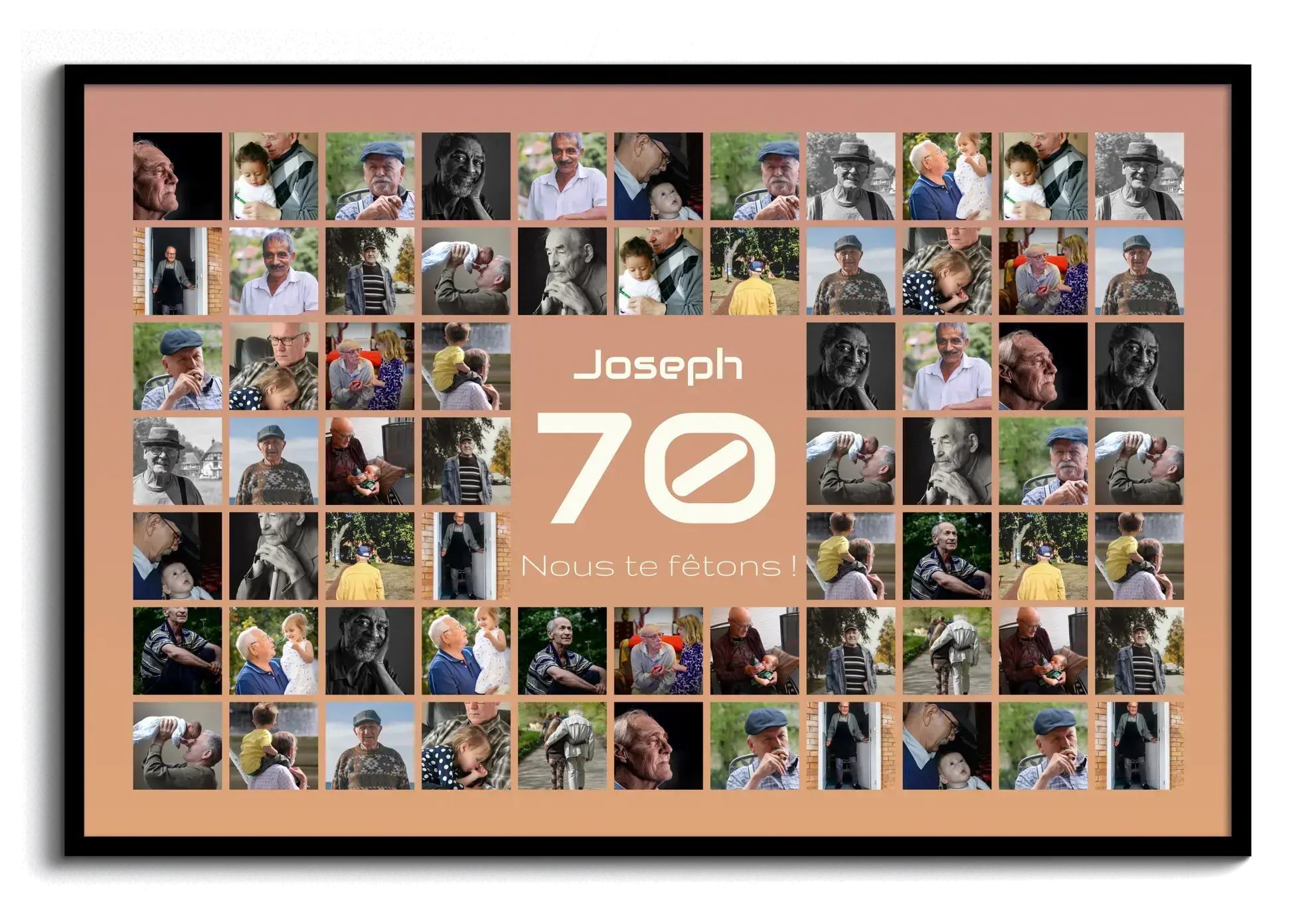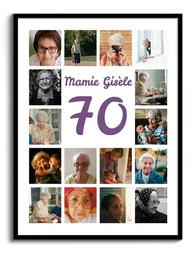 Créez maintenant une affiche anniversaire 70 personnalisée. La grande 70 trône au centre, le prénom au-dessus, un message en dessous, entourés de 20 à 80 photos en grille. Modifiez le chiffre, le nom, le texte, les couleurs, le fond et l’orientation pour un cadeau de 70 ans, noces de platine ou départ à la retraite.