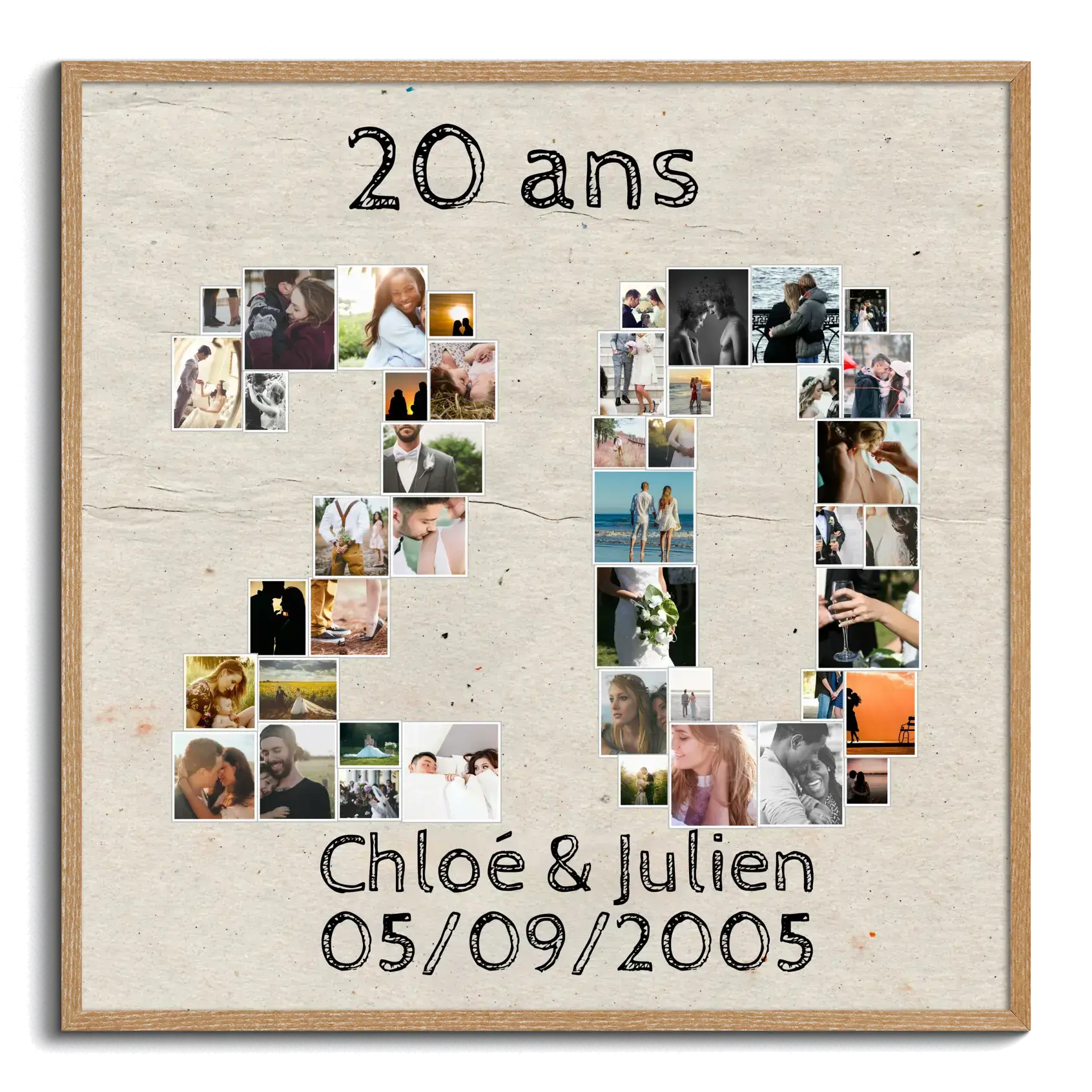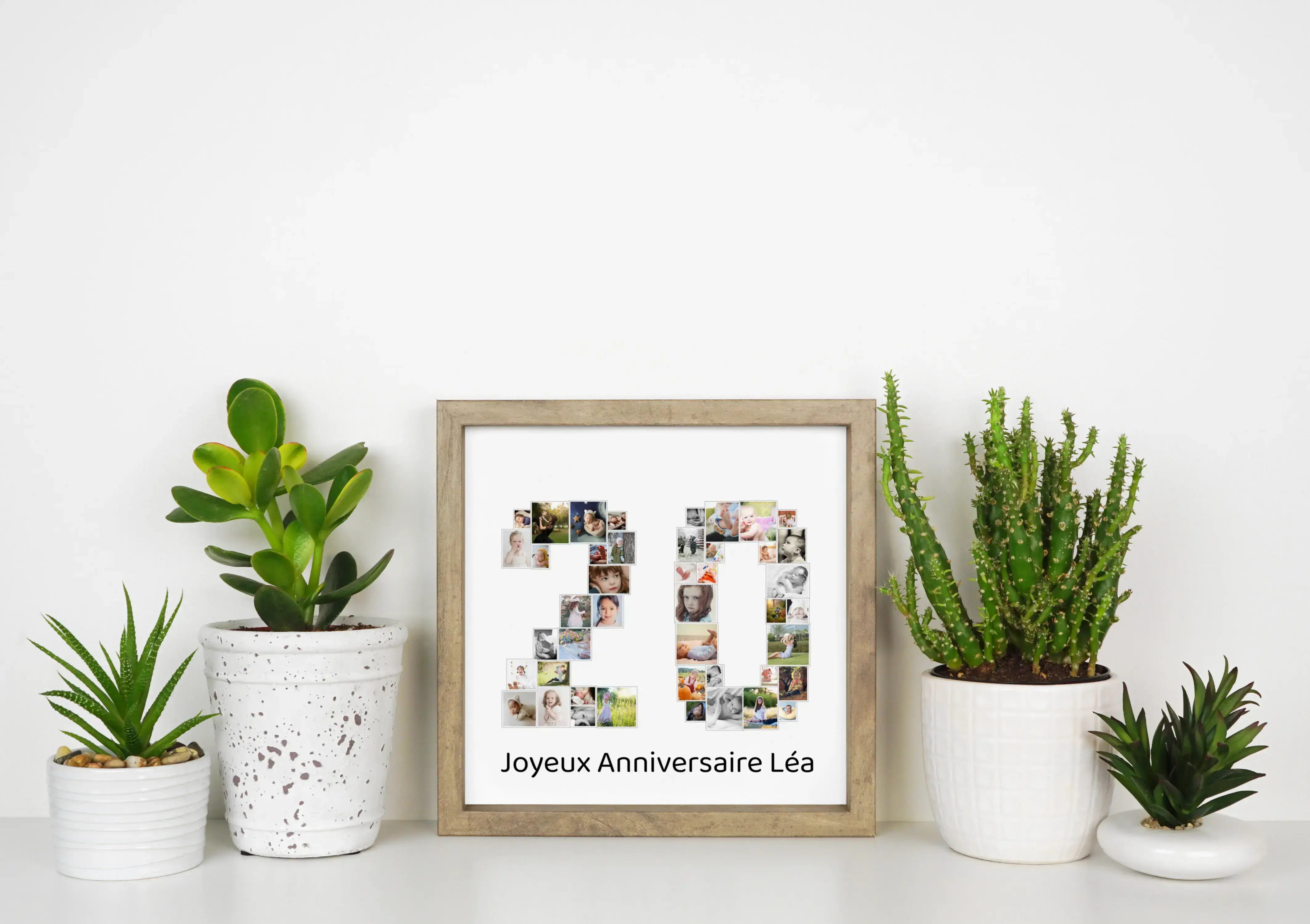 Créez votre propre chef-d'œuvre personnalisé avec notre option de collage photo unique. Imaginez une mosaïque formant le chiffre '20', composée de vos propres clichés. Que ce soit pour fêter un anniversaire marquant, un jubilé professionnel ou un anniversaire de mariage, vous avez la liberté de choisir entre 1 et 100 de vos photos préférées pour créer un effet saisissant.