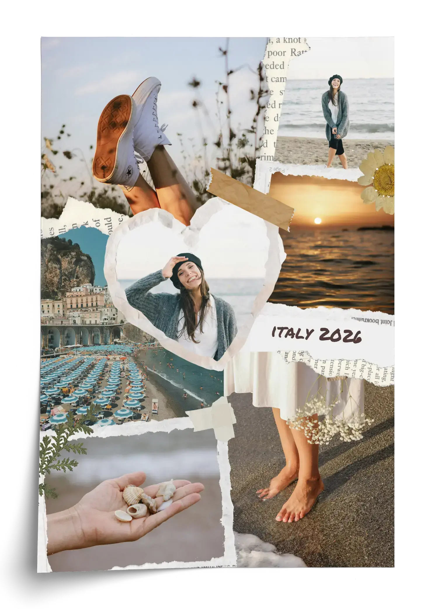 Créez dès maintenant une composition photo au style scrapbook sur le thème des vacances et des souvenirs de voyage. Plusieurs images s’assemblent comme des morceaux de papier découpés, avec des éléments façon ruban adhésif, de petits détails décoratifs et des textes manuscrits comme un lieu, une année ou une courte phrase.