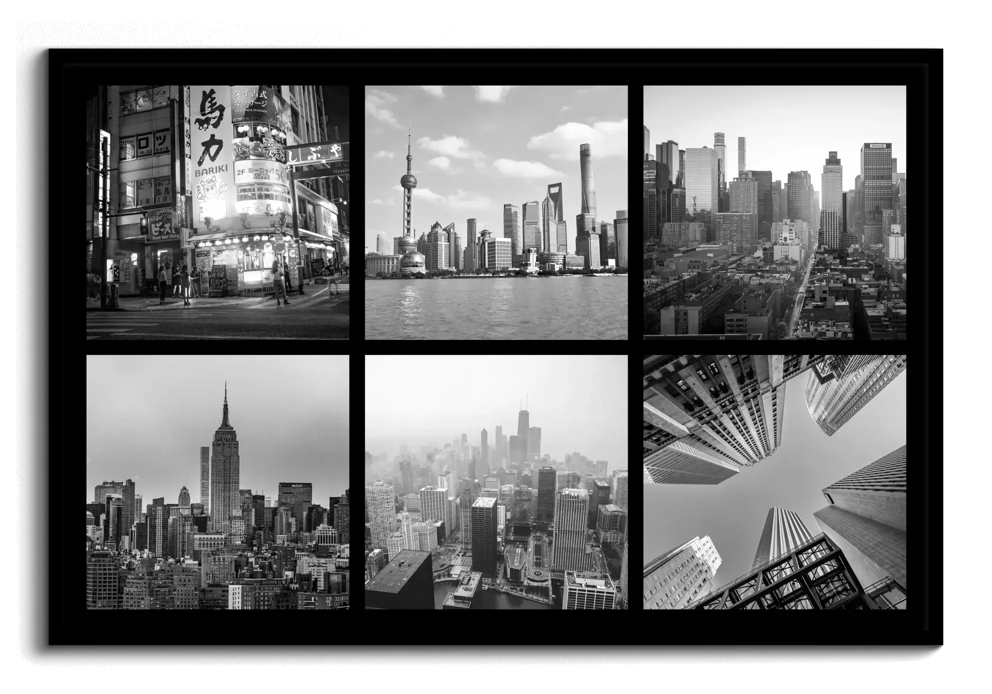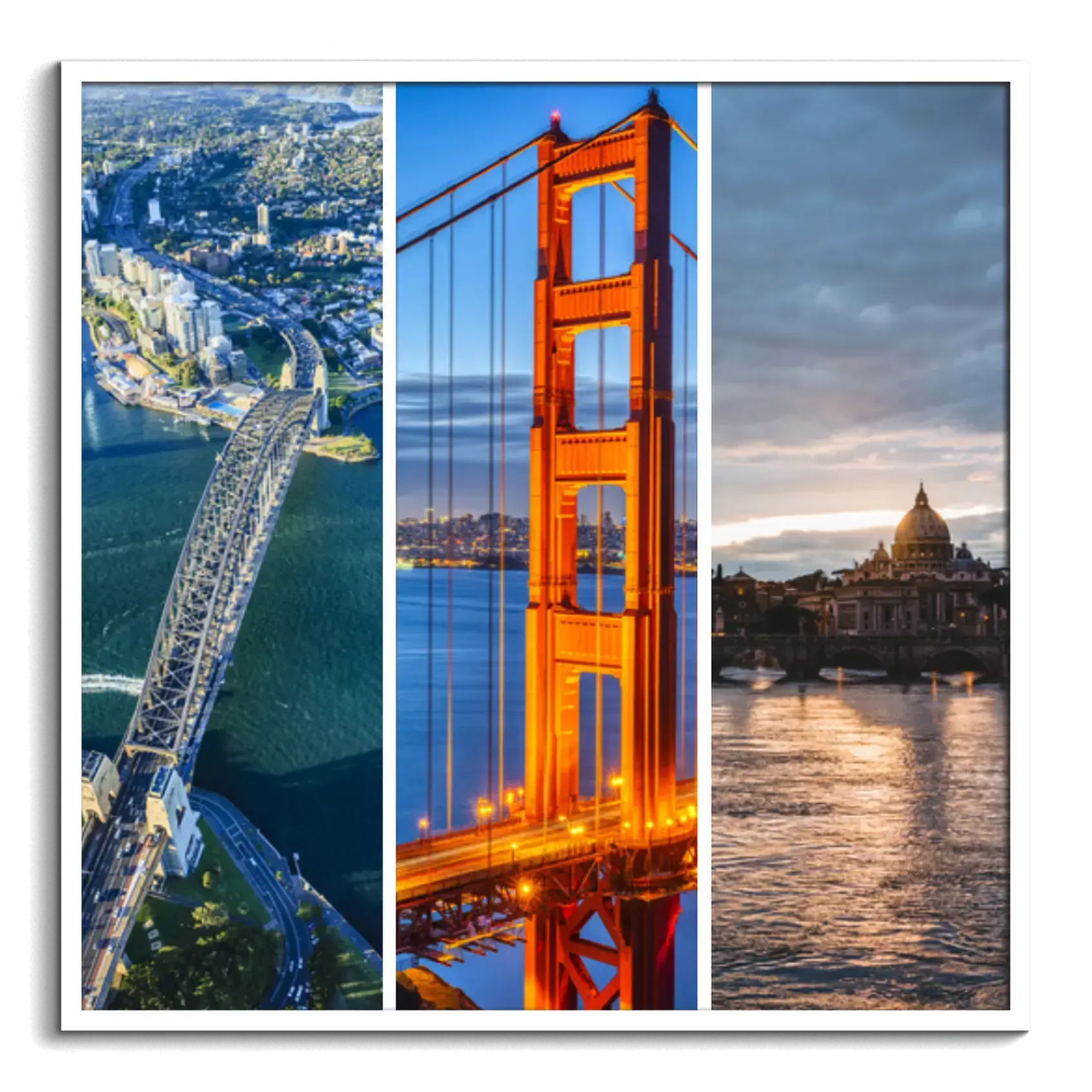 Souvenirs de voyages en collage mural: villes et monuments, gabarits variés, textes personnalisés.