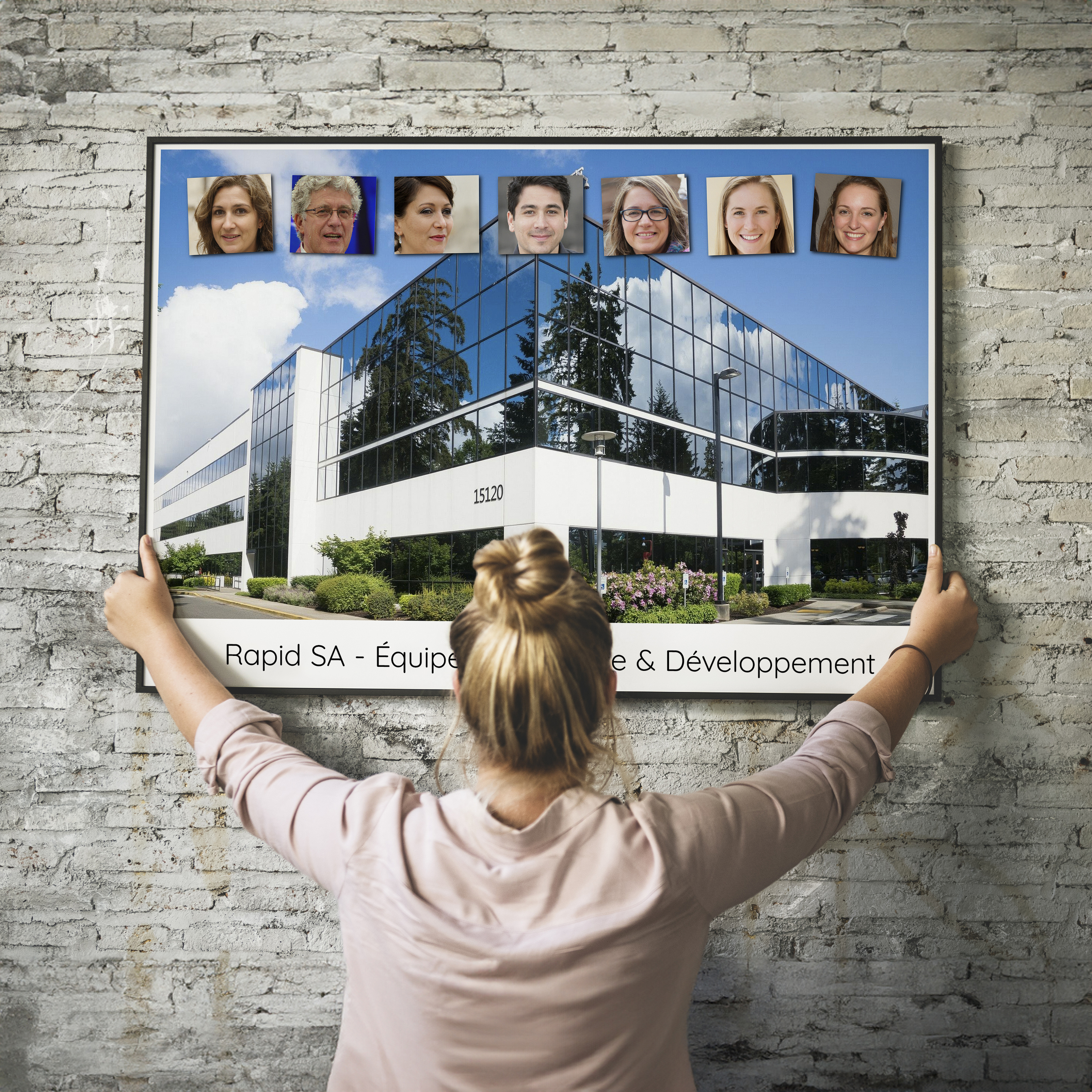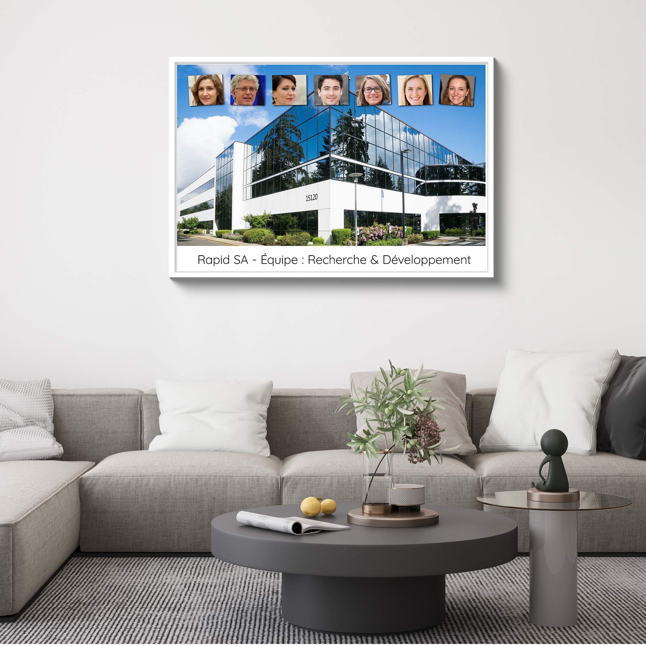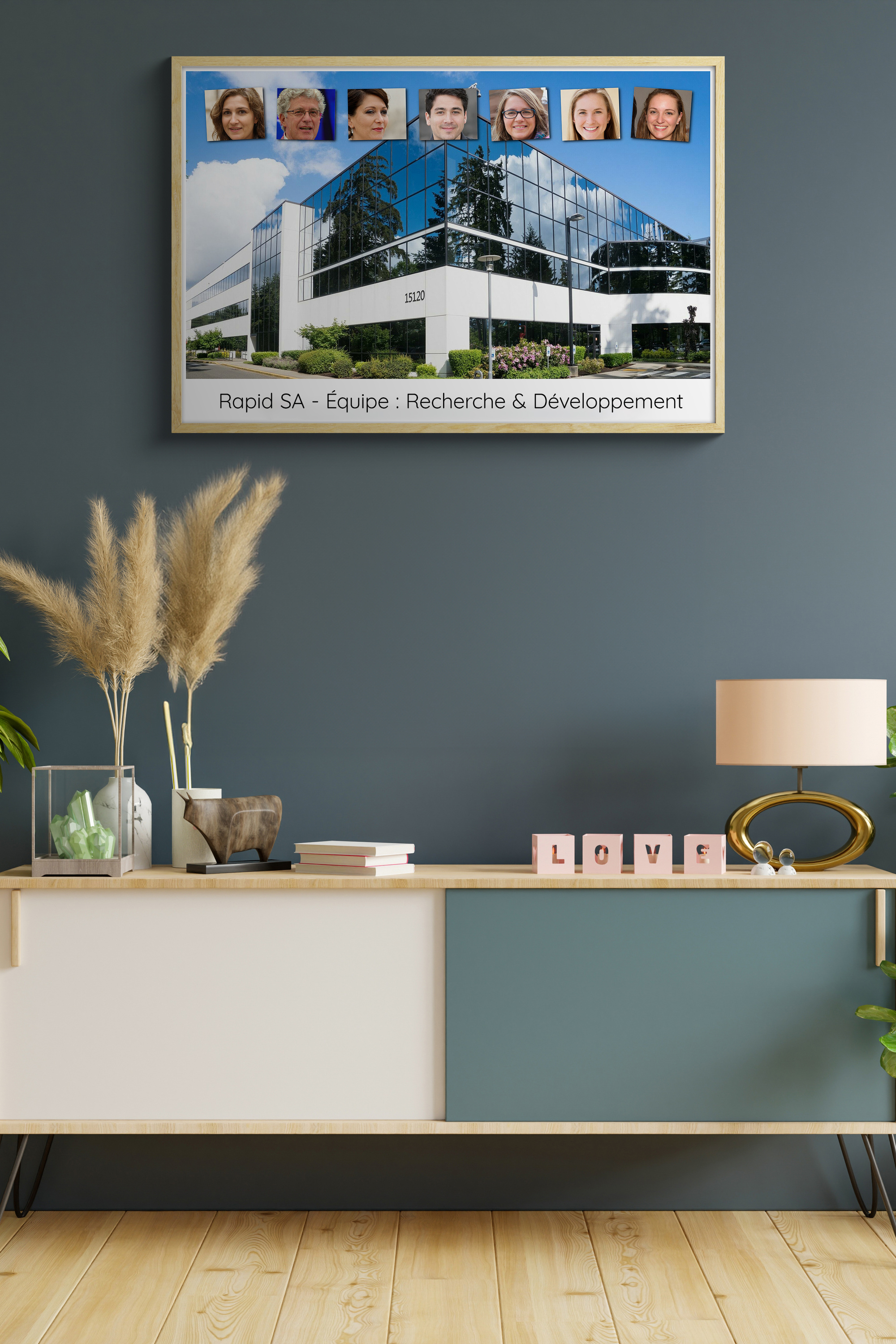 Créez votre propre souvenir unique avec notre collage photo personnalisable. Parfait pour embellir votre bureau d'entreprise ou offrir en souvenir à vos collègues, ce produit permet de mettre en avant votre photo de groupe ou votre bâtiment emblématique, entouré de portraits individuels de votre équipe. Personnalisez la légende pour capturer l'essence de votre département, tel que 'Rapid AG - Équipe : Recherche & Développement'.