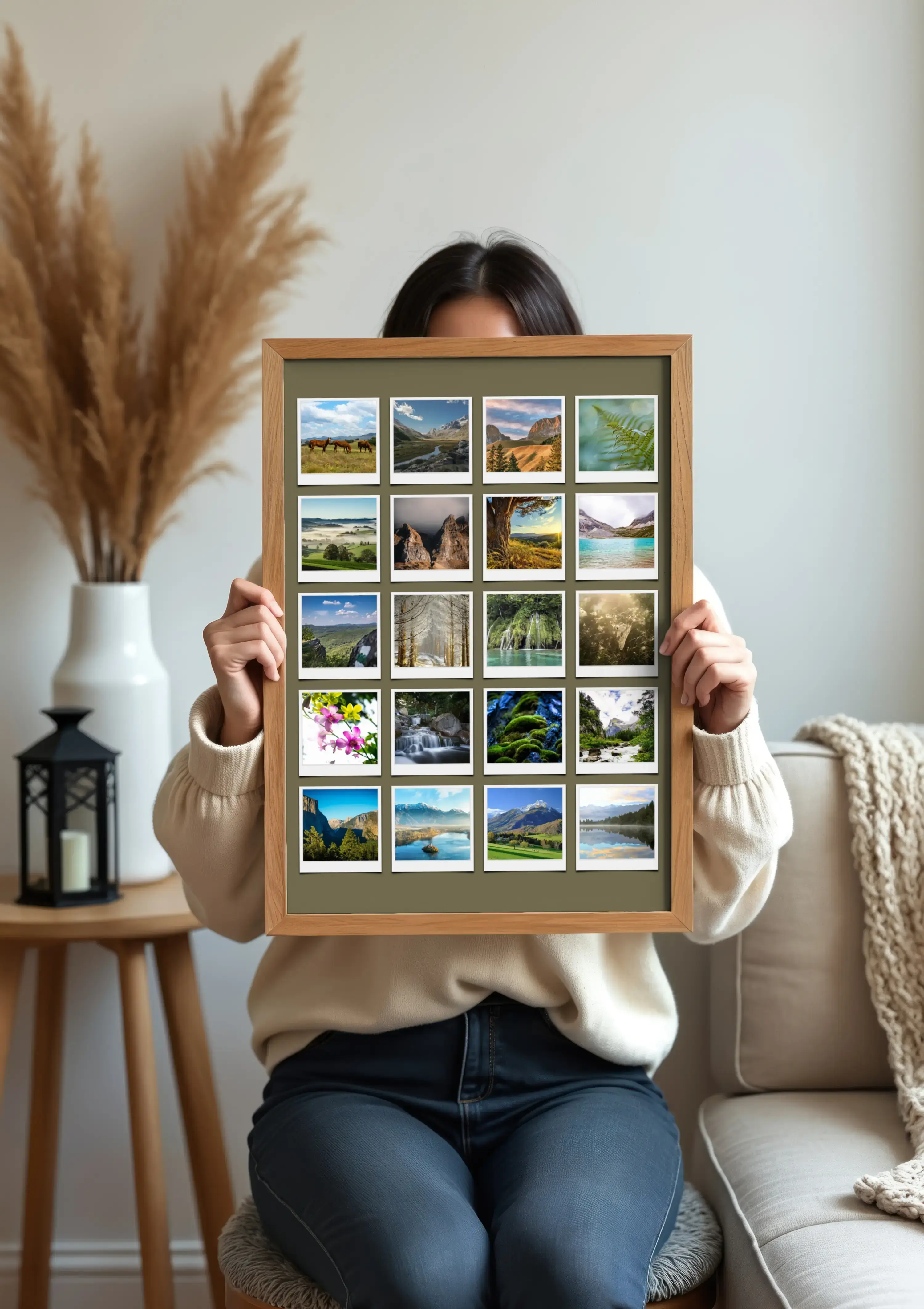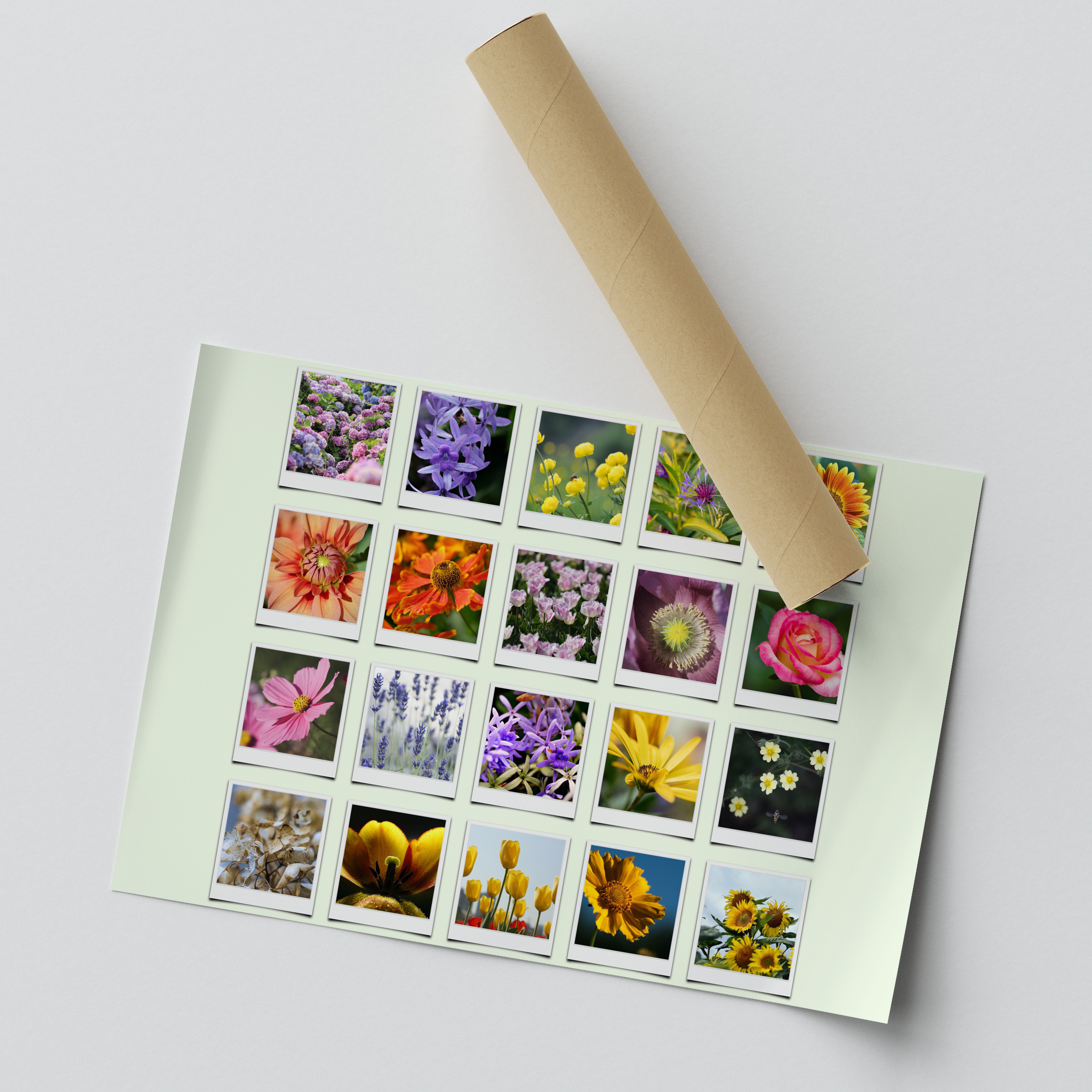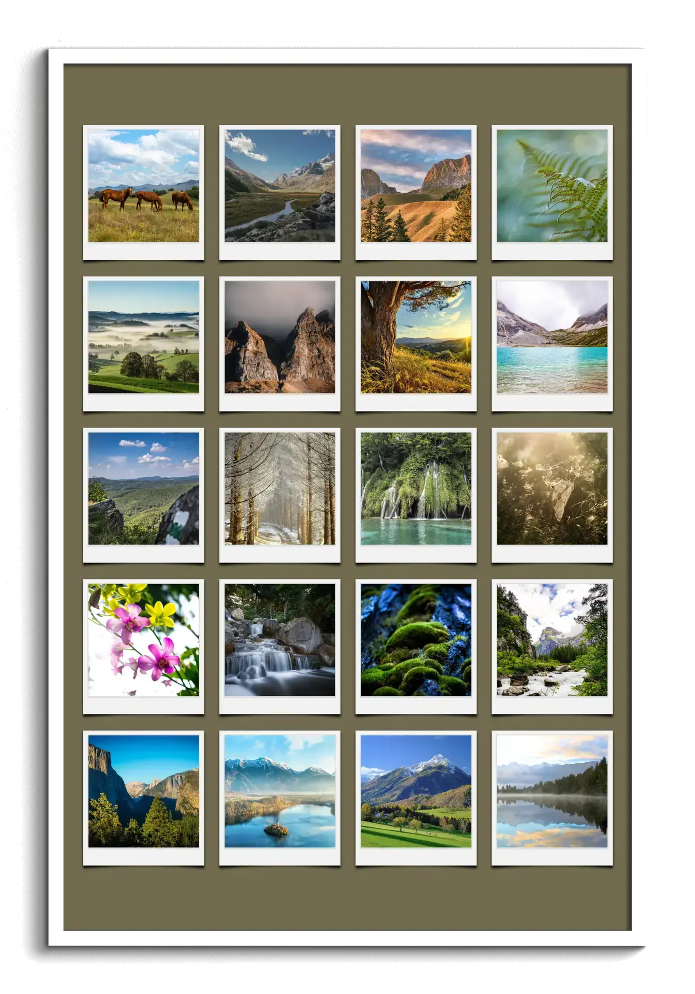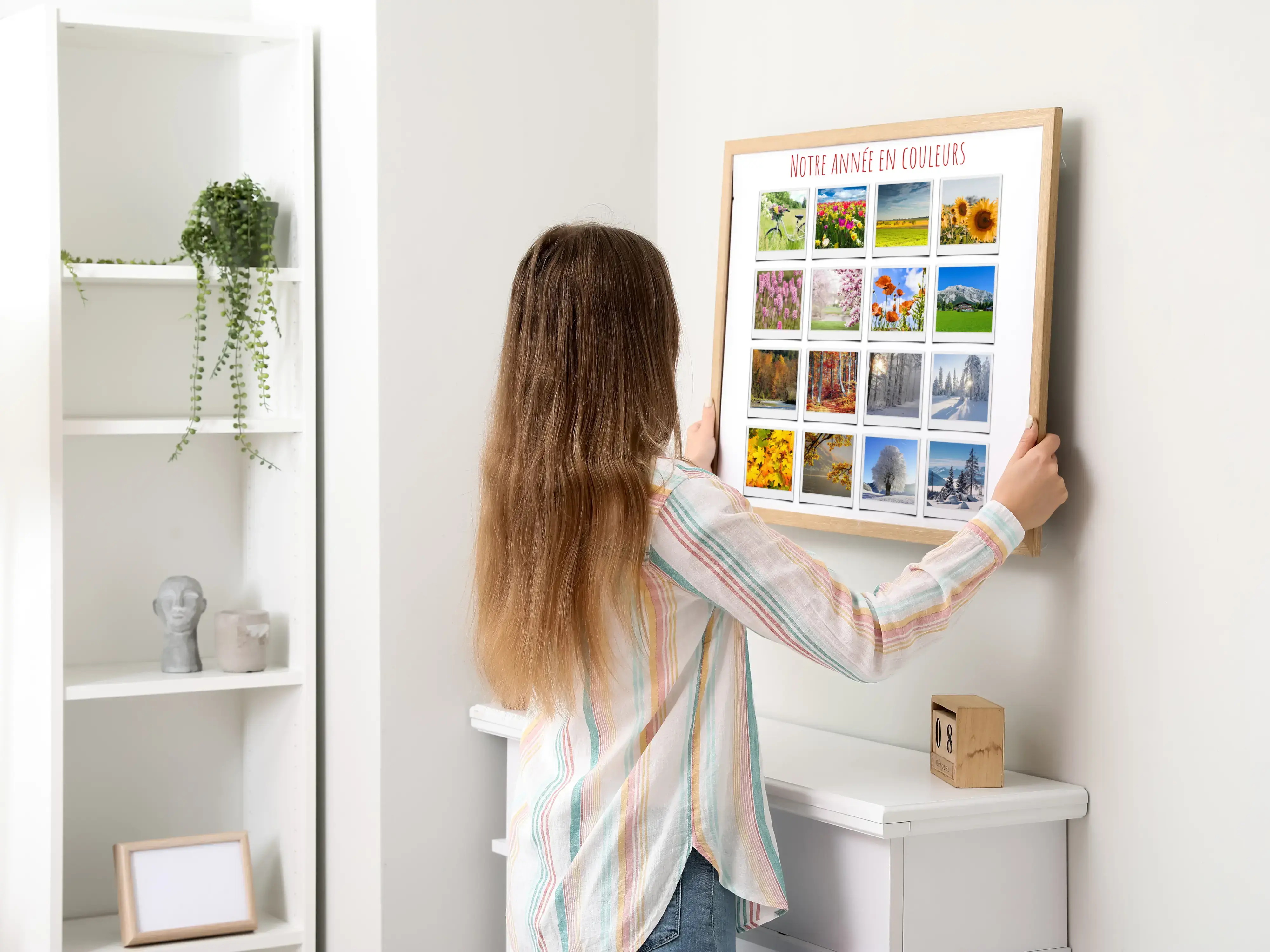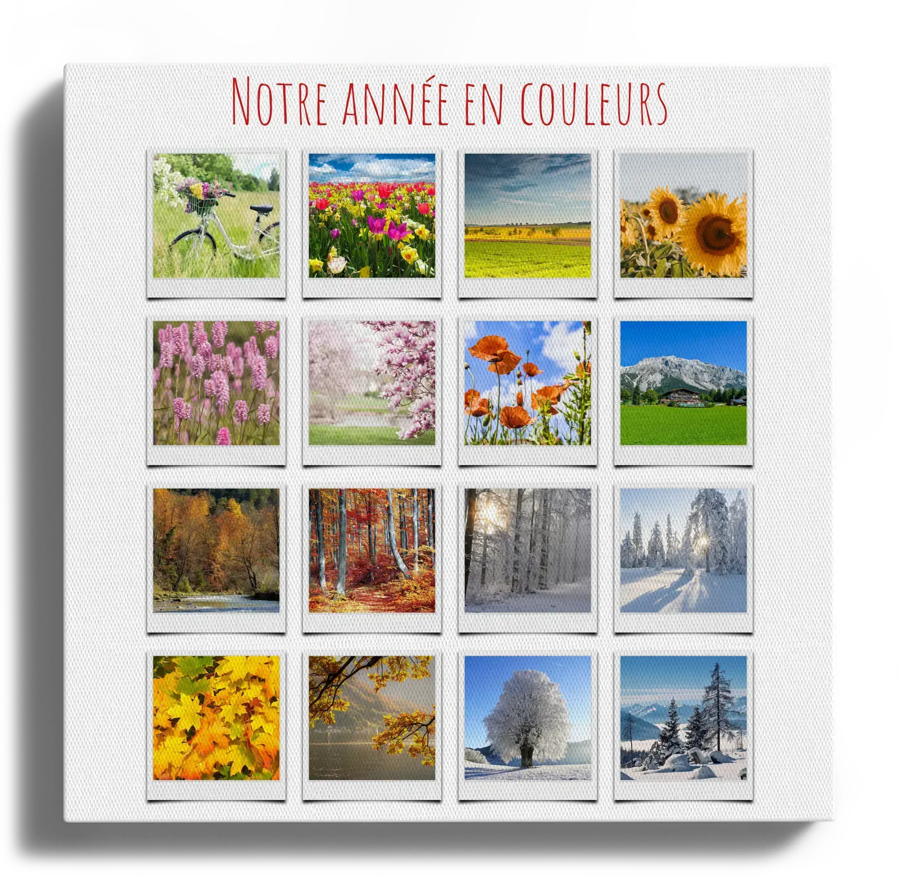 Découvrez notre produit personnalisé : une magnifique collage photo que vous pouvez créer vous-même, inspirée par la nature. Imaginez vos photos de fleurs, plages, forêts et paysages saisonniers réunies dans un style Polaroid. Ajoutez des textes comme "Notre année en couleurs" pour une touche personnelle et unique.