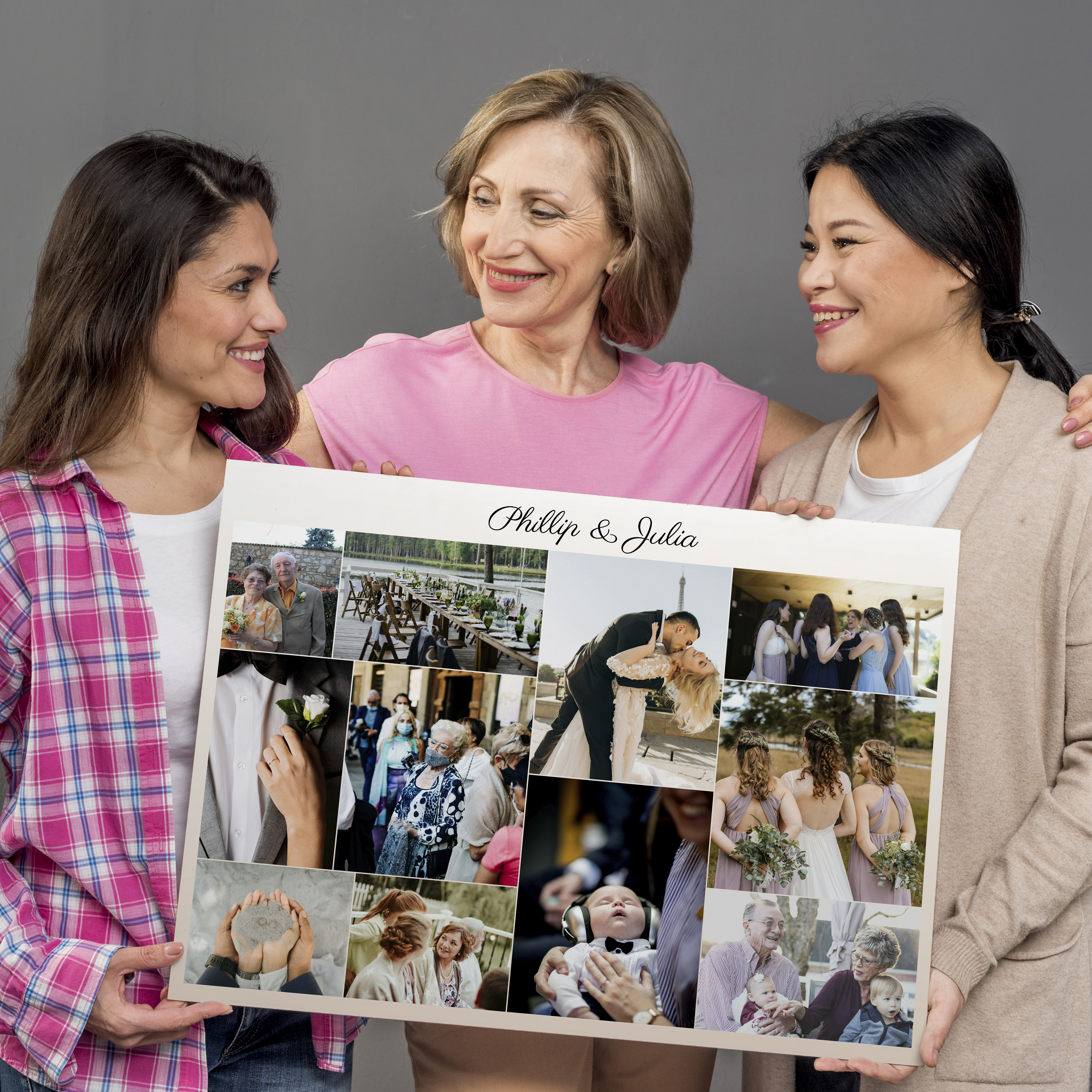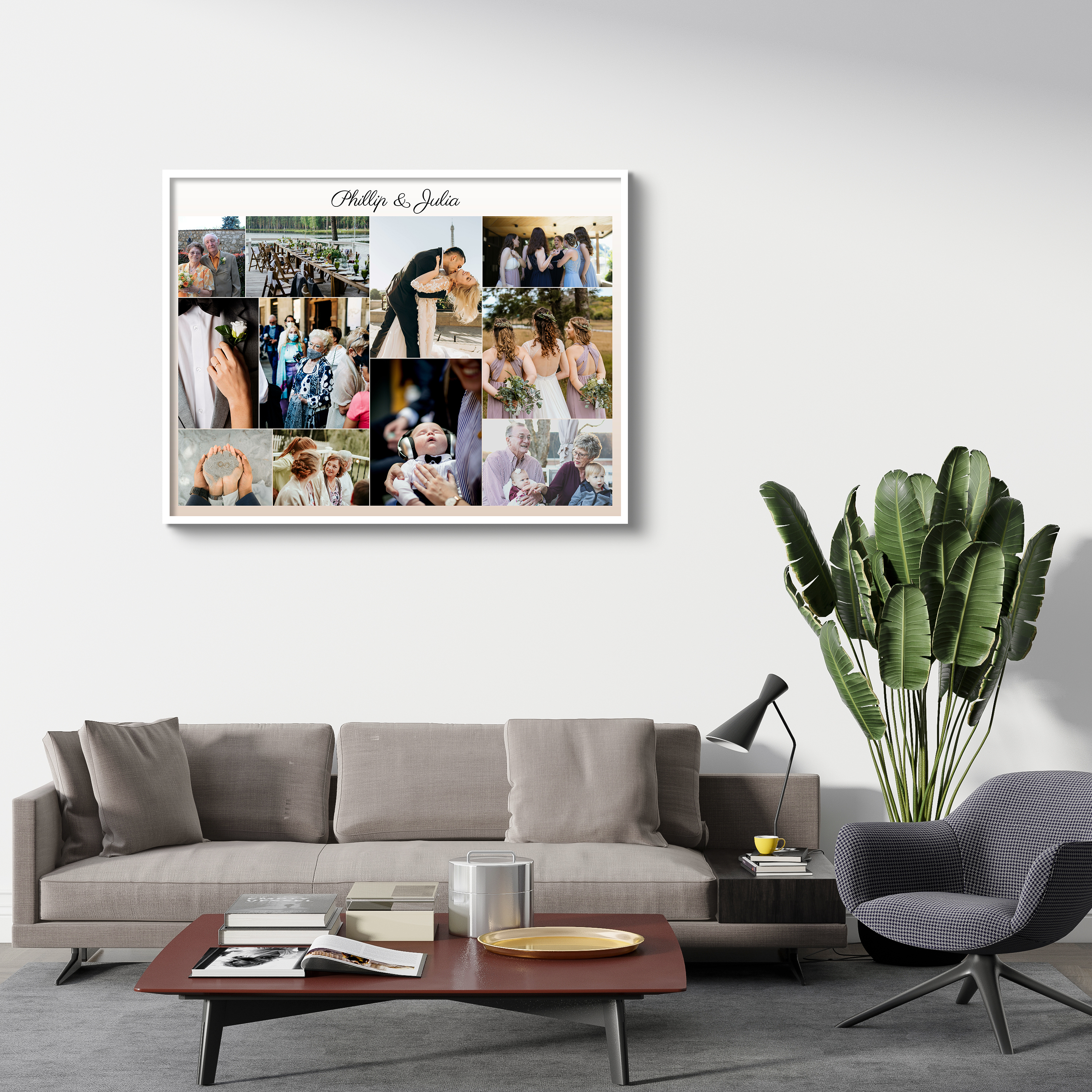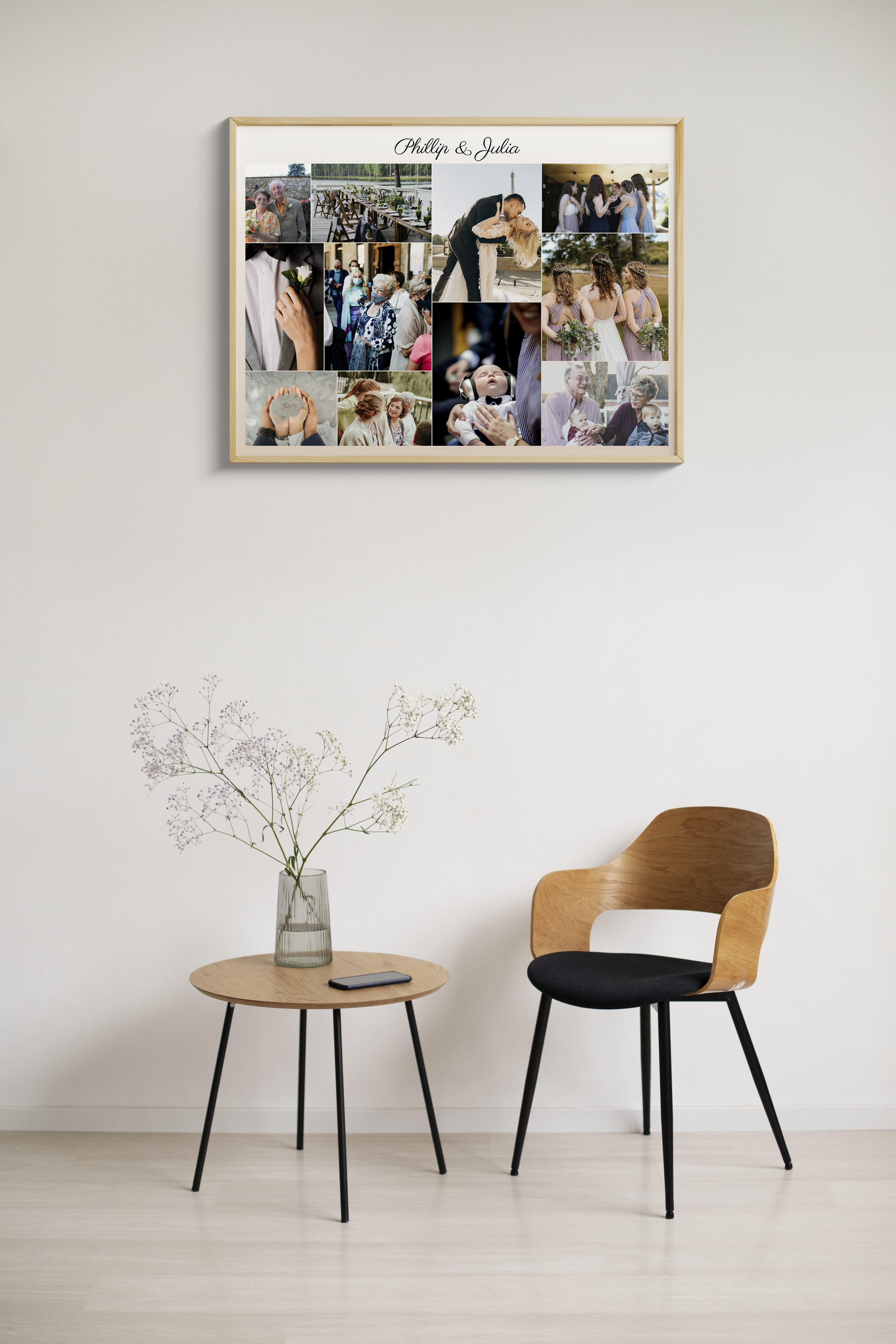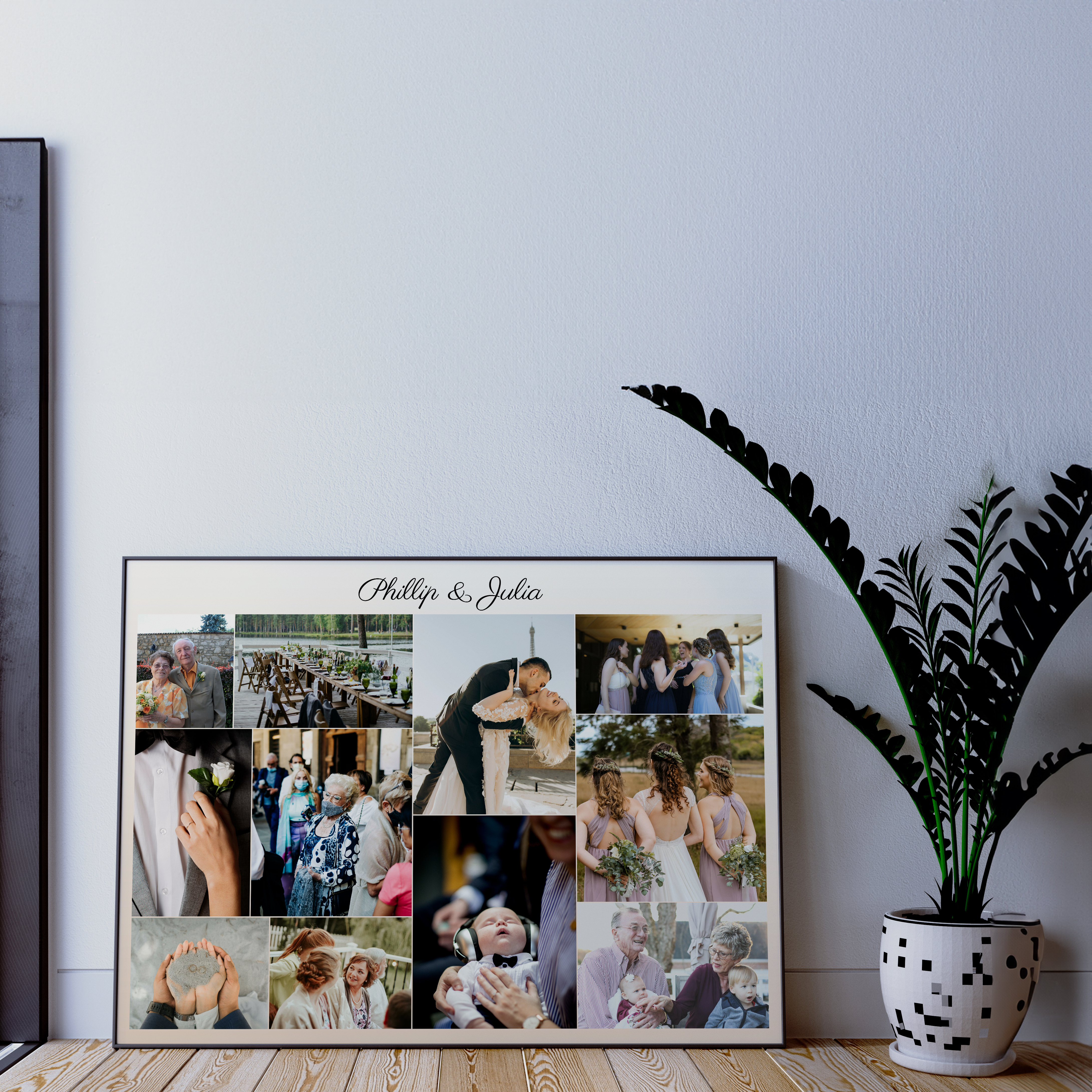 Collage unique avec photos et noms des mariés. Cadeau parfait pour un intérieur cosy.
