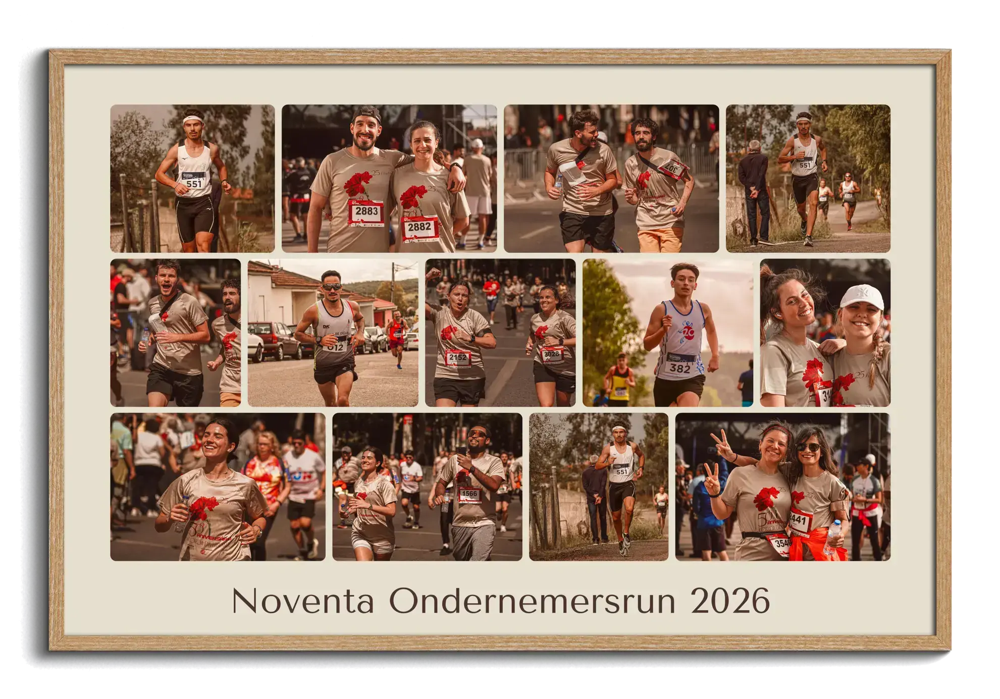 Qua vormgeving is er veel mogelijk. Je bepaalt zelf het aantal foto’s, de indeling, de beeldverhouding en de grootte. Ook kun je een persoonlijke tekst toevoegen, zoals een teamnaam, jaartal, slogan of datum van de loop. Achtergrondkleuren, lettertypes en beeldstijlen zijn aanpasbaar, zodat de collage strak, sportief of juist heel persoonlijk kan worden vormgegeven.