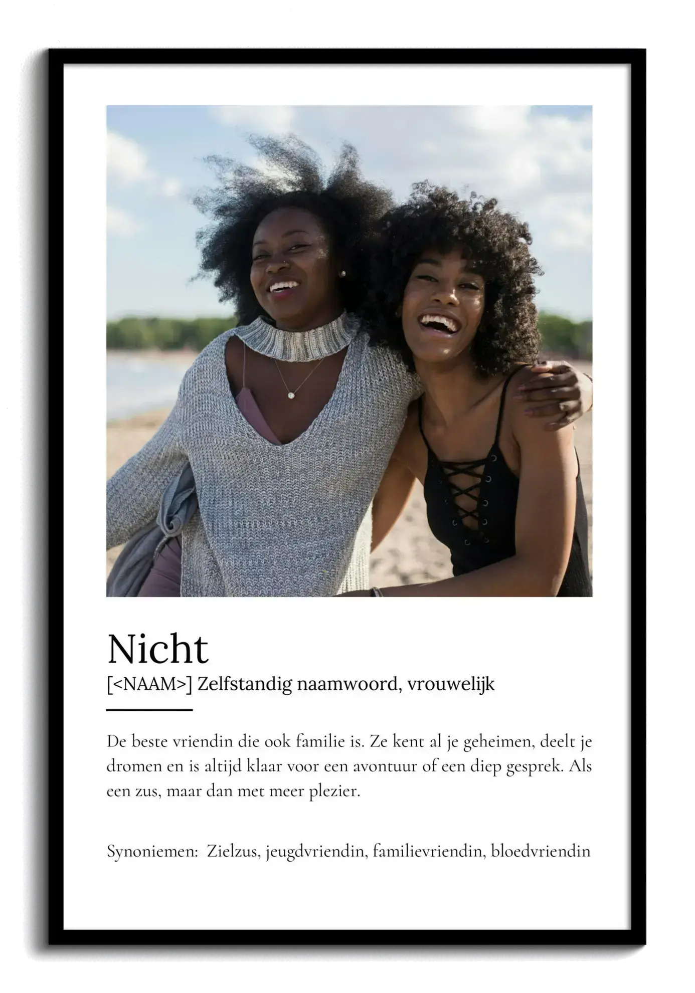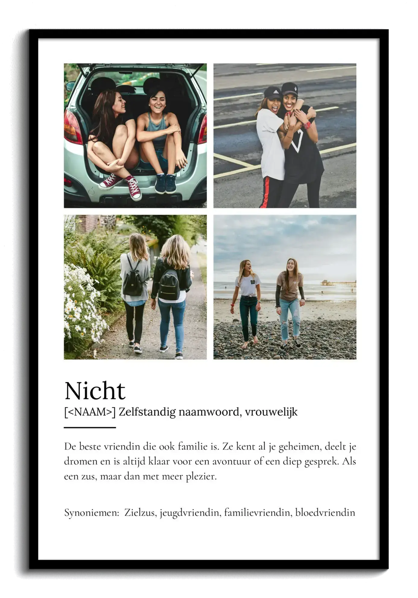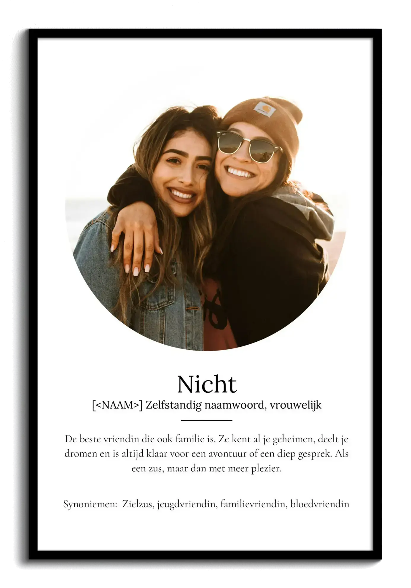 Persoonlijk cadeau voor de nicht, met foto en liefdevolle definitie in Duden-stijl.