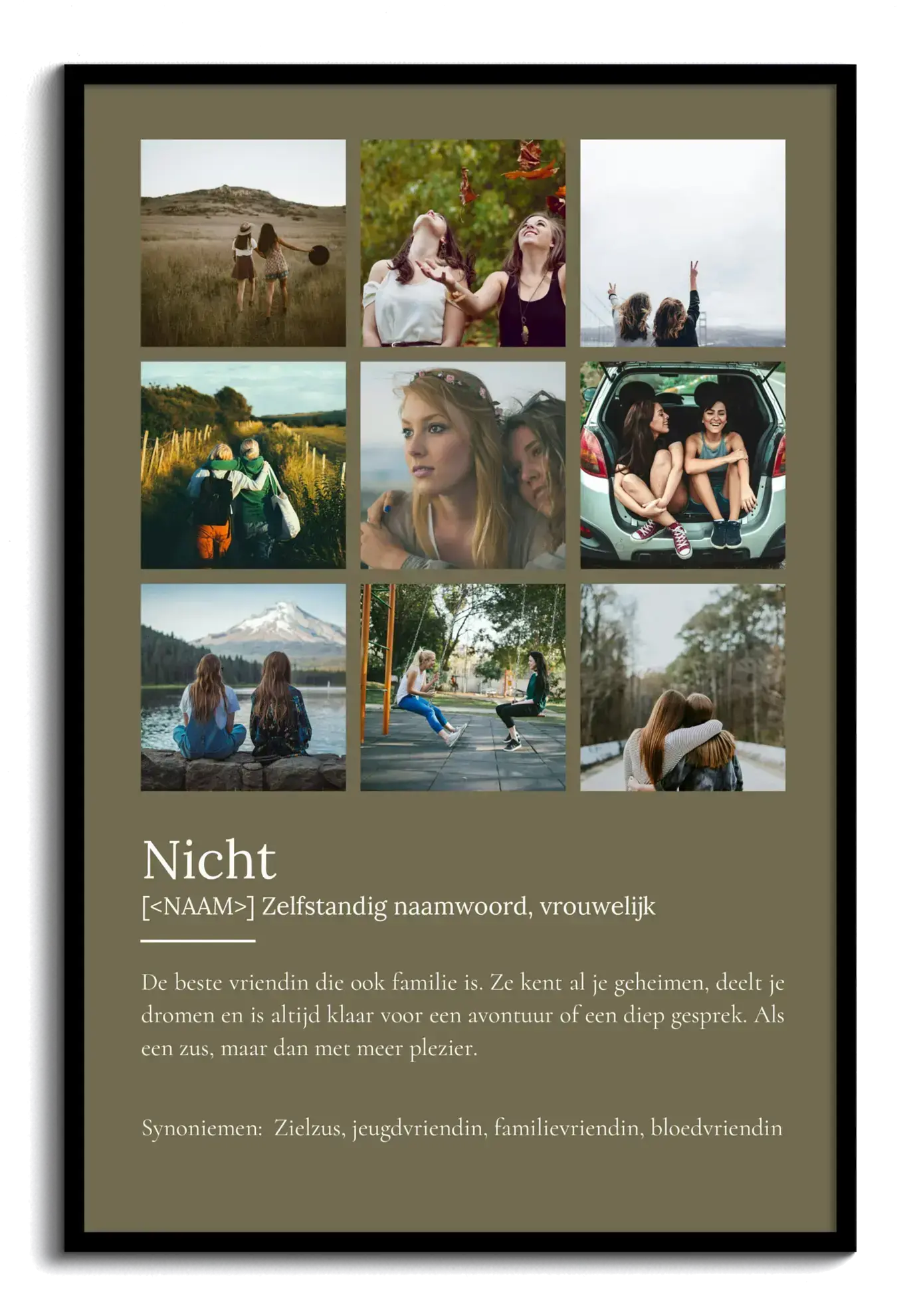 Wil je iets unieks en persoonlijks creëren als een speciaal cadeau voor je nicht? Ontwerp je eigen Definities-Poster in de stijl van 'Cousine' met de betekenis 'De beste vriendin die tegelijk familie is'. Voeg tot 9 foto's toe en pas de kleur, tekst en lay-out aan zodat het precies bij jouw stijl past.