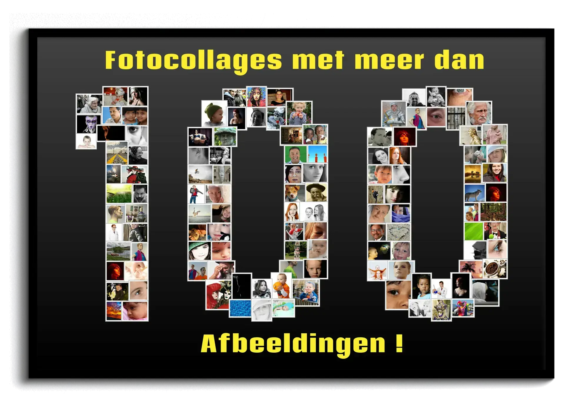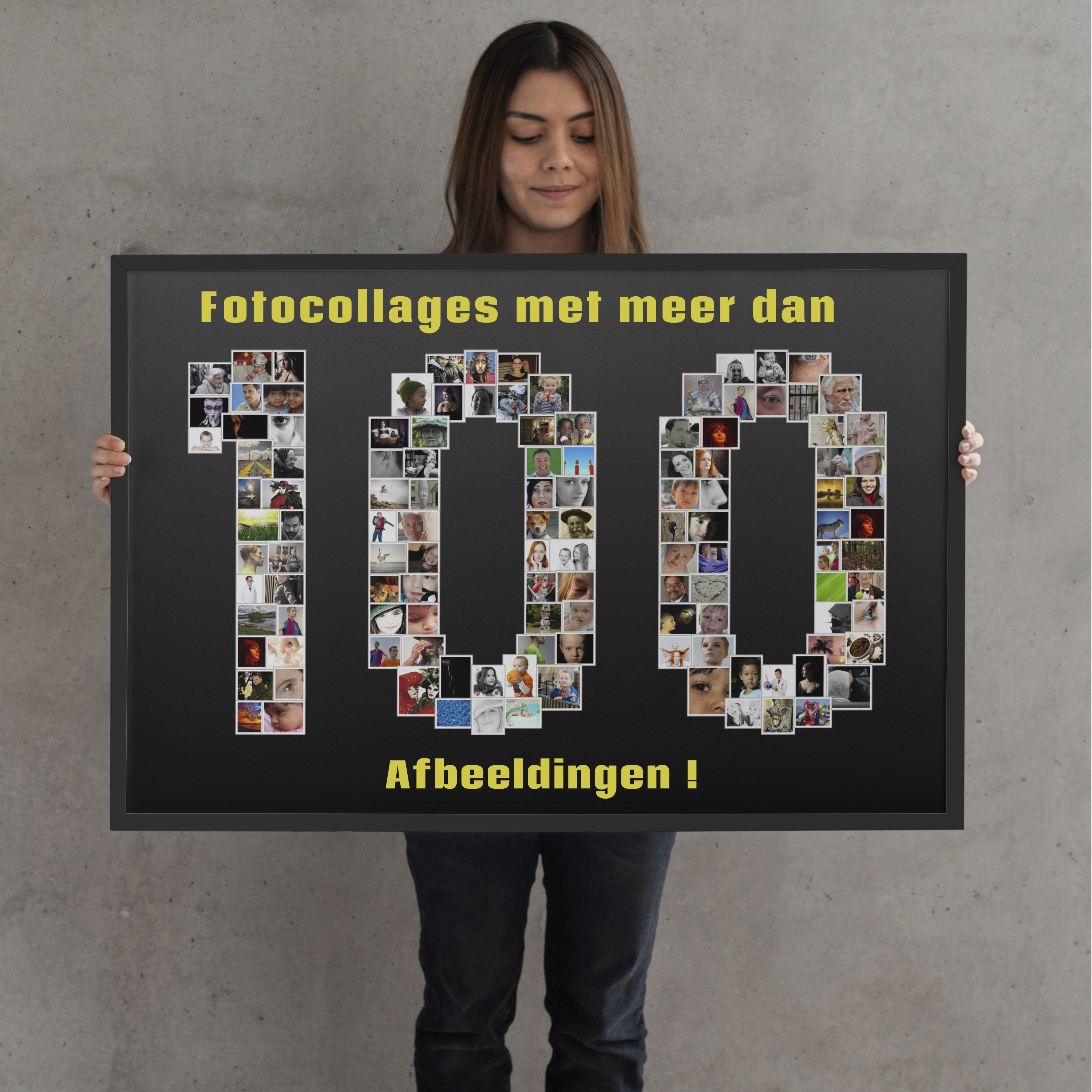 Persoonlijke fotocollage in '100'-vorm met meer dan 100 foto's in stijlvol donker design.