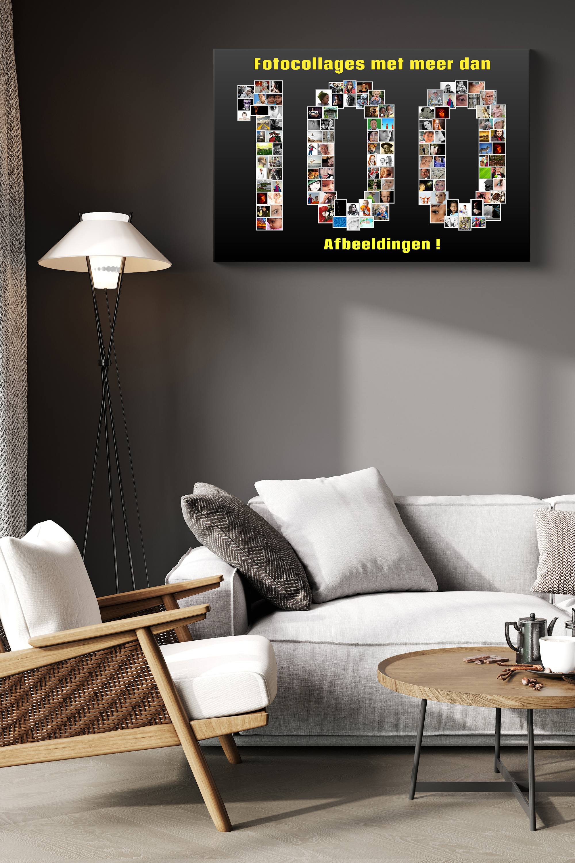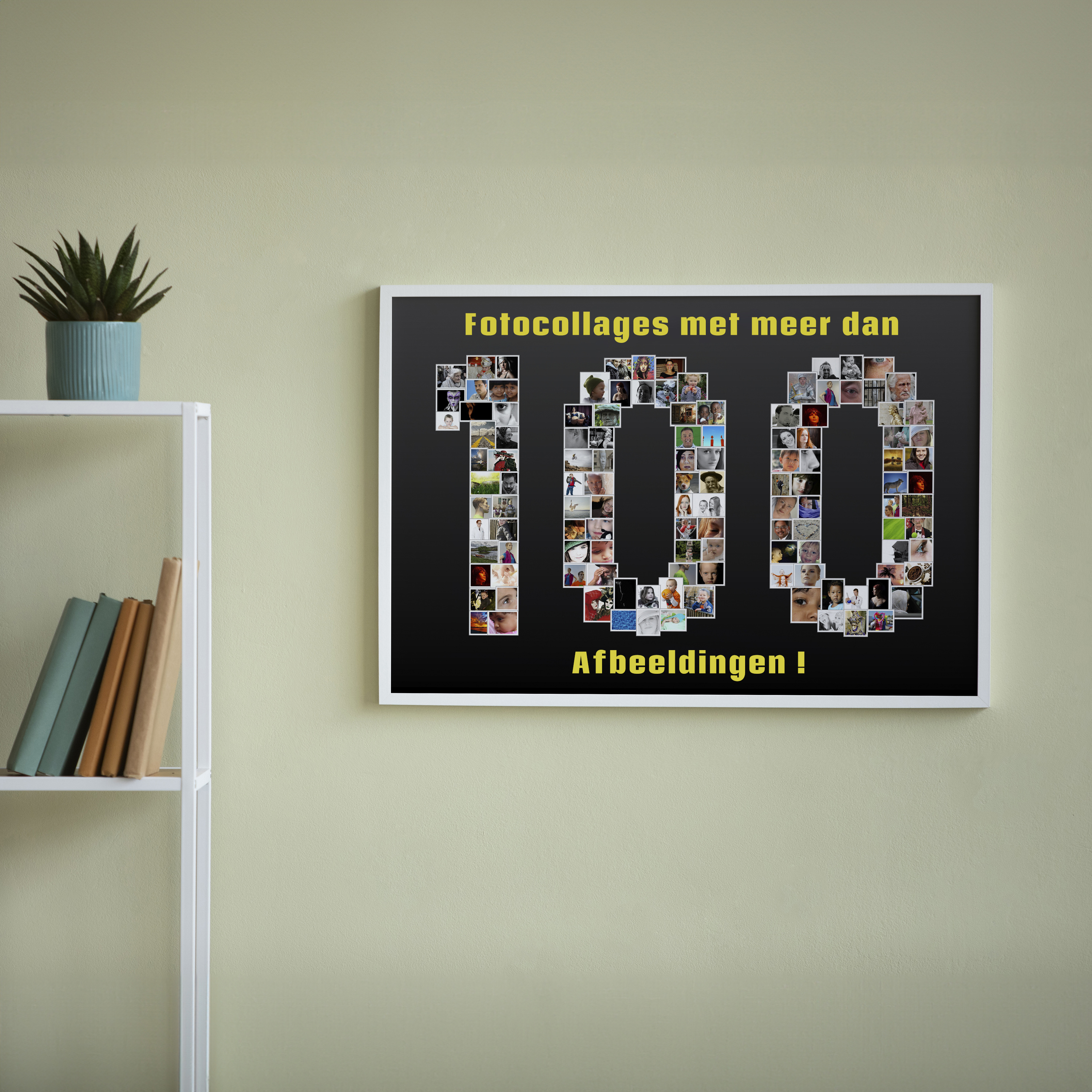 Ontwerp nu je eigen unieke fotocollage en leg je meest waardevolle herinneringen vast. Stel je voor, een grote hoeveel foto's, elegant gerangschikt in de vorm van het getal 100, perfect voor elk jubileumfeest. Dat is slechts een voorbeeld van wat je met onze gebruiksvriendelijke collage-app kunt bereiken. Tot 250 foto's kun je moeiteloos verwerken, in prachtig donkere tinten voor die extra vleugje elegantie.