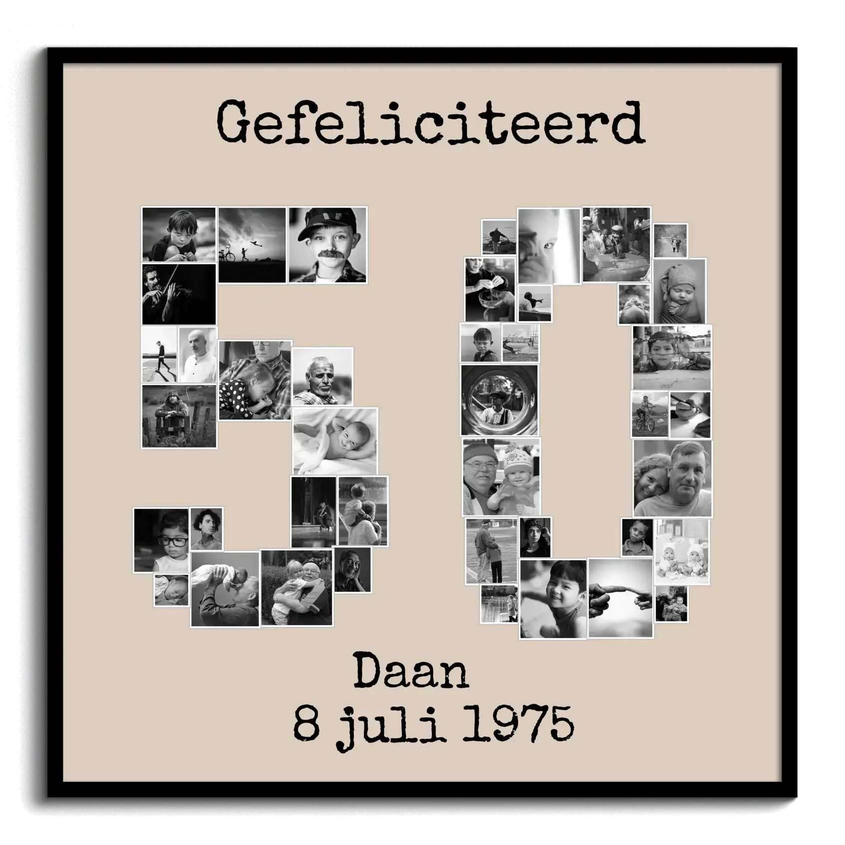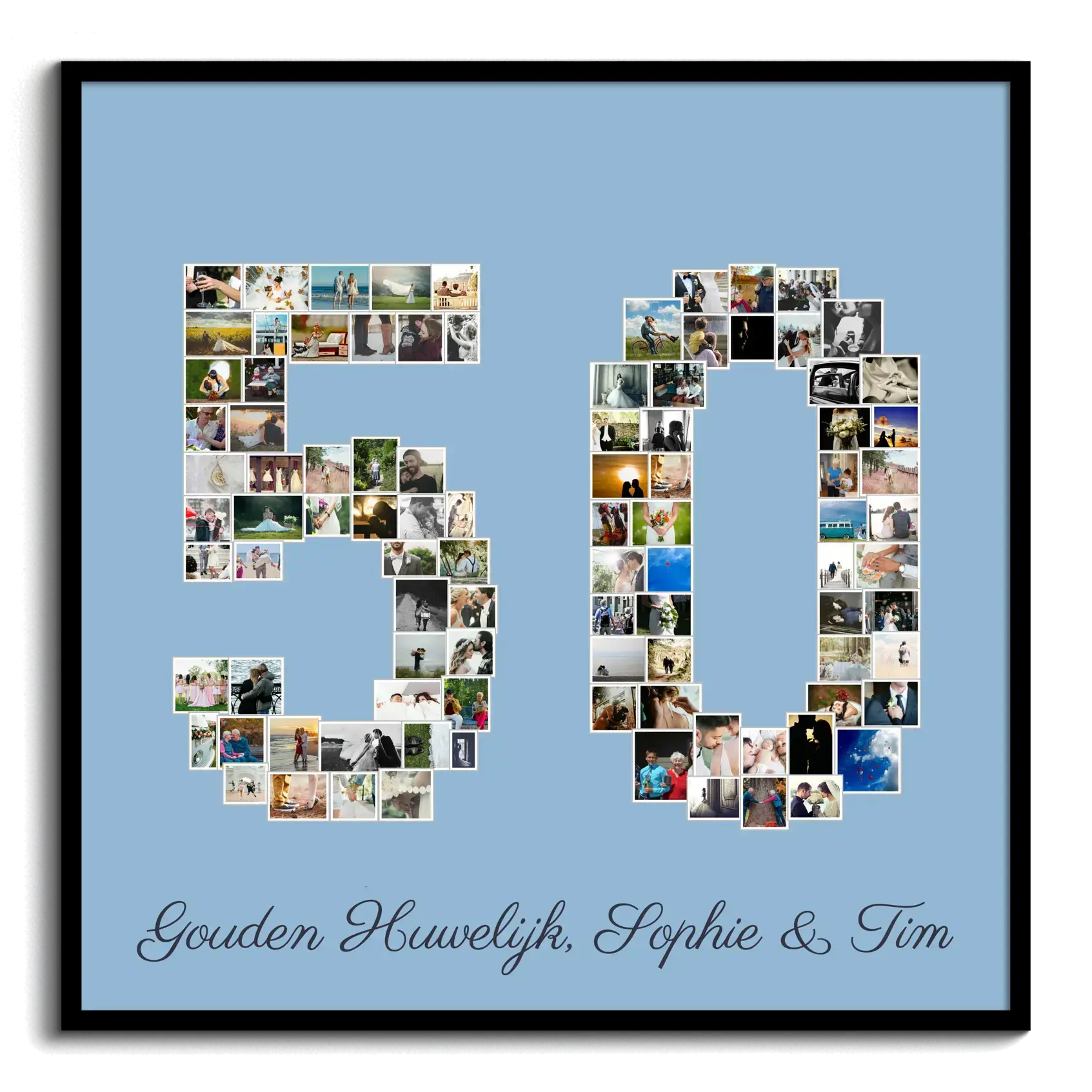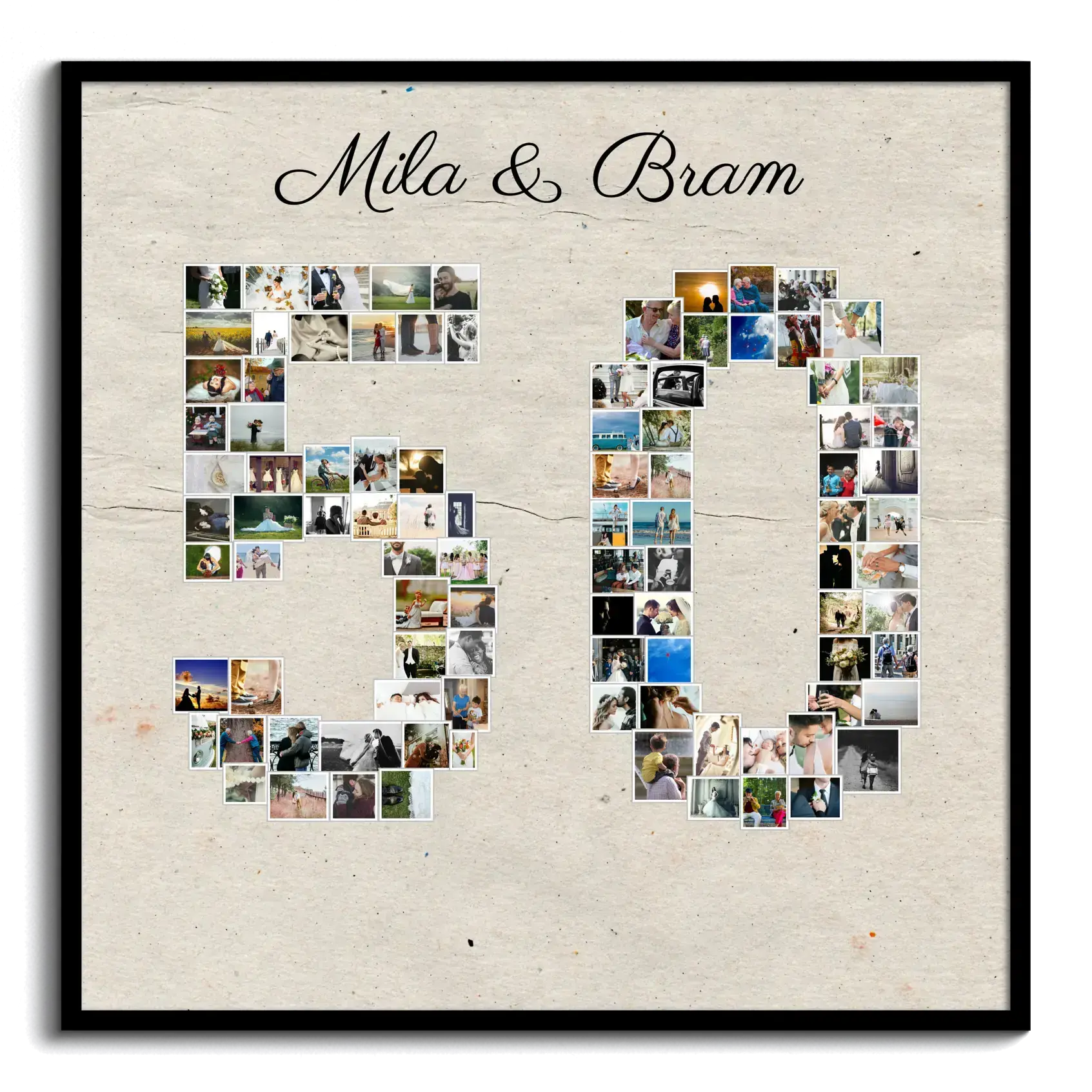 Unieke collage '50' met 1-100 foto's, ideaal voor verjaardagen en goud huwelijksjubileum.