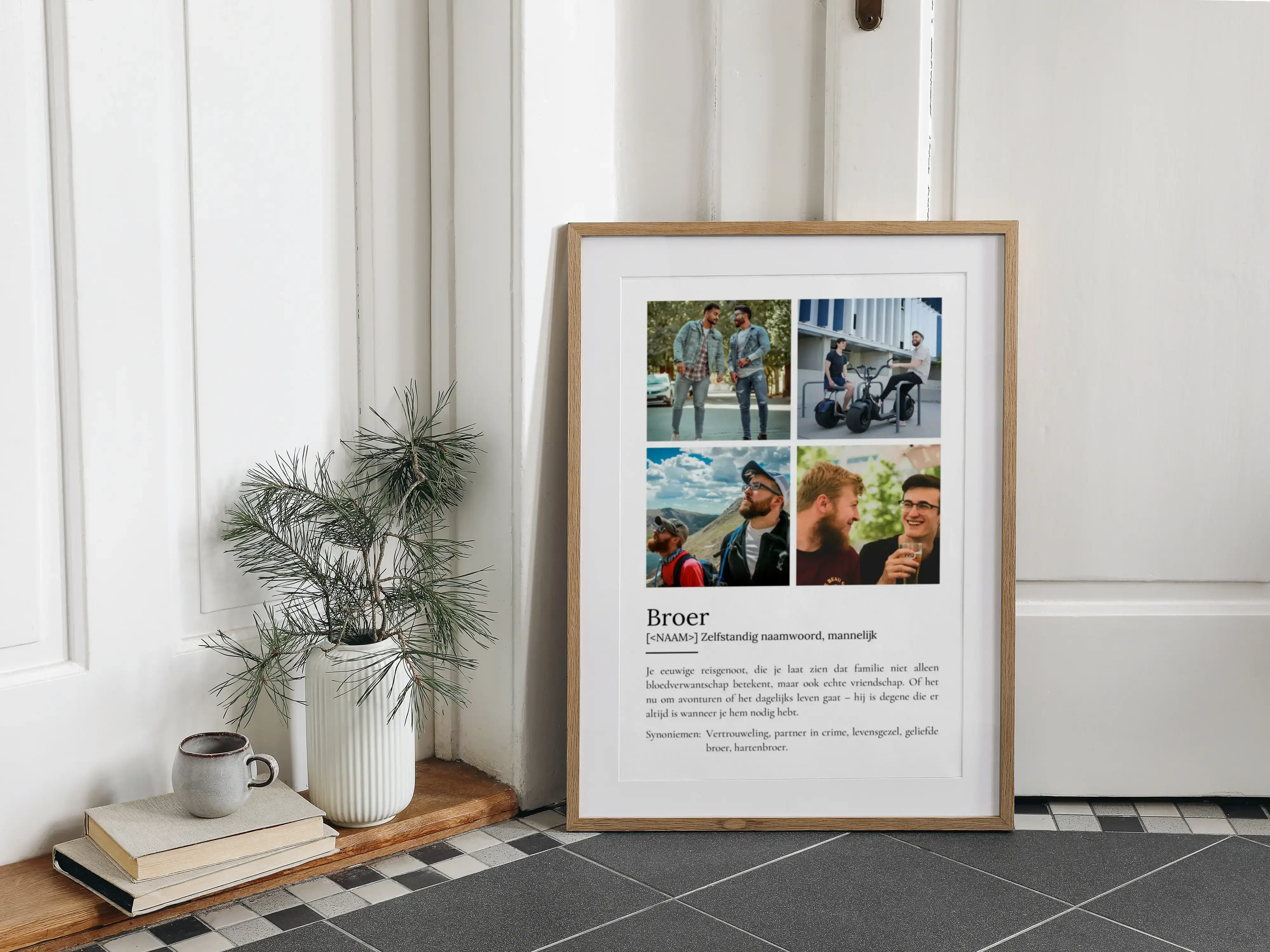 Maak jouw eigen unieke fotocollage en geef een betekenisvol cadeau aan jouw broer. Dit personaliseerbare Definitions-Poster in Duden-stijl biedt ruimte voor tot wel 9 van jouw favoriete foto's. Voeg jouw persoonlijke boodschap toe, bijvoorbeeld: 'Jouw eeuwige metgezel, die laat zien dat familie niet alleen bloedverwantschap, maar ook echte vriendschap betekent. Op avontuur of in het dagelijks leven – hij is er altijd wanneer je hem nodig hebt.' Pas het ontwerp helemaal aan jouw wensen aan en verras jouw broer met iets speciaals.