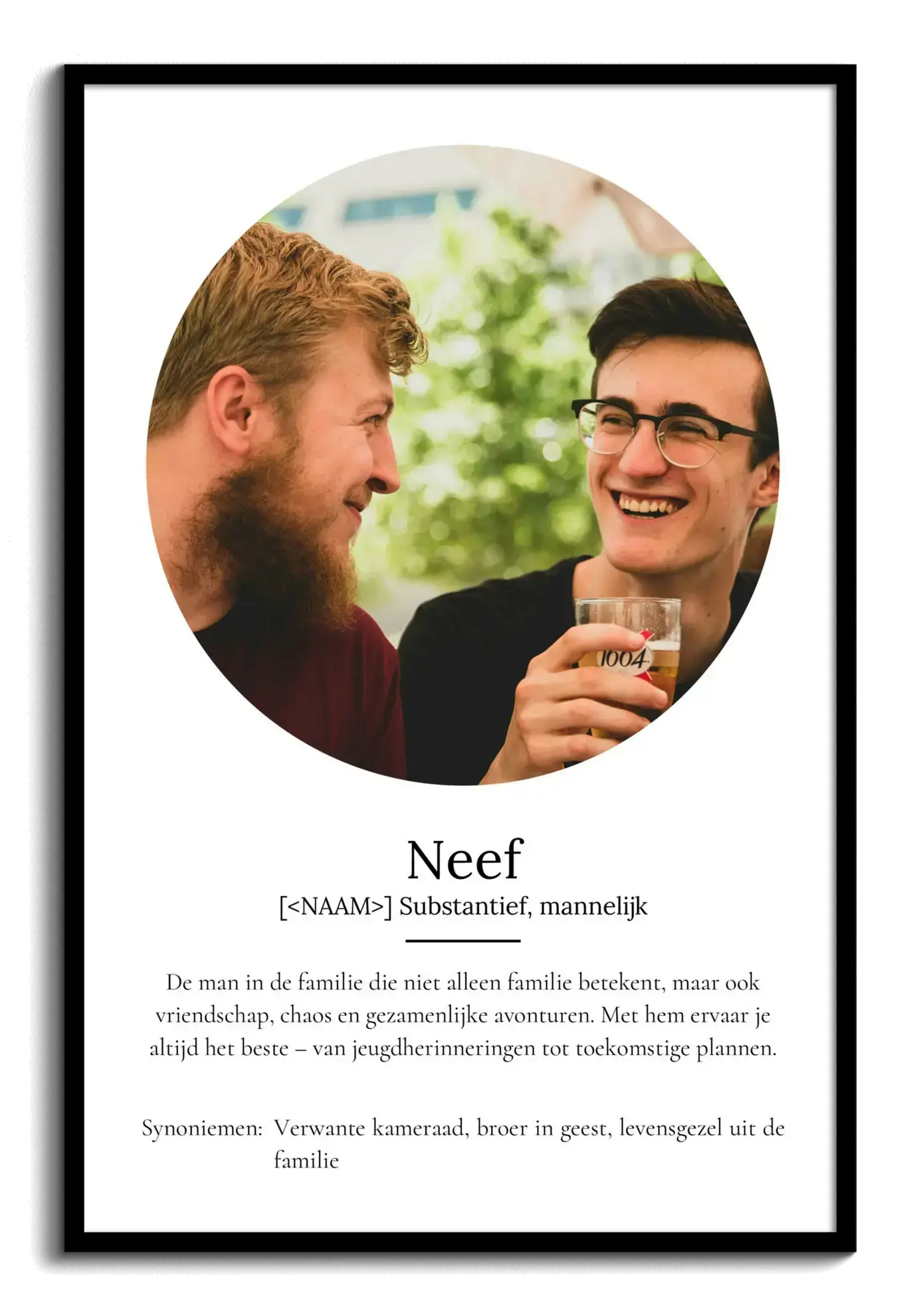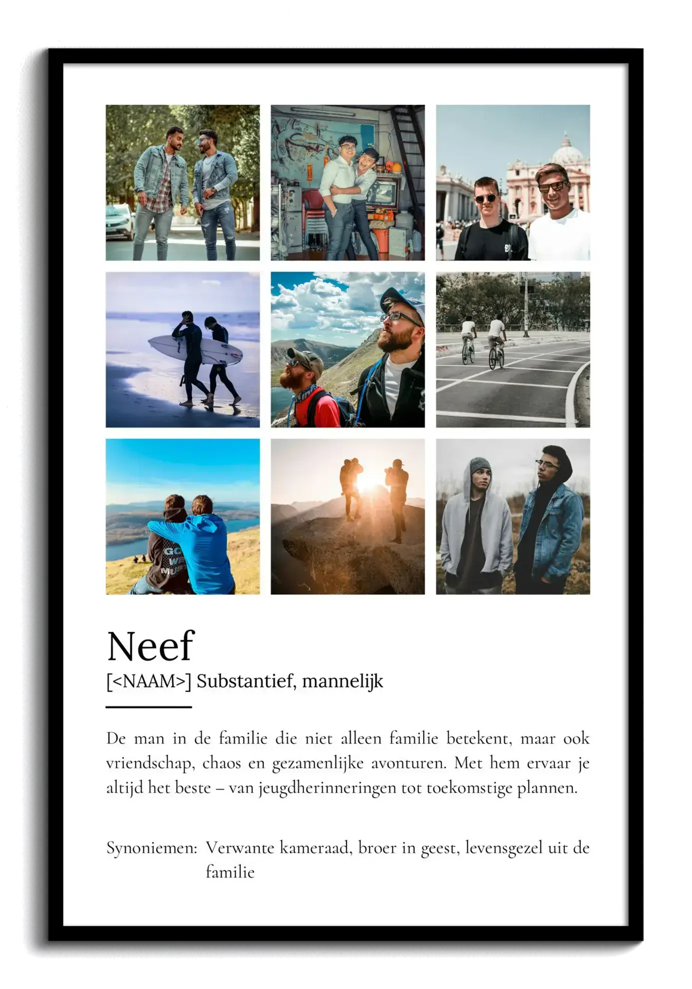 Ontwerp je persoonlijke neef-definitieposter met eigen foto's