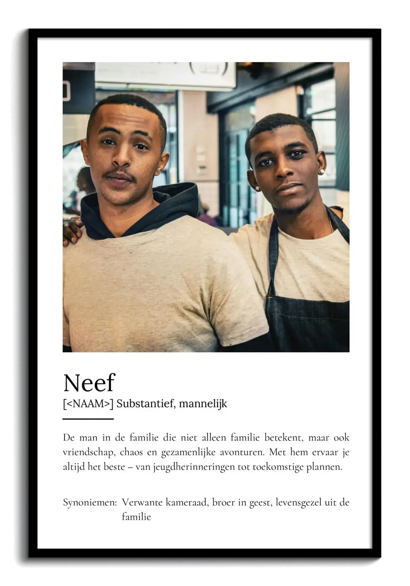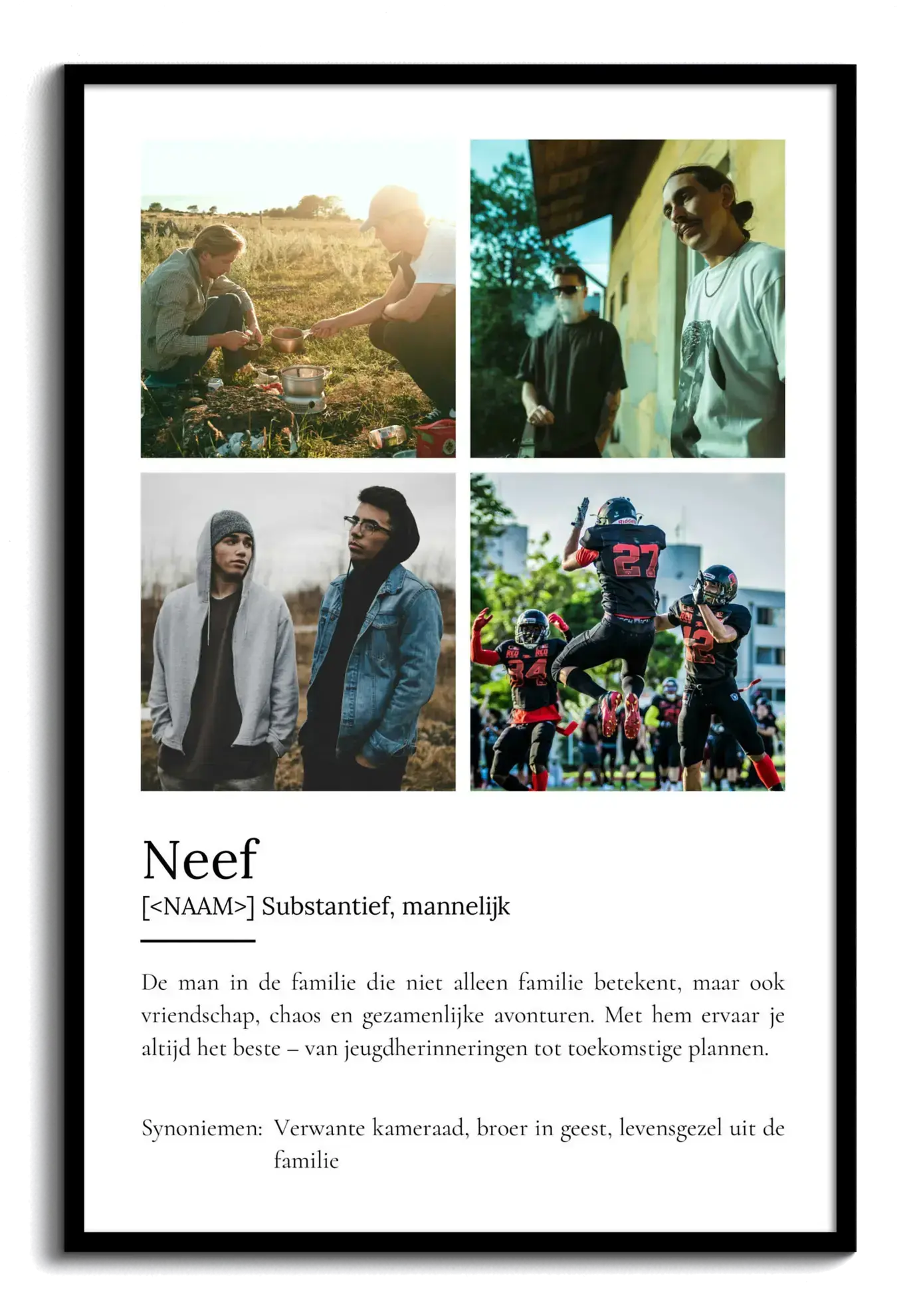 Ontwerp je eigen memorabele cadeau met een gepersonaliseerd Definitions-Poster Cousin in Duden-stijl. Creëer een uniek kunstwerk met foto’s van je geliefde neef en voeg een persoonlijke definitie toe: de kerel in de familie die niet alleen verwantschap betekent, maar ook vriendschap, chaos en gezamenlijke avonturen.