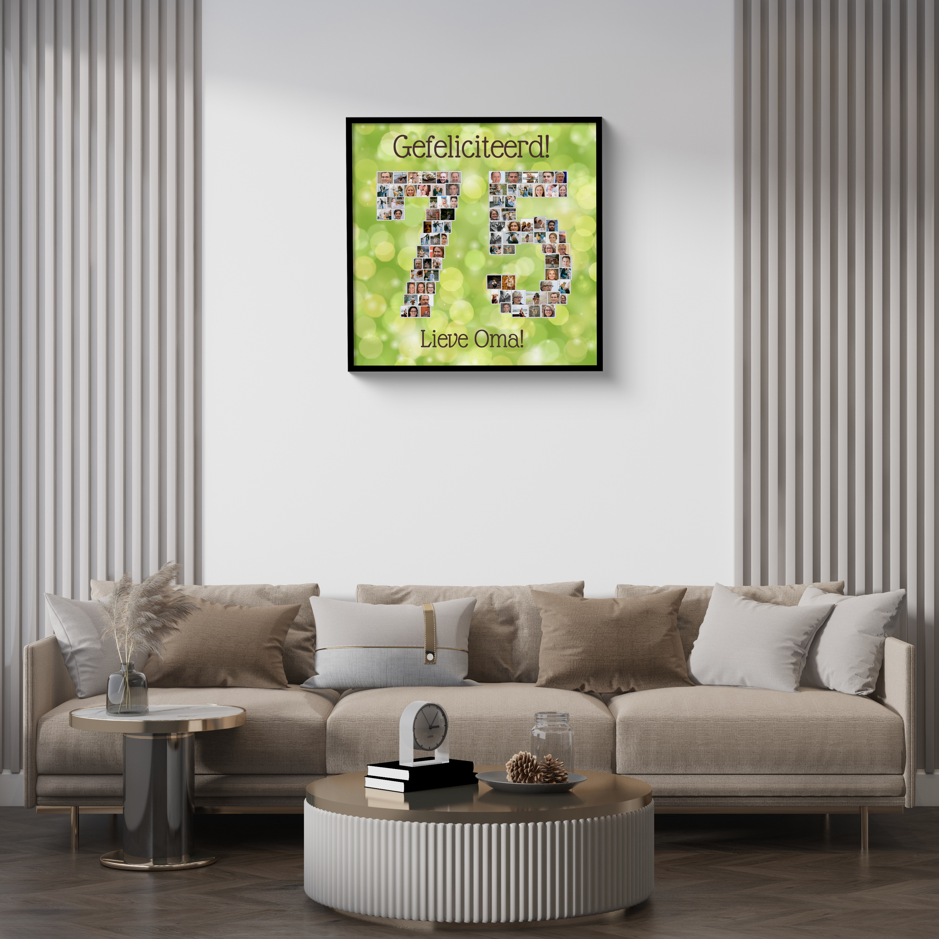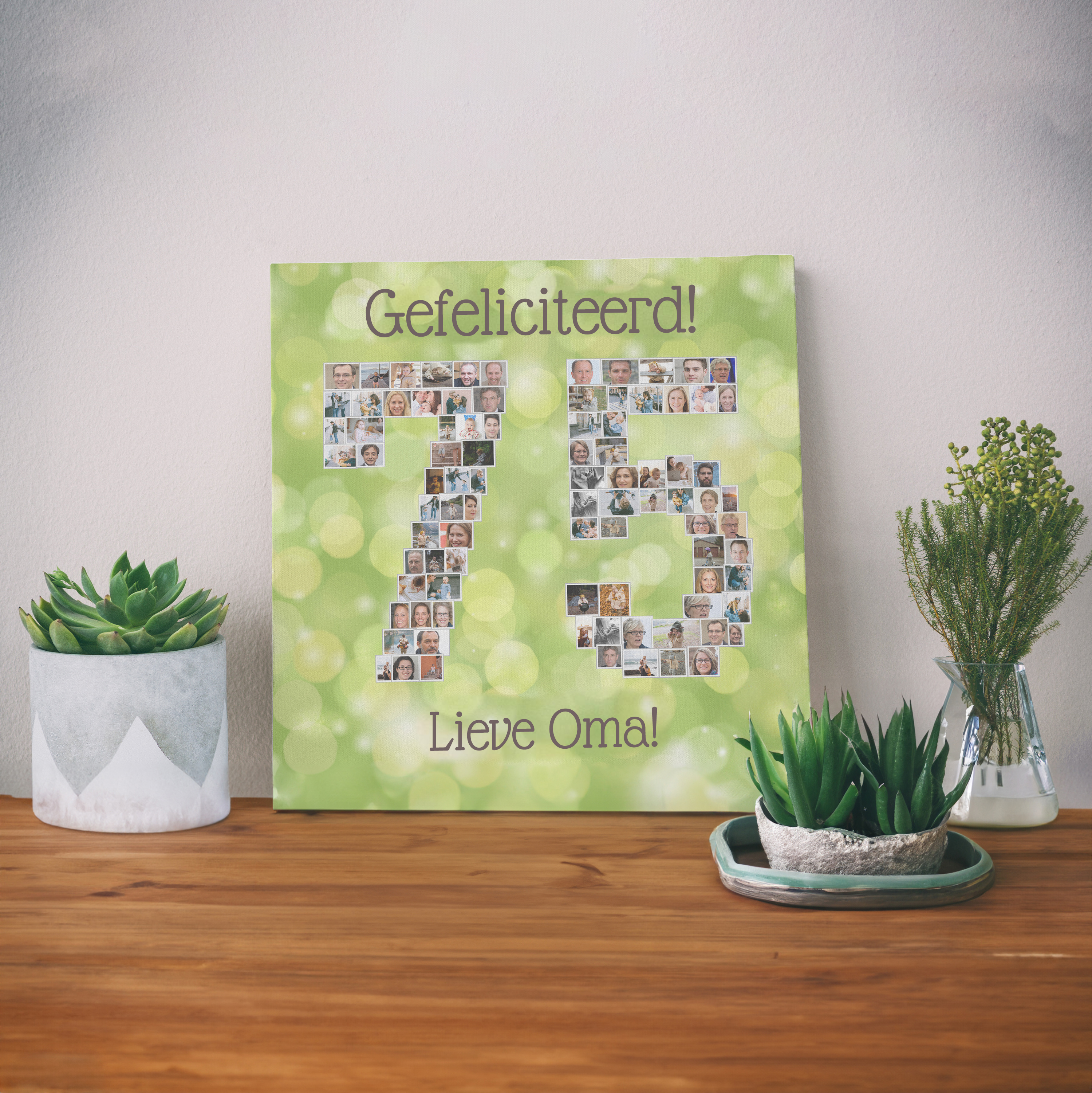 Ideeën genoeg: een 75 voor oma’s verjaardag, een 50 voor een gouden jubileum, een collage voor pensioen of housewarming, een lief moederdagcadeau, een mijlpaal voor een bruiloft of geboorte, of als blikvanger op een feest en later voor aan de muur.
