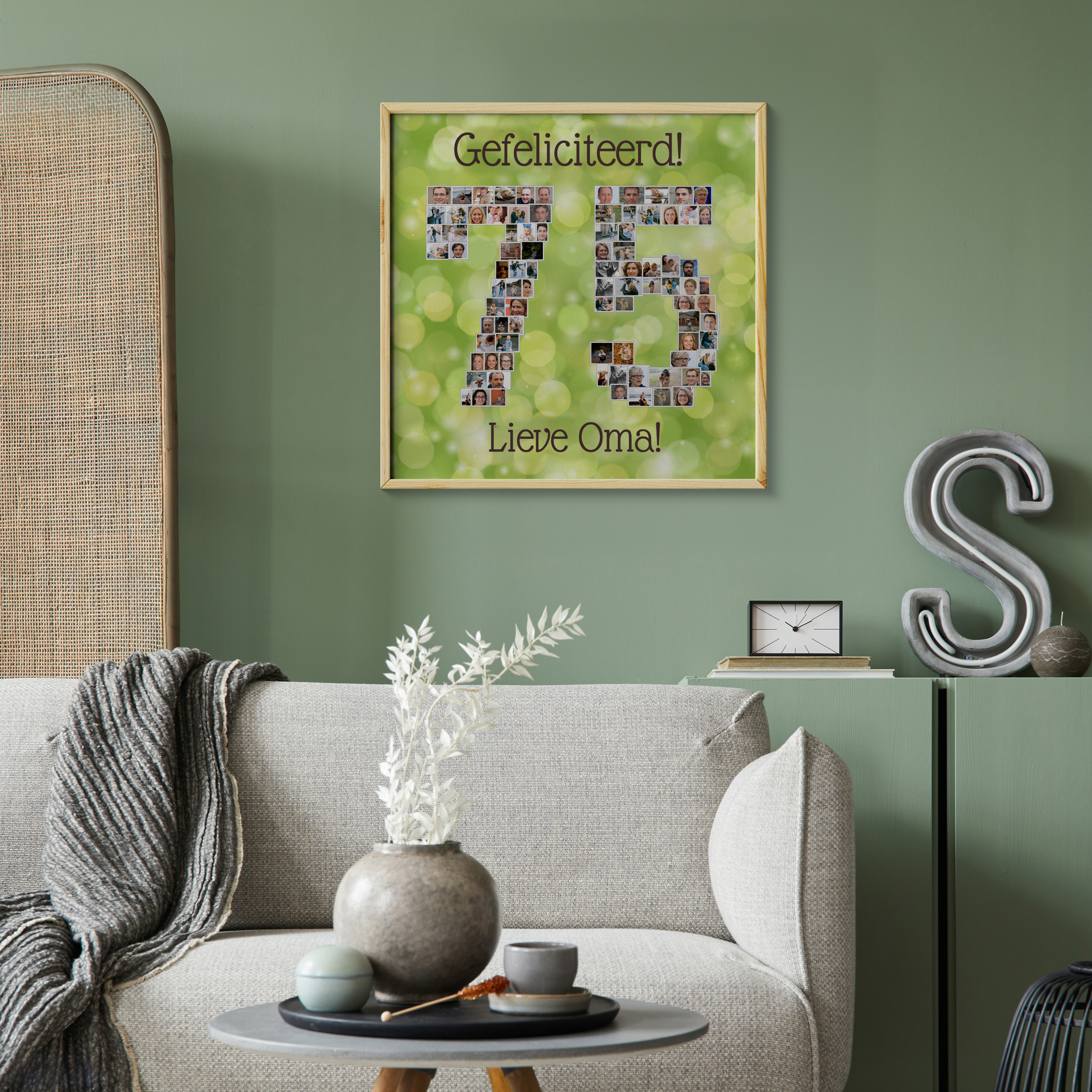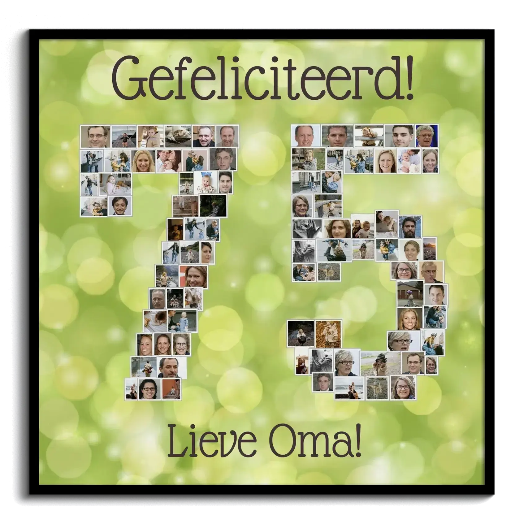 Fotocollage in de vorm 75 voor oma: cadeau, groene stijl, veel foto’s; tekst en kleuren aanpasbaar.