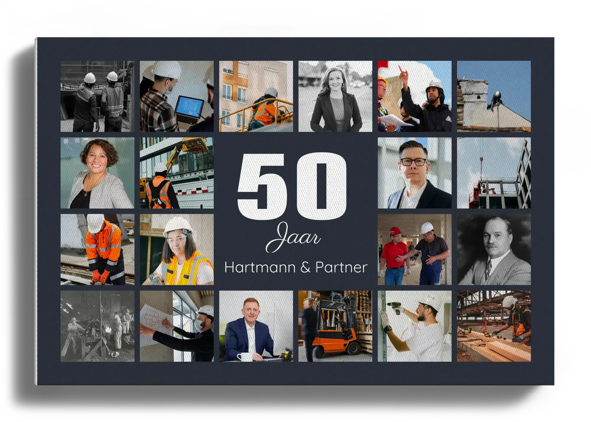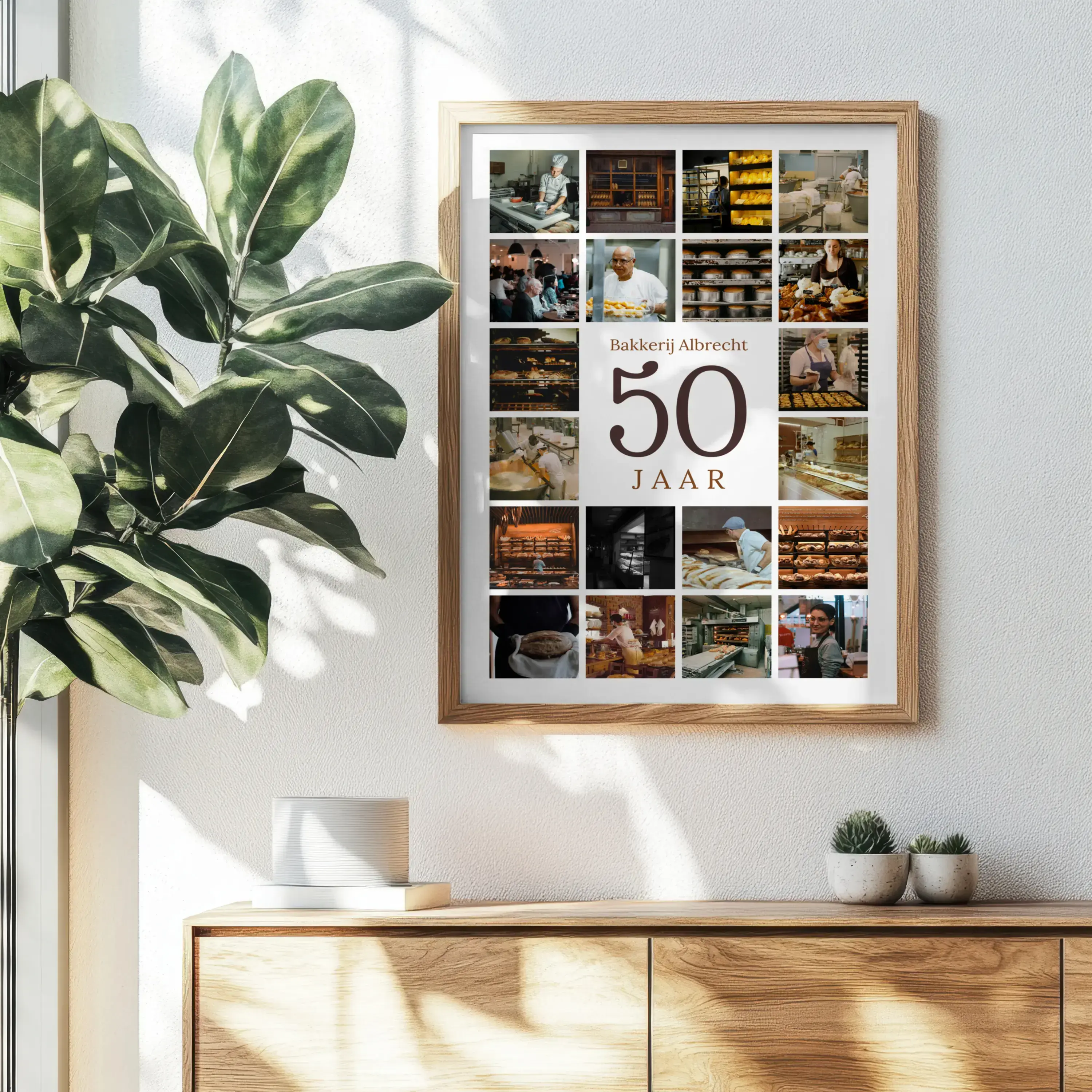 Bestel nu je jubileum-nummercollage voor het 50-jarig bedrijfsjubileum. In het midden staat een grote 50, daarboven plaats je de bedrijfsnaam en eronder een korte jubileum- of danktekst. Het geheel wordt omlijst door 20–80 foto’s in een strak, gelijkmatig raster.