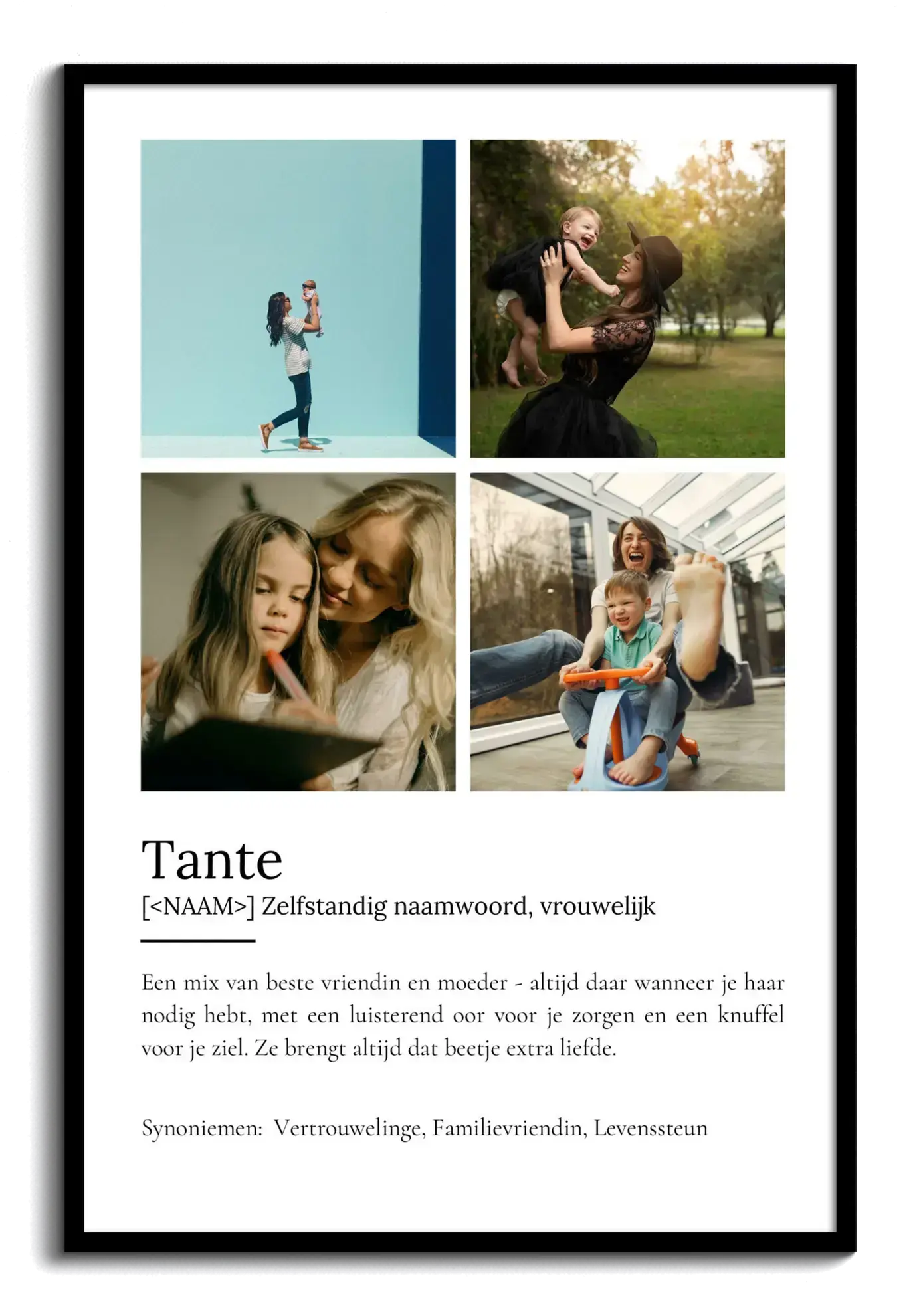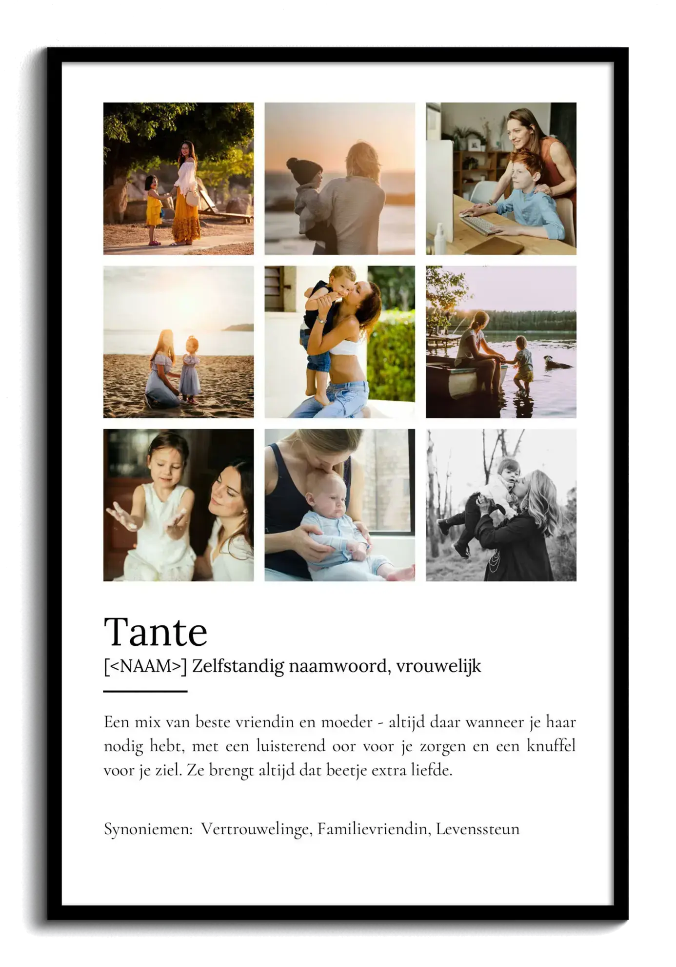 Stel je eigen Fotocollage samen als een uniek geschenk voor je geliefde tante. Dit personaliseerbare Definitions-Poster in Duden-stijl is speciaal ontworpen voor jouw tante en biedt ruimte voor maximaal 9 van je favoriete foto's. De teksten, kleuren en lay-out zijn helemaal aan te passen, zodat jij iets bijzonders kunt creëren: de perfecte mix van beste vriendin en moeder, altijd een luisterend oor en een warme knuffel.