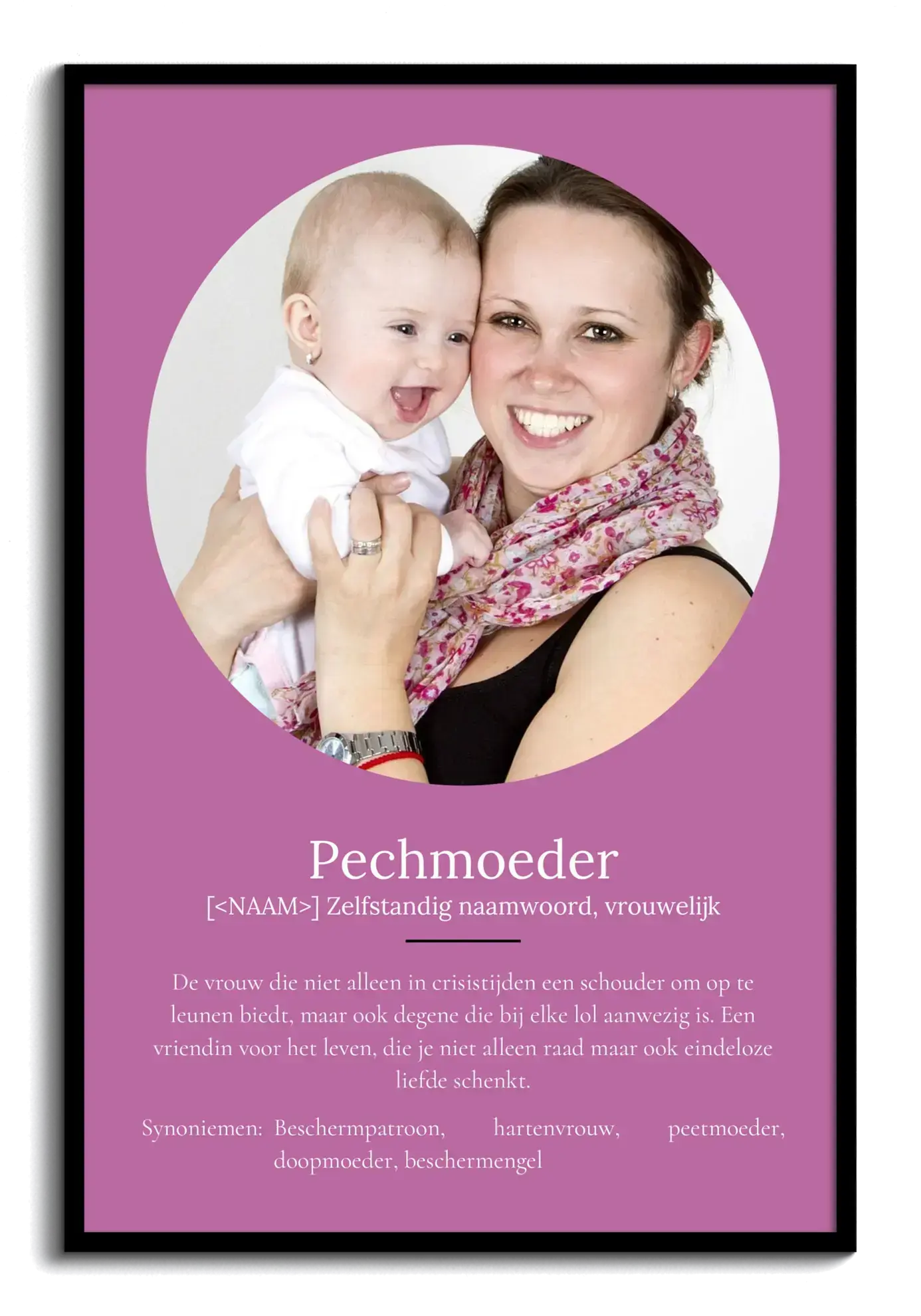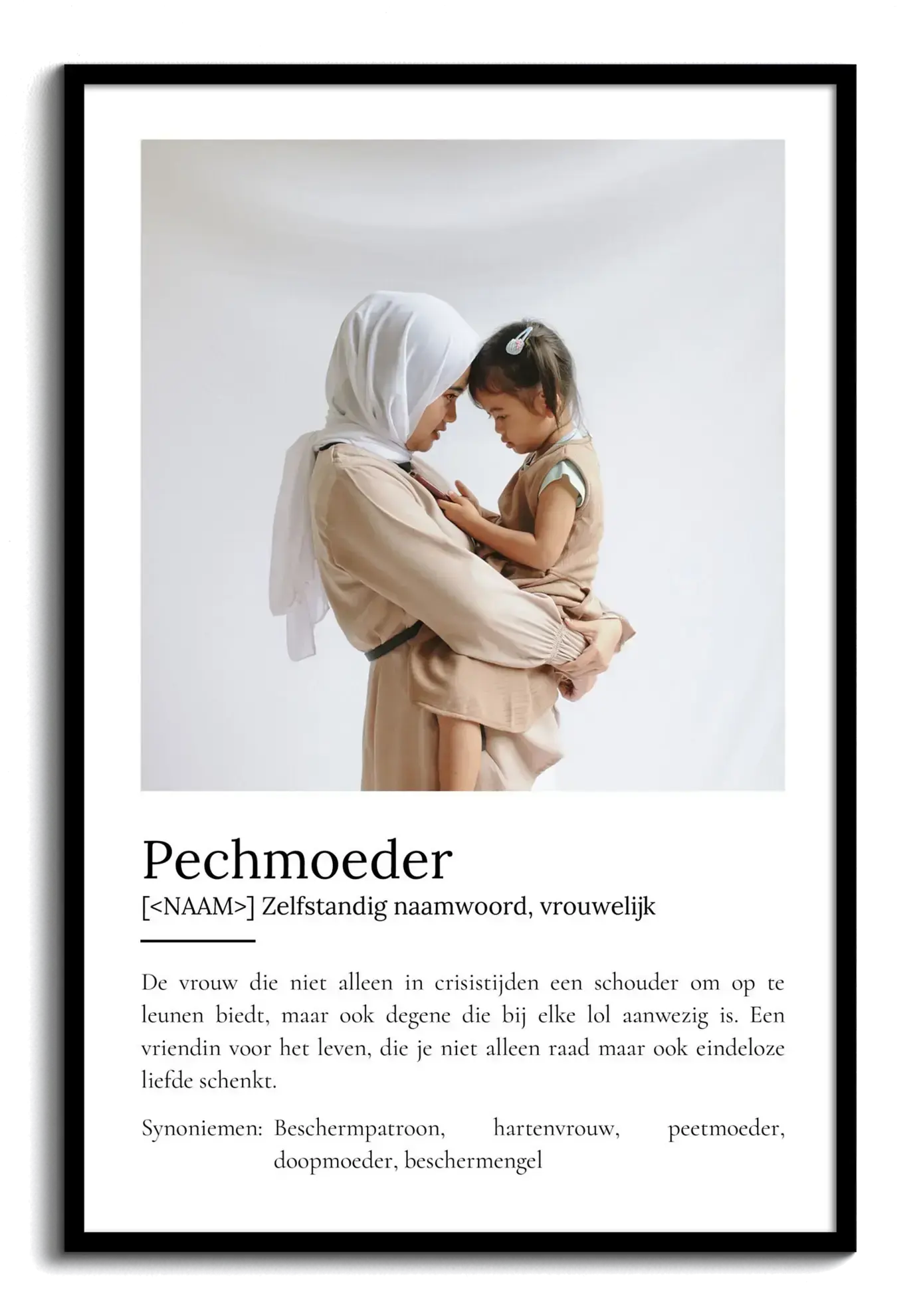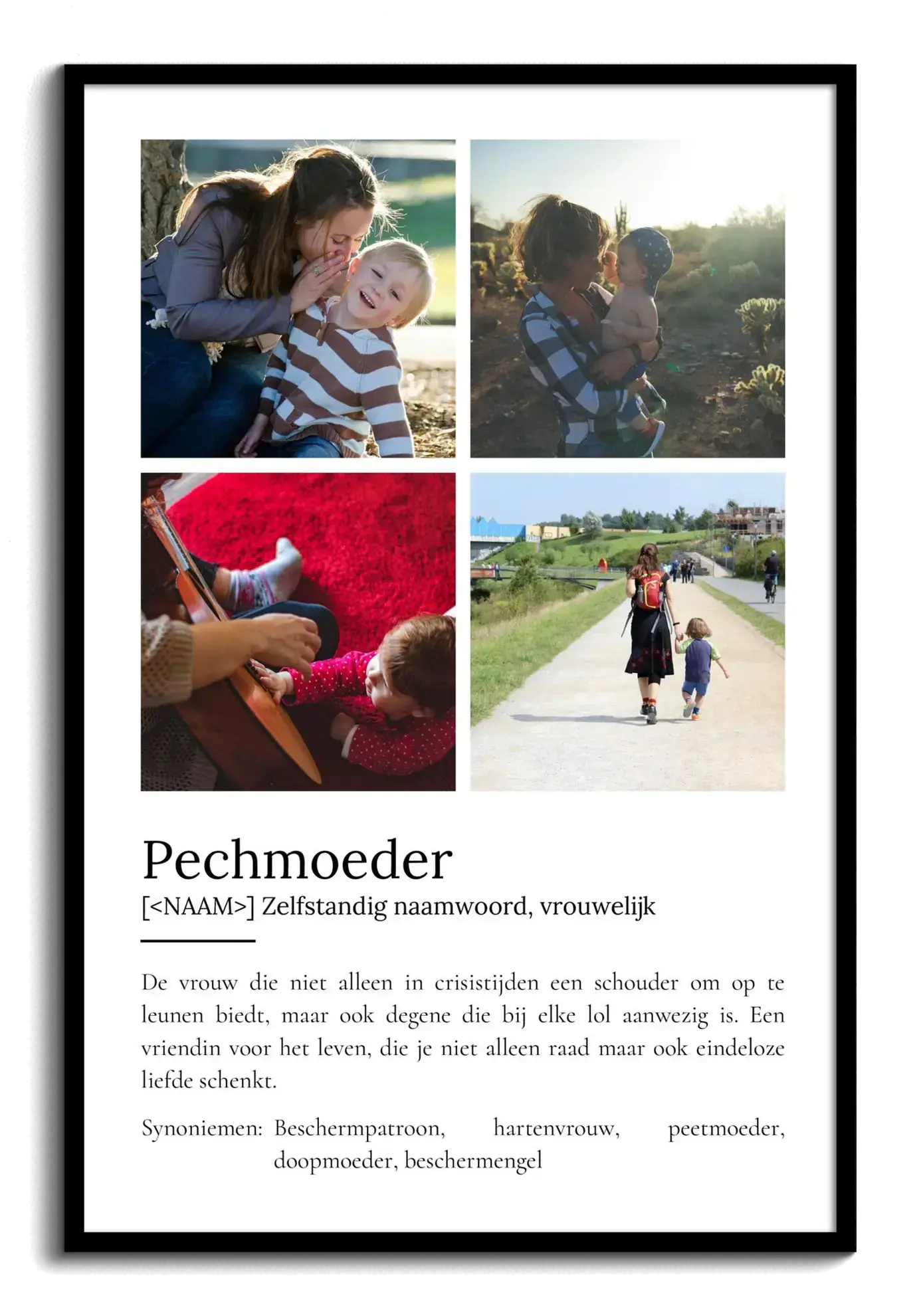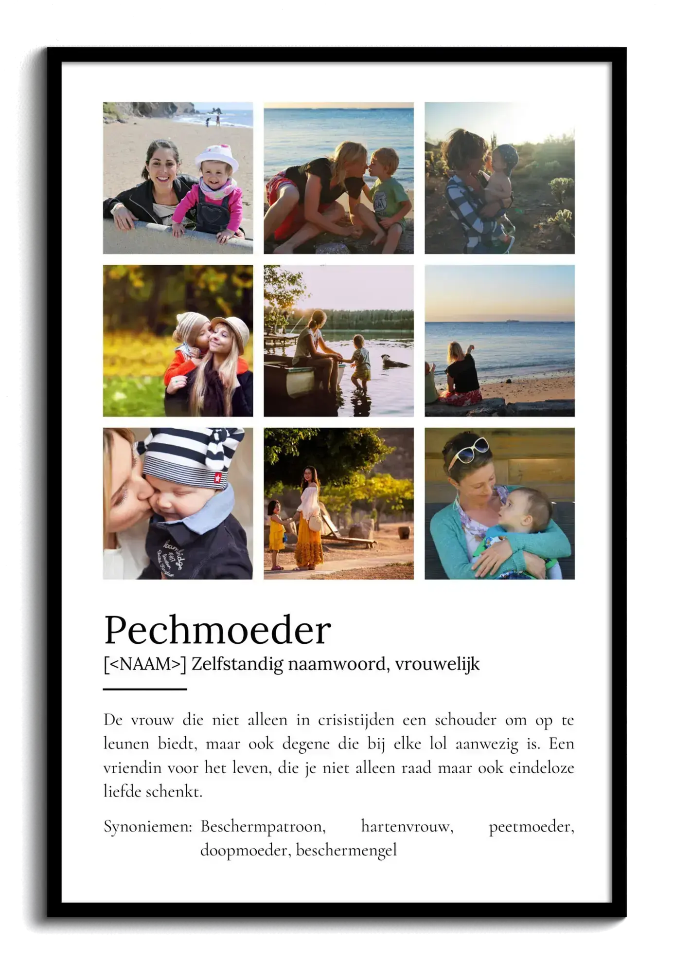 Ontdek de magie van jouw persoonlijke fotocollage! Stel je eens voor: een Definities-Poster 'Peettante' in de stijl van de Duden, speciaal voor die ene belangrijke vrouw in je leven. Voeg je eigen foto's toe of kies tot wel 9 afbeeldingen. Met een liefdevolle definitie eronder, die je kunt aanpassen naar wens. Perfect als uniek en waardevol cadeau.