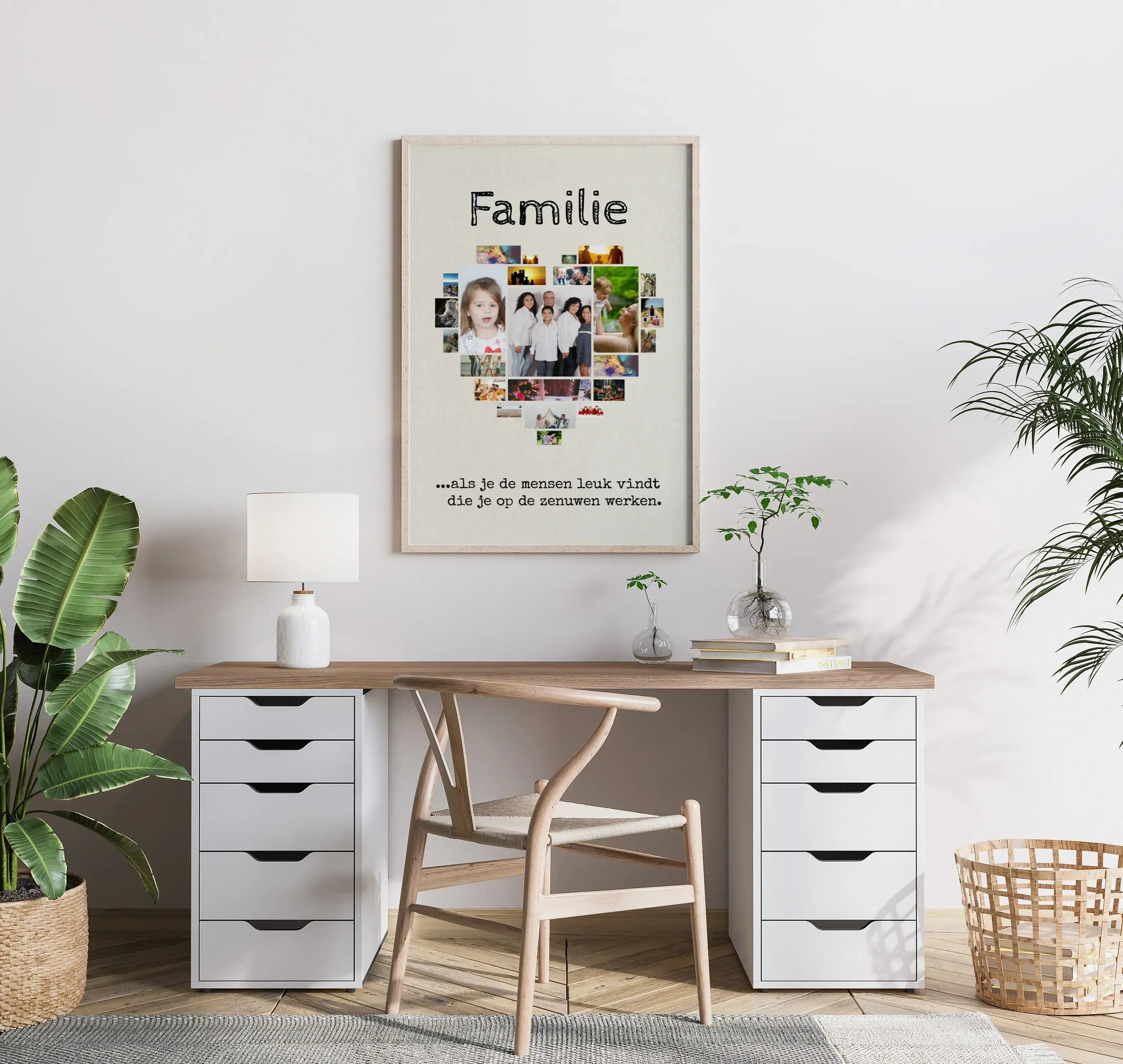 Maak je eigen unieke fotocollage en vereeuwig mooie momenten met je dierbaren. Stel je eens voor: een hartvormige collage gevuld met warme familiefoto's, met daarboven het woord Familie en daaronder de speelse zin "als je van de mensen houdt die je irriteren". Perfect voor het geven van een persoonlijk tintje aan je woonkamer of als attent cadeau voor je familie. Alle teksten en grappige uitspraken kunnen volledig gepersonaliseerd worden om precies bij jouw herinneringen te passen.