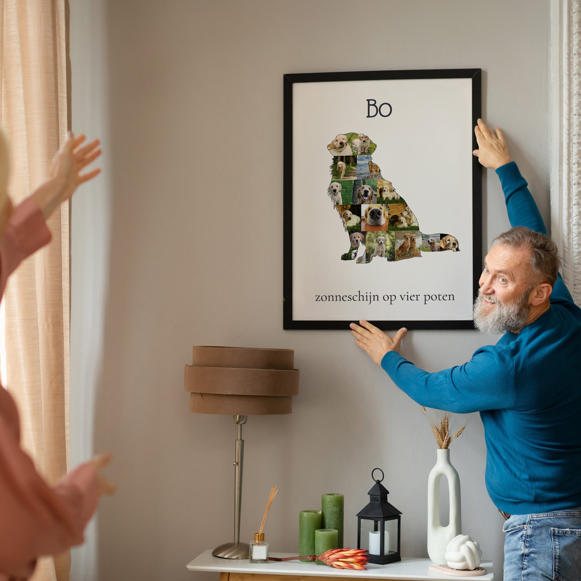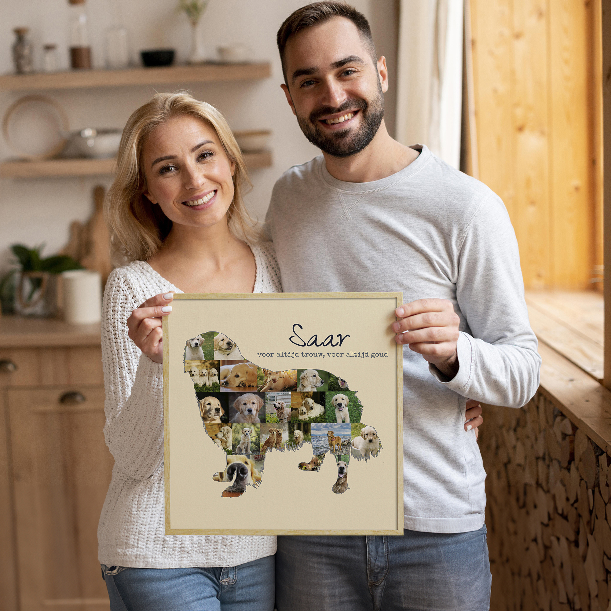 Ontdek de magie van een gepersonaliseerde fotocollage van jouw geliefde Golden Retriever. Met dit unieke product kun je maar liefst 15-20 van je favoriete foto's in de vorm van een zittende of staande Golden Retriever-silhouet plaatsen. Voeg daarbij een persoonlijke tekst toe, zoals 'ewig treu, ewig gold' of 'Sonnenschein auf 4 Pfoten', en creëer een prachtige herinnering die je huis siert of als speciaal cadeau voor vrienden of familie dient.