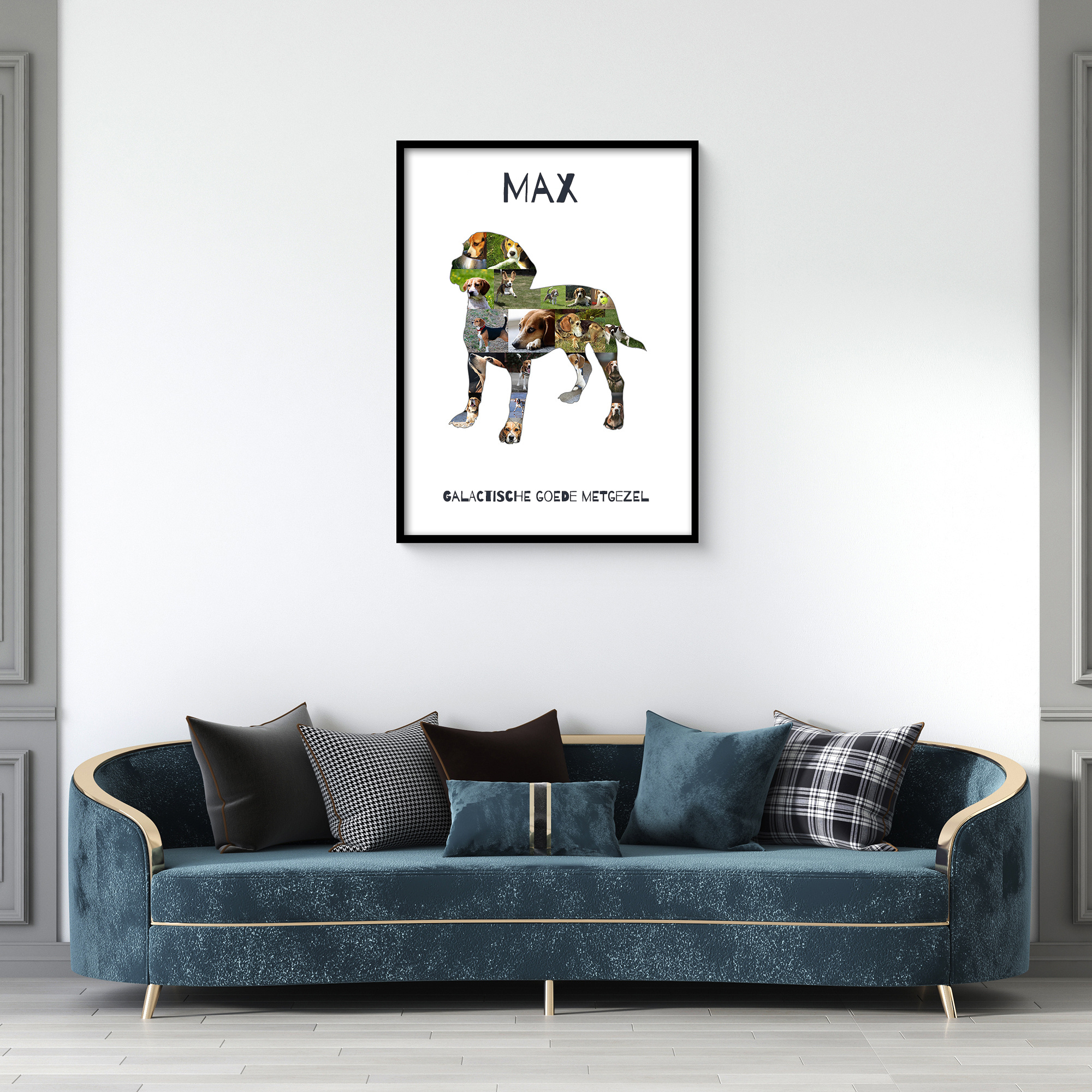Ontwerp je eigen unieke fotocollage en breng je liefde voor je viervoeter tot leven met onze speciaal ontworpen Beagle-silhouette fotocollage. Vul de vorm met 15-20 van je eigen foto's en voeg een persoonlijke tekst toe zoals hier: galaktisch goede vriend. Het is een ideale manier voor hondenliefhebbers om een creatieve herinnering aan hun trouwe metgezel te maken.