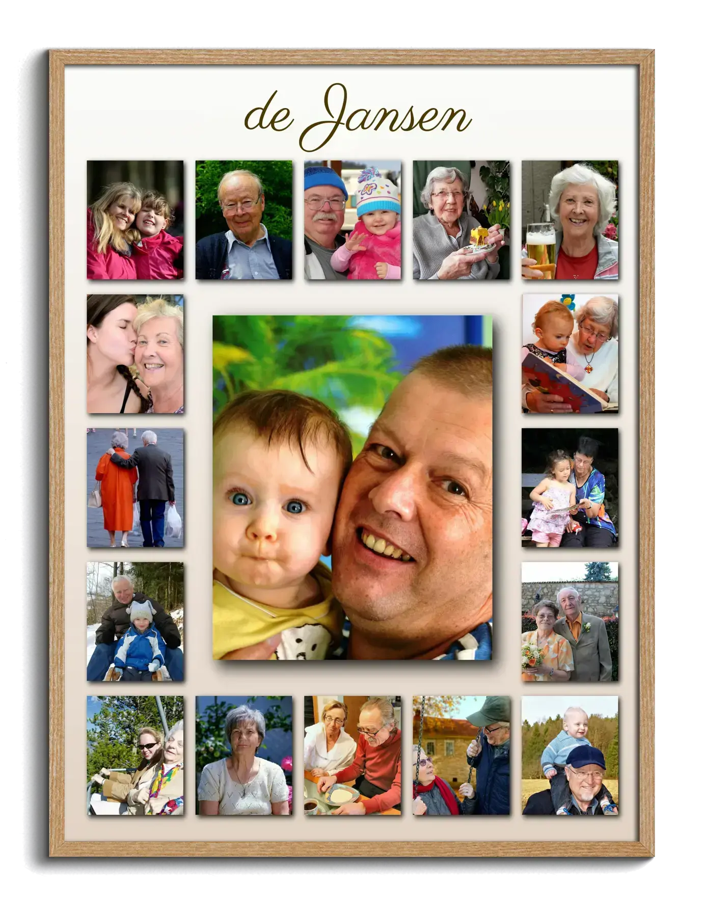 Familiecollage met grote foto centraal, omlijst door kleinere foto's en aangepaste tekst.