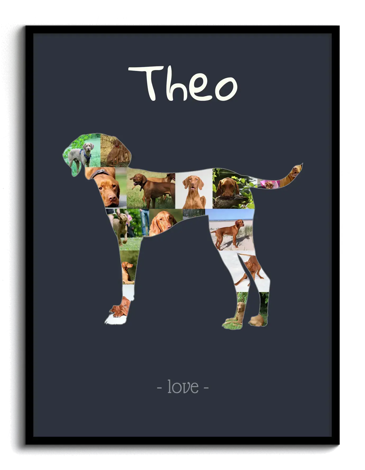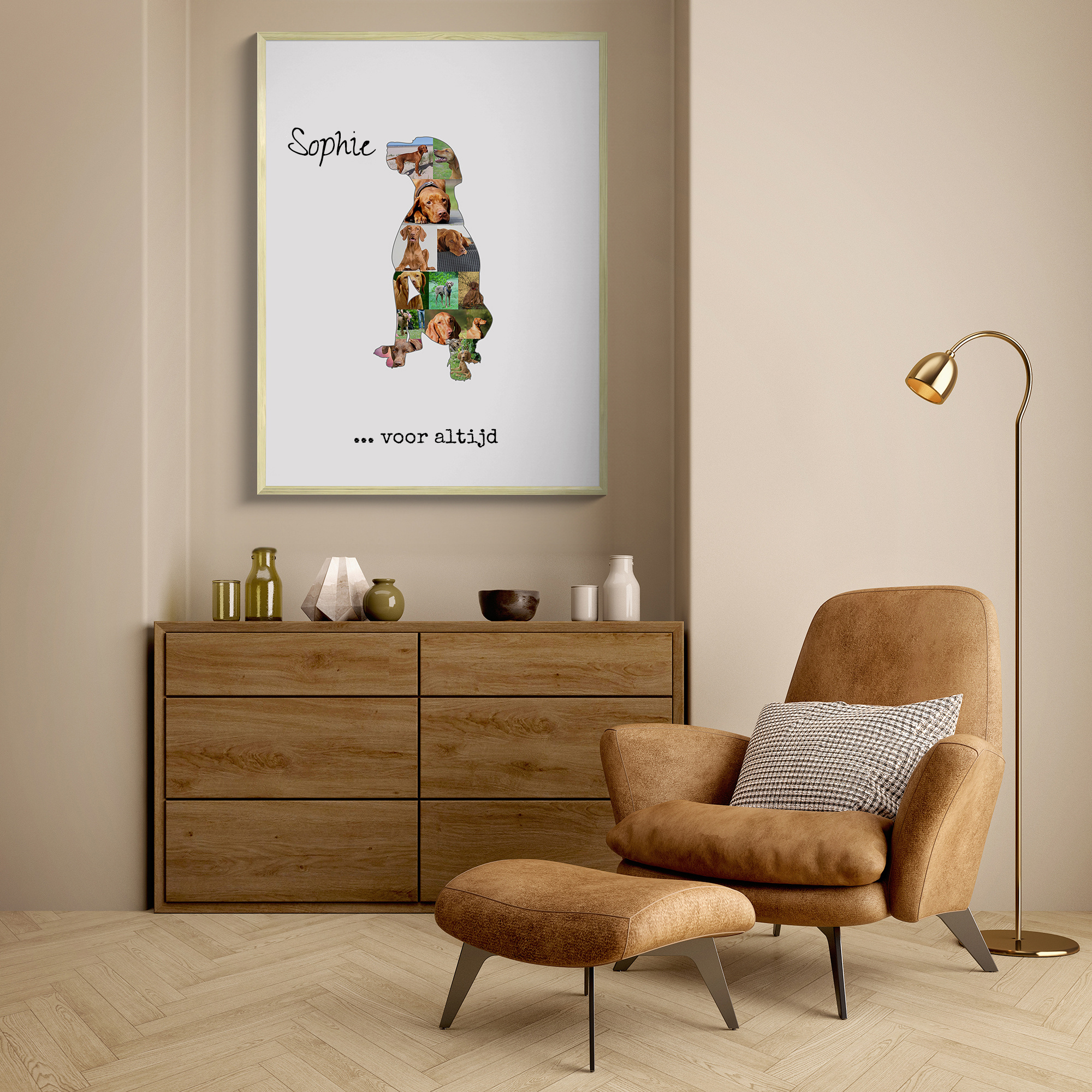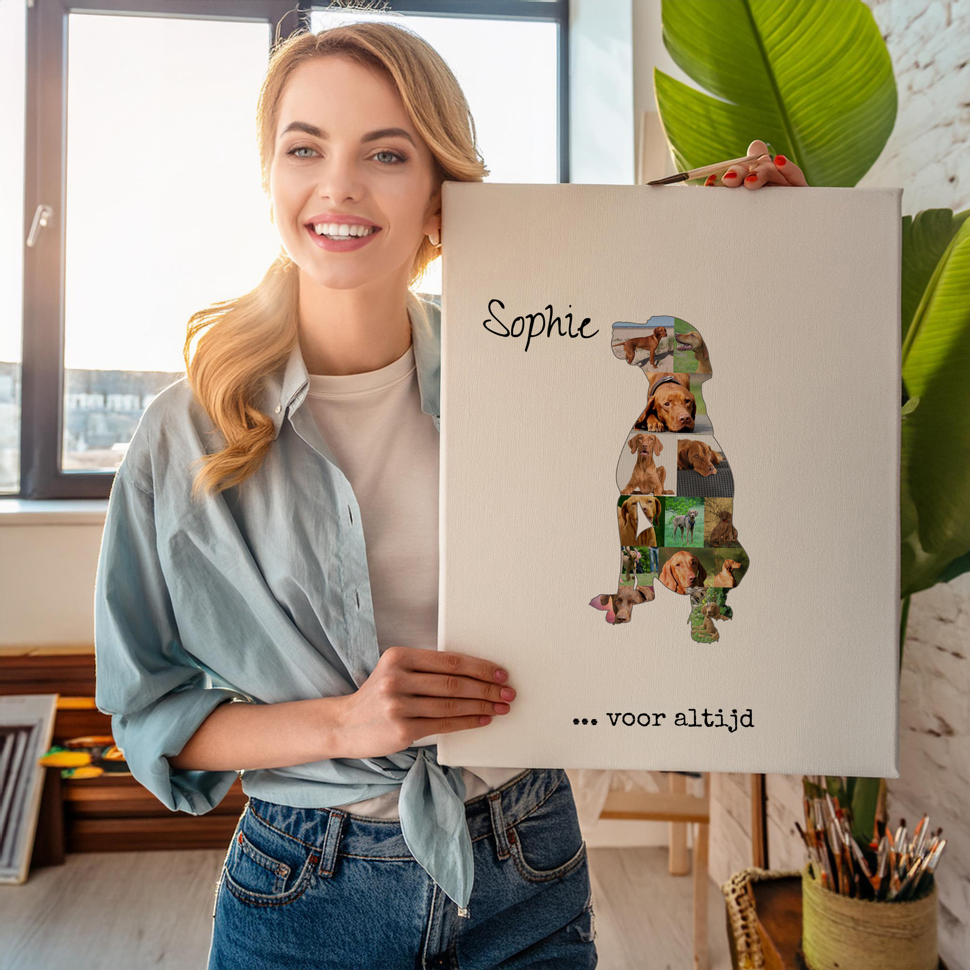 Ontwerp jouw eigen gepersonaliseerde fotocollage! Voor hondenliefhebbers hebben we een unieke optie: een collage in de vorm van een Magyar Vizsla-silhouet, gevuld met 15-20 van jouw favoriete foto's van je trouwe viervoeter. Voeg een persoonlijke boodschap toe zoals "voor altijd" of "liefde". Een prachtig herinneringsstuk voor je huis of een bijzonder cadeau voor vrienden en familie.