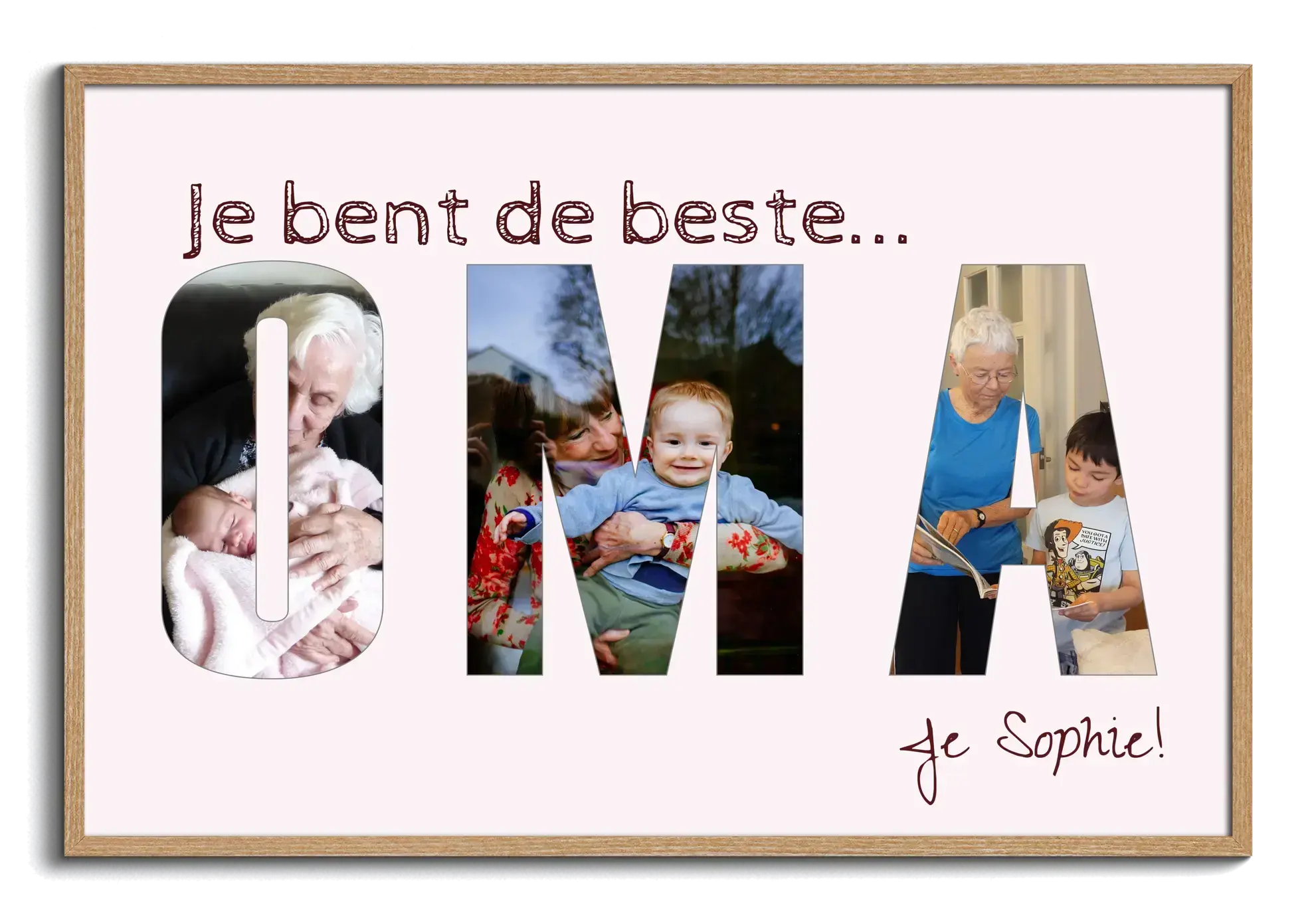 Maak nu je persoonlijke cadeau. In dit voorbeeld vormt het woord OMA zich uit 13 foto’s op een lichte achtergrond. Je ziet lieve momenten van oma met haar kleinkinderen, aangevuld met een voorbeeldtekst: Je bent de beste. Jouw Klara. Een uniek idee voor verjaardagen of andere speciale gelegenheden.