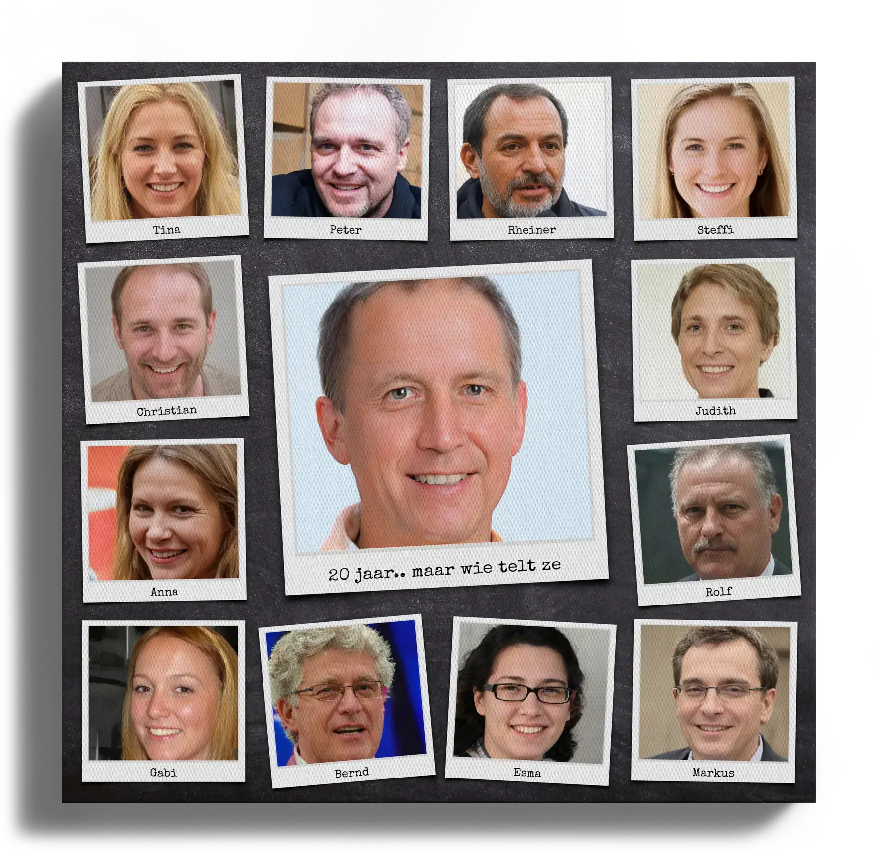 Ontwerp je eigen unieke fotocollage en maak een blijvende herinnering. Deze Polaroid-stijl collage is perfect als een afscheidsgeschenk bij een jubileum of pensioen. Personaliseer met foto's van dierbare momenten, inclusief namen en een centraal, groot foto met de tekst: "20 jaar... maar wie telt nou echt?".
