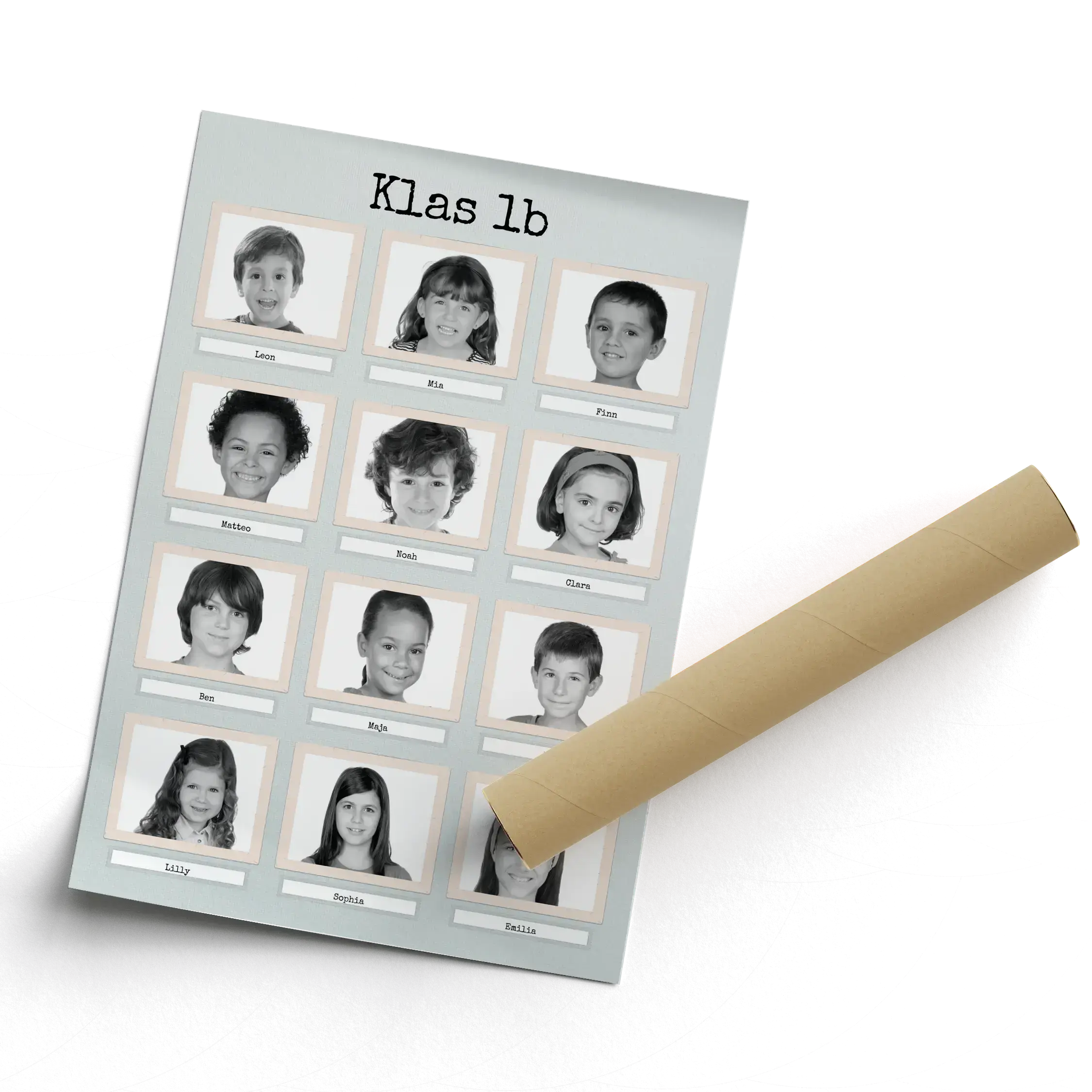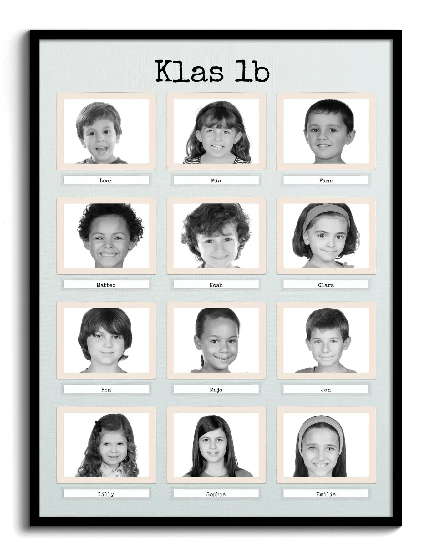 Ontwerp nu je eigen unieke fotocollage met onze gebruiksvriendelijke web-app! Maak een blijvende herinnering met de zwart-wit retro stijl collage, perfect voor het vastleggen van de 12 kinderen uit de schoolklas of kleutergroep. Voeg persoonlijke details toe zoals de namen van de kinderen en tekst boven- en onderaan zoals "Klasse 1b". Dit is een ideaal cadeau voor leraren, kinderverzorg(st)er en een mooie herinnering voor ouders.