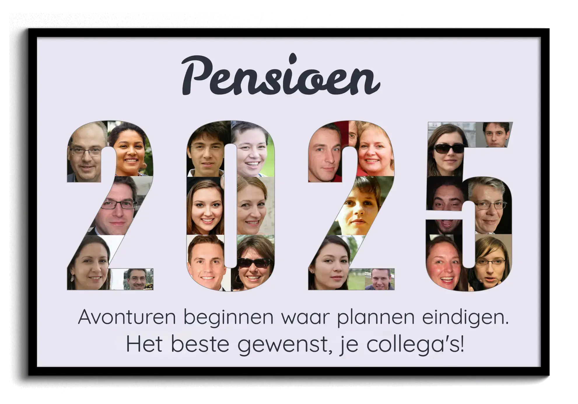 Creëer een blijvende herinnering met onze personaliseerbare fotocollage. Speciaal ontworpen voor een afscheid in de vorm van het jaar van pensioen. Vul de cijfers met foto's van collega's en voeg bovenaan de tekst "Pensioen" toe. Onder de jaarcijfers kan een wens worden toegevoegd zoals "Avonturen beginnen waar plannen eindigen. Veel succes, je collega's". Ideaal als afscheidscadeau, met mogelijkheden om teksten volledig naar wens aan te passen.