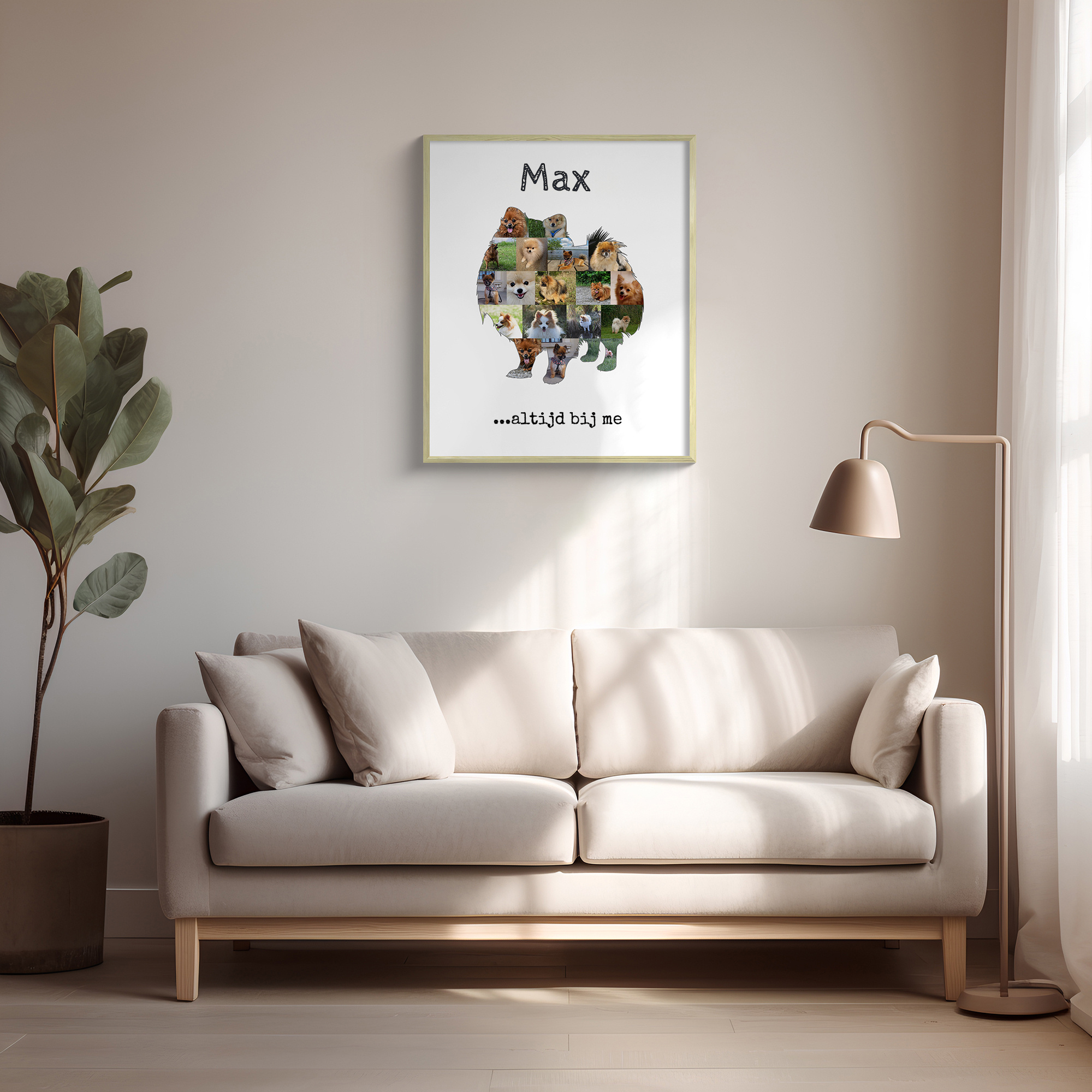 Maak een prachtige fotocollage van je trouwe viervoeter met onze speciaal ontworpen Zwergspitz-silhouetten. Vul de vorm met 15-20 van je favoriete foto's en voeg een persoonlijke tekst toe zoals 'altijd dichtbij' of 'pluizig, energiek, aanhankelijk'. Een perfect aandenken of cadeau voor elke hondenliefhebber.
