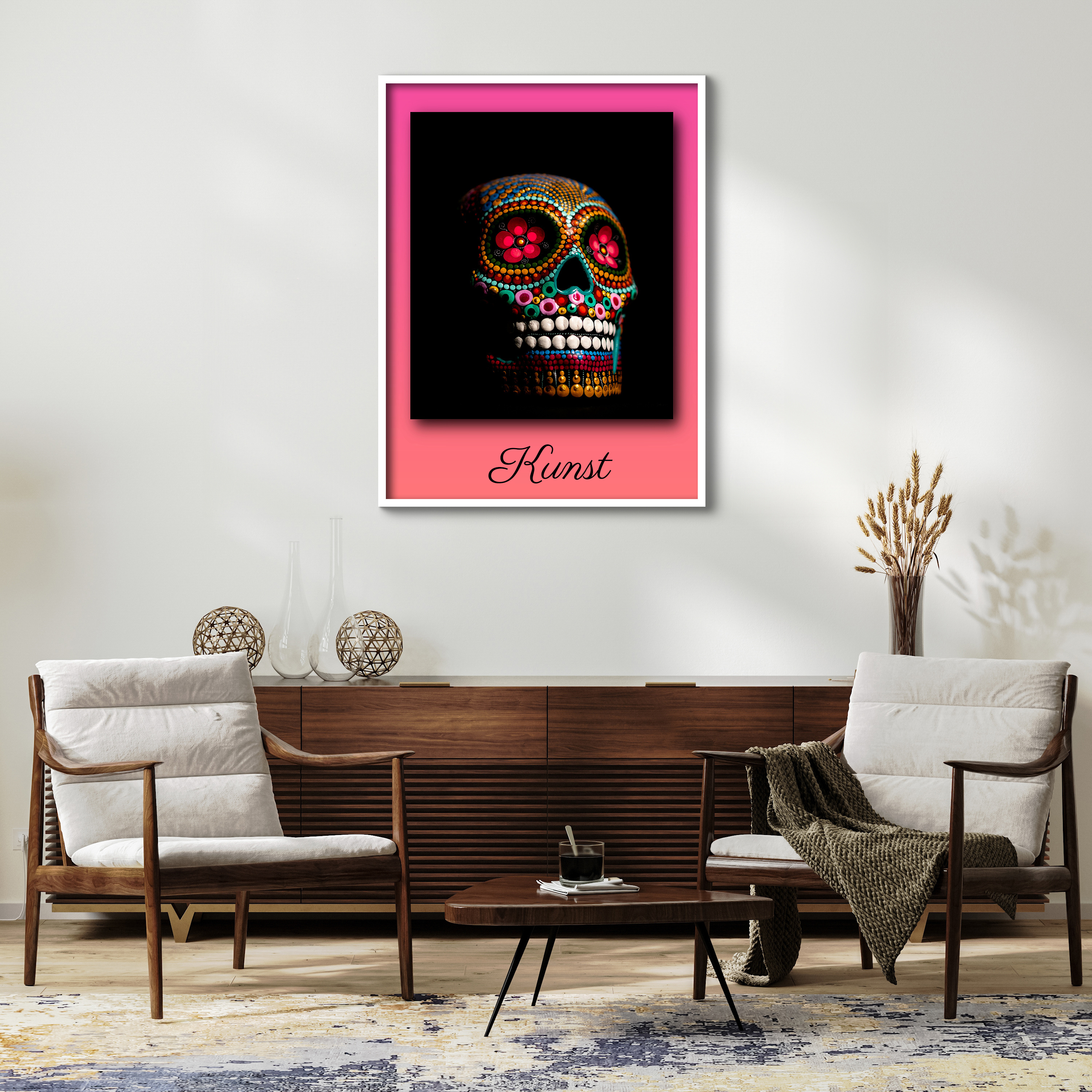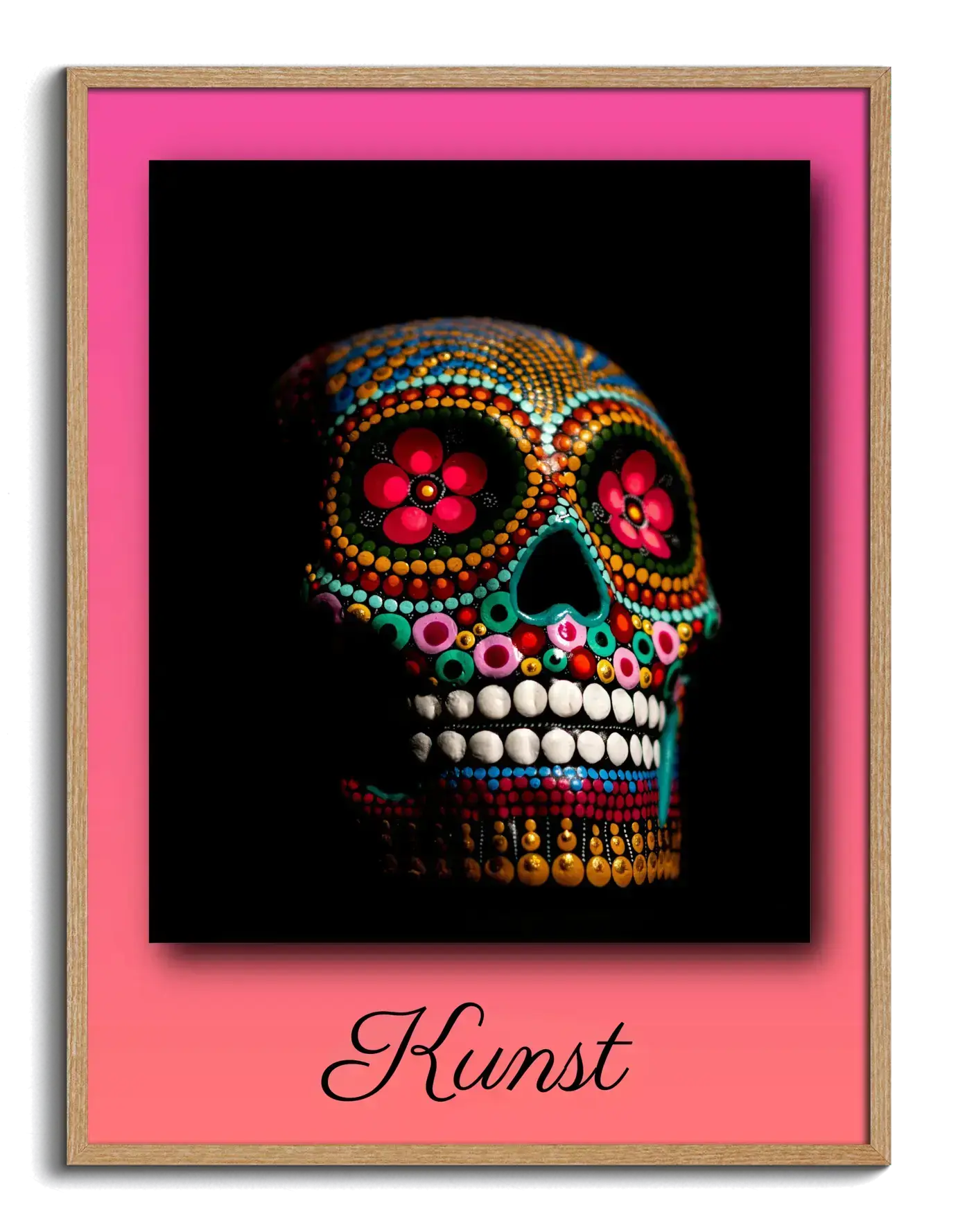 Uniek fotoposter met kleurrijke schedel en 'Kunst'. Perfect voor kunstliefhebbers en creatieve geesten.