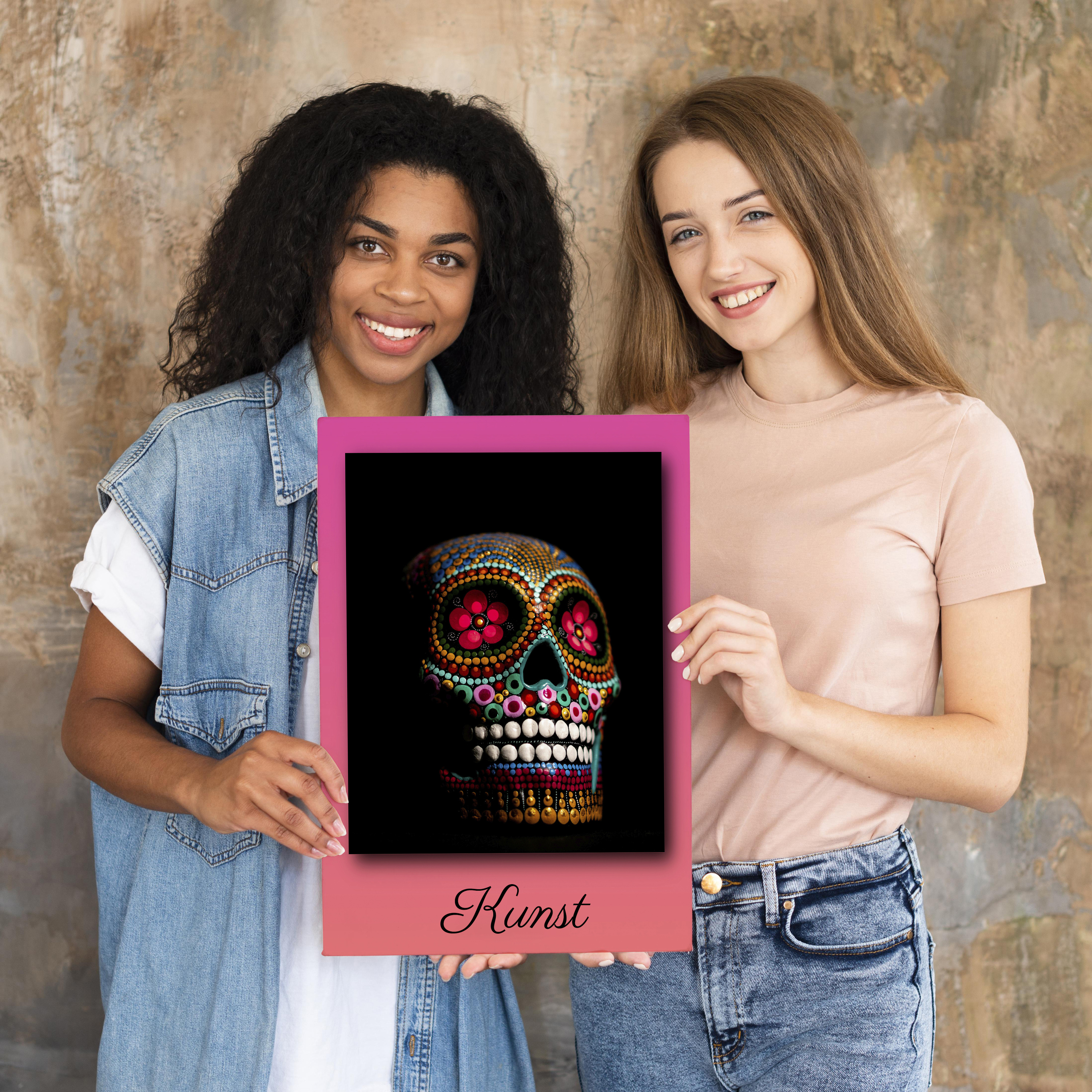 Ontwerp je unieke fotocollage en breng je herinneringen tot leven met onze personaliseerbare fotoposters. Of je nu een kunstliefhebber bent of een creatief geschenk voor je vrienden zoekt, dit kleurrijke "Kunst" poster met een opvallende schedelontwerp biedt eindeloze mogelijkheden. Voeg je eigen foto en tekst toe en creëer een bijzondere decoratie voor je huis.