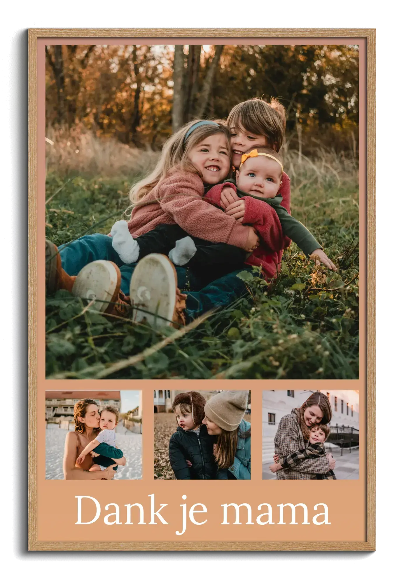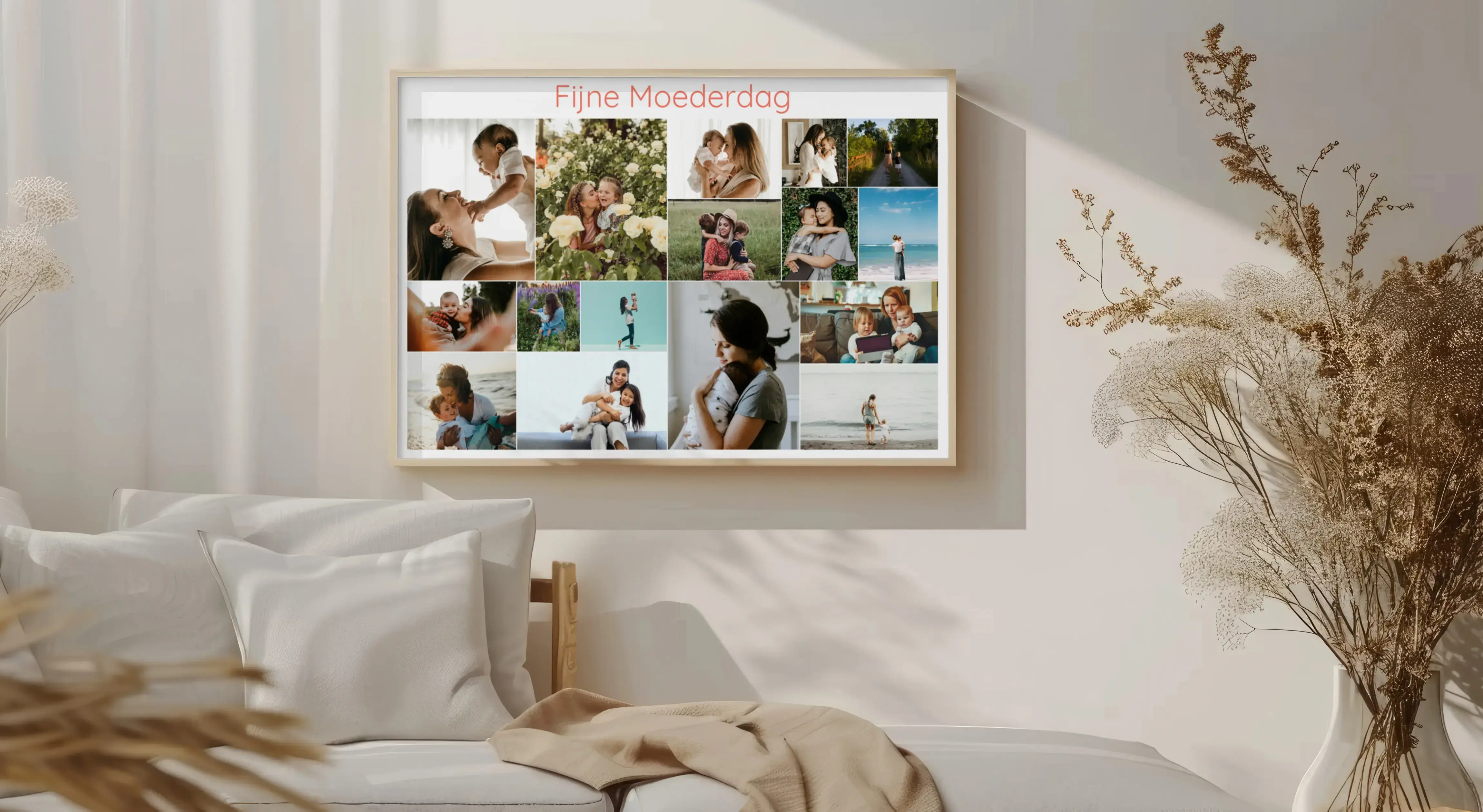 Maak en bestel nu je persoonlijke kunstprint voor Moederdag of Vaderdag: verzamel favoriete momenten van de kinderen en kleinkinderen in één ontwerp, kies uit hart-, raster- of tekstsjablonen en voeg een eigen boodschap toe zoals Alles liefs met Moederdag of Dank je, mama.