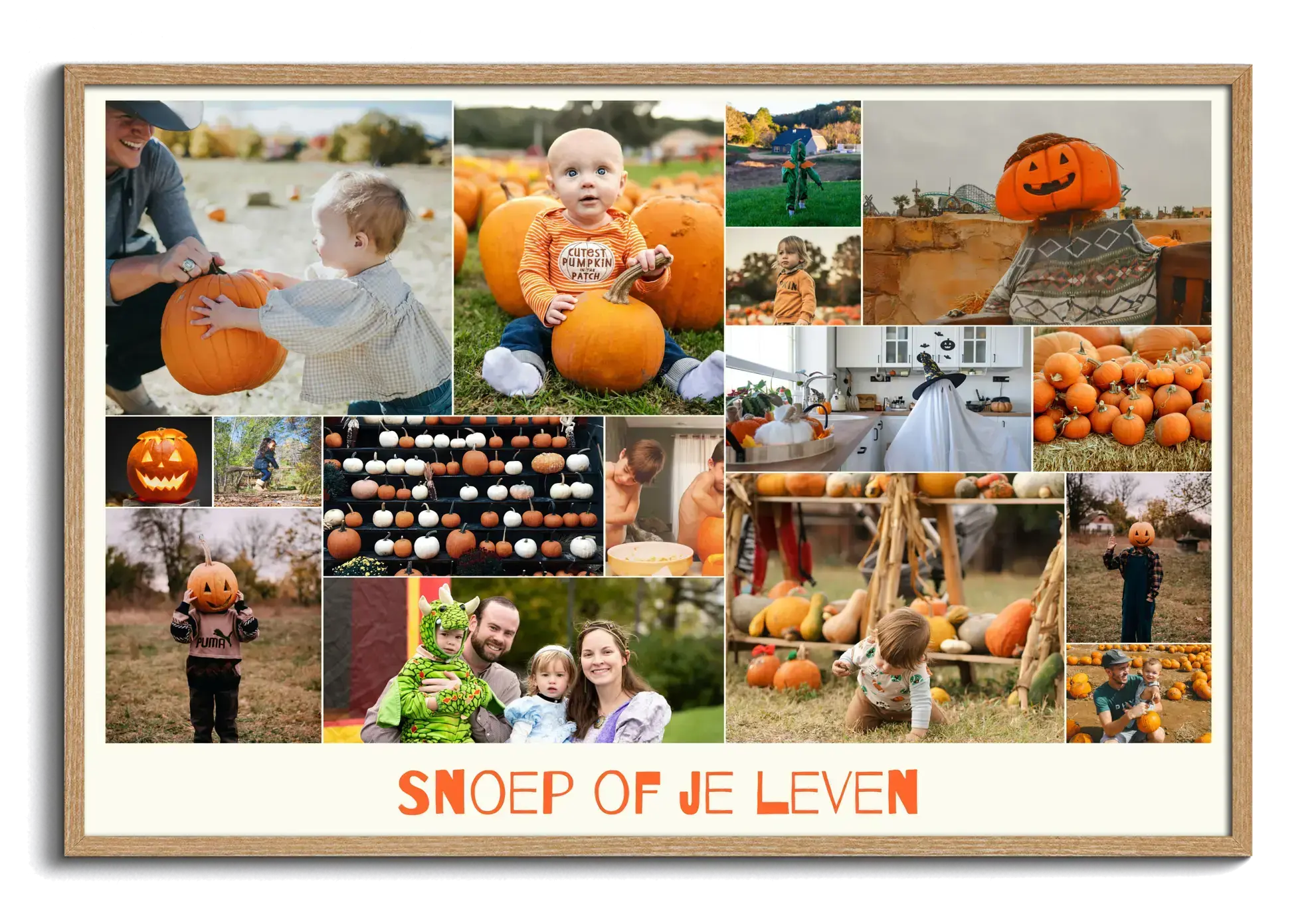 Breng je kostbare herinneringen tot leven en creëer je eigen unieke fotocollage met aandacht voor elk detail. Stel je familie in hun Halloween-kostuums voor, omringd door decoratieve pompoenen. Voeg persoonlijke teksten toe zoals 'Snoep of Je Leven!' en maak van je collage een onvergetelijke eyecatcher passend bij deze sfeervolle tijd.